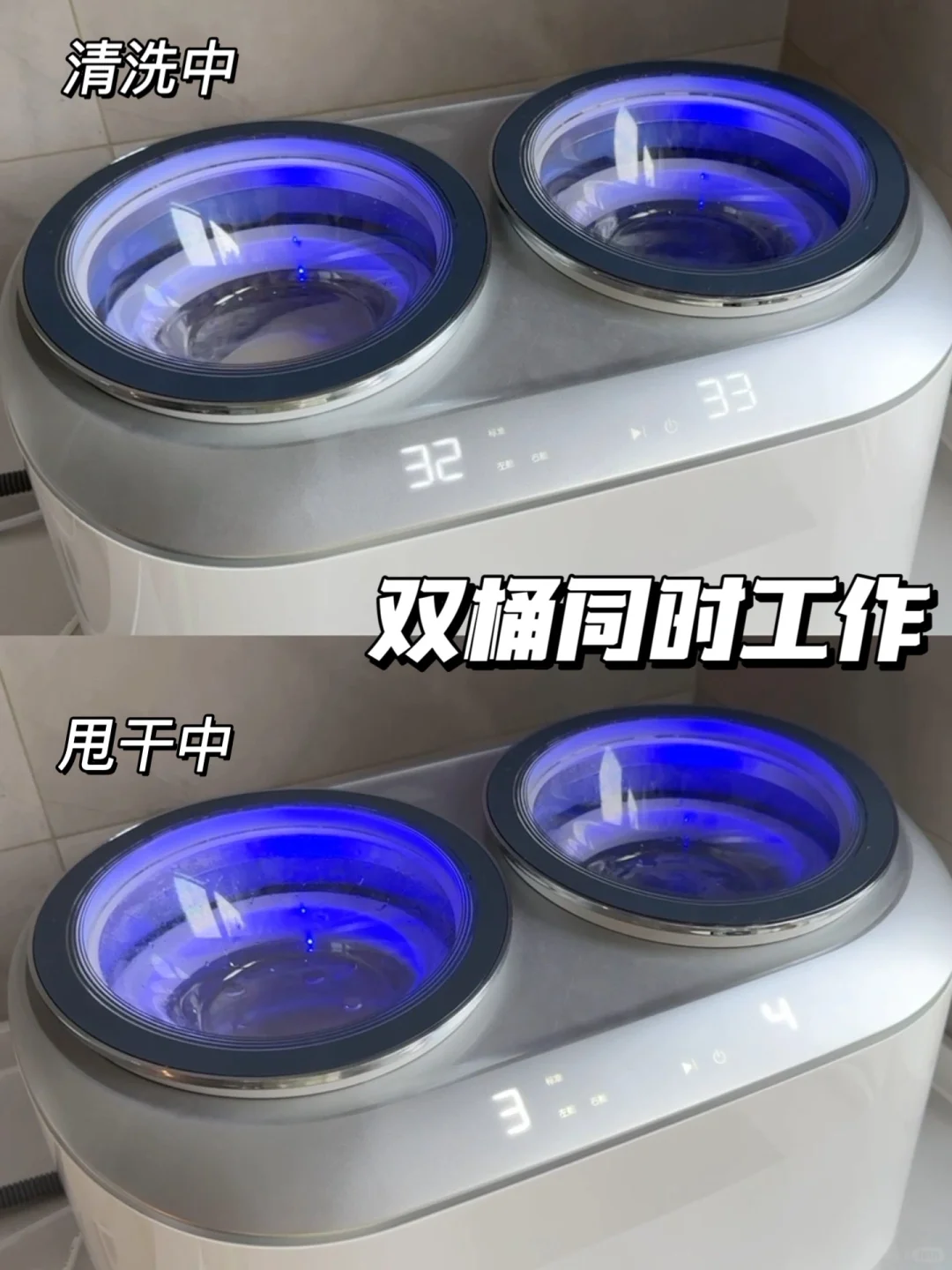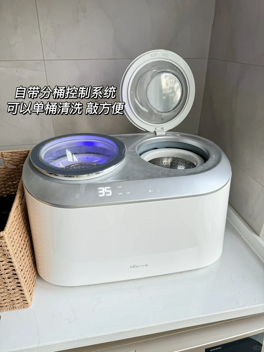 首先就是它的双桶设计,大人小孩能分开洗,它的两个舱都是4L,娃的衣服也能放进去洗,丢进去一次洗两锅真的省事~