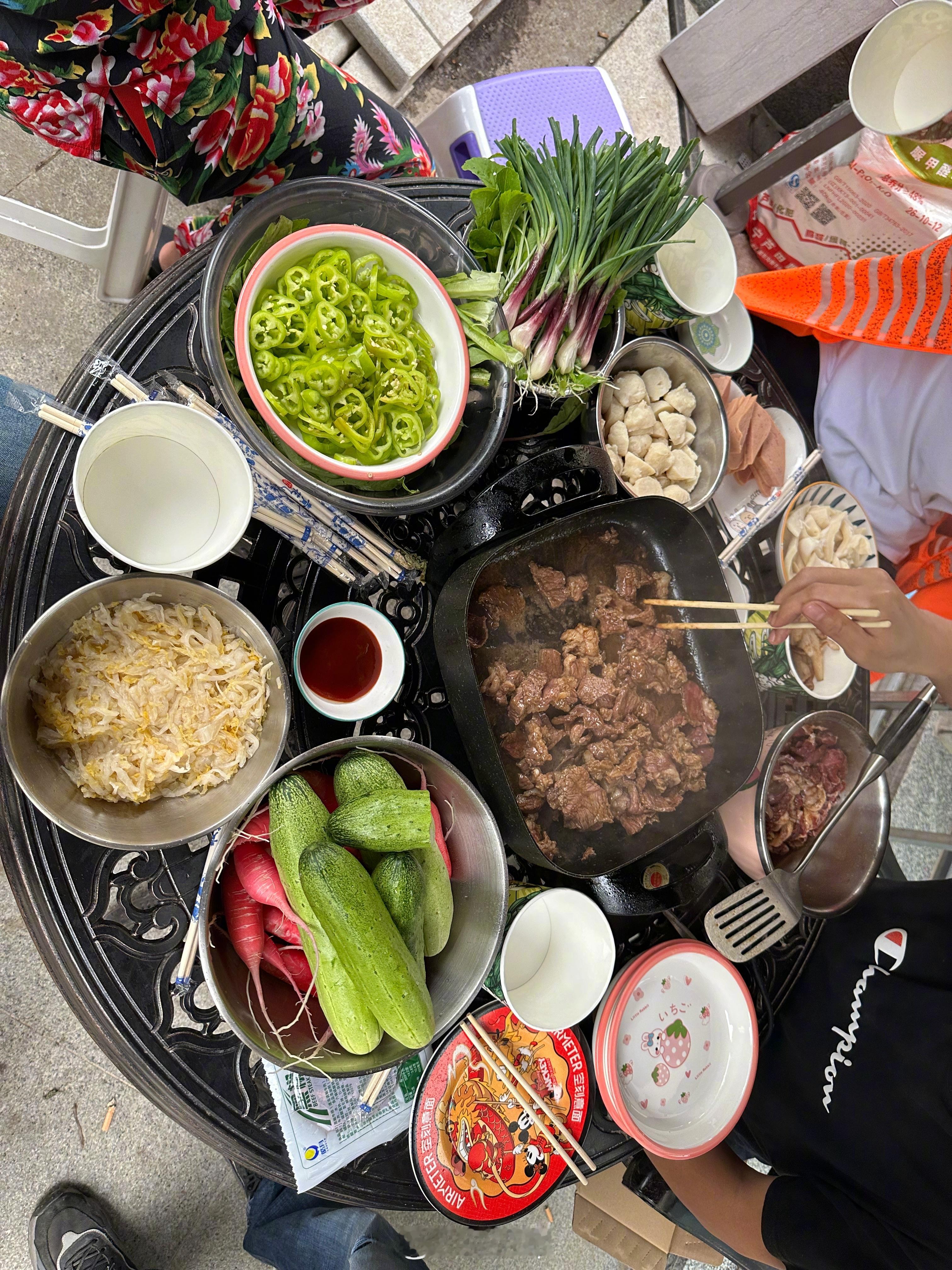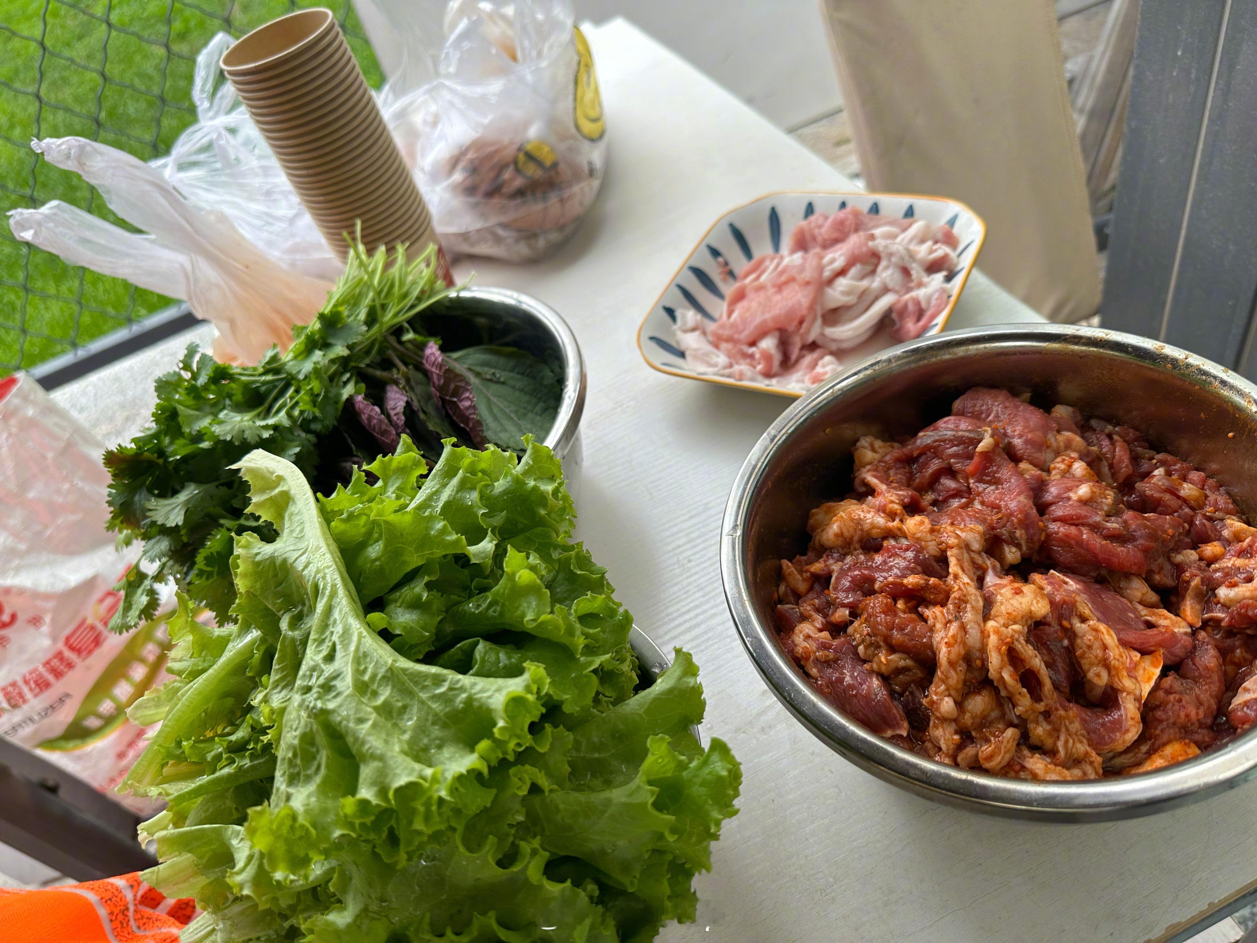 天气略阴,风凉,小院里整点烤肉,惬意!都是自己家种得菜,纯绿色