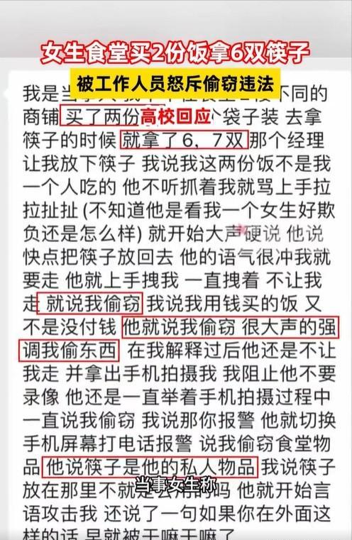 “网友:学校的抠门程度属实罕见!"福建厦门,一女学生在食堂打包了两份饭,然后拿六七双筷子,却被食堂工作人员当众指责是小偷,多偷了几双筷子,食堂经理更是扬言要报警抓女学生。女学生一怒之下先报了警,并要求食堂经理向自己道歉,却遭到拒绝,网友晒图嘲讽。 【来源:高校女生称买2份饭拿6双筷子,被食堂员工指责偷窃,校方回应 2024-06-22 09:01·海报新闻】 近日,福建厦门东海职业技术学院食堂发生了一起令人瞩目的小风波。 一名女学生因为取用六双一次性筷子而被食堂工作人员指责为偷窃,随后双方发生激烈争执并惊动了警方。这个看似微不足道的事件为何会引发如此广泛的社会关注? 6月20日,在东海职业技术学院食堂,一名女学生在买了两份饭菜后,并顺手从餐具区取了六双一次性筷子。 然而,这个看似平常的行为却遭到了食堂工作人员的质疑,工作人员当众指责女生偷窃,并威胁要报警处理。 女生感到非常委屈和困惑,因为在她看来,这样的行为在日常生活中非常普遍,从未想到会被如此对待。在争执无果后,女生决定主动报警求助。 随着警方的介入,事件出现了戏剧性的转折。 警方在详细了解情况后,认为女生的行为不构成偷窃,而是正常的消费行为。 然而,食堂经理在面对警方时,突然改变了说法,开始抱怨食堂丢失了1500个勺子,试图将话题引开。 这种前后不一的态度激起了女生的不满,她坚决要求食堂经理公开道歉。 为了确保公正,警方还调取了监控视频,确认女生并没有带走任何不属于她的物品。 这一发现更加坚定了警方的判断,即这是一场误会。 事件在网络上迅速传播开来,引发了广泛的社会关注和热烈讨论。 网友们纷纷发表看法,有人支持女生维权,认为食堂工作人员的行为过激,侵犯了女生的名誉权。 也有人批评食堂管理不善,导致了不必要的冲突。 同时,学校方面也介入调查处理此事。 学校领导高度重视此事,立即组织相关部门进行调查,并表示将采取措施防止类似事件再次发生。 此外,媒体也对此事进行了报道,引起了公众的关注和讨论。 在舆论的压力下,食堂经理最终向女生公开道歉,并承认了自己的错误。 同时,学校也对食堂的管理制度进行了整改,加强了对员工的培训和监督。 此外,学校还设立了监督电话和邮箱,鼓励学生积极反映问题。 女生在接受道歉后表示,希望此事能够引起大家的反思,避免类似事件的发生。 同时,她也感谢社会各界的关注和支持。 在经历了这次风波后,学校和食堂都吸取了教训,加强了管理,确保了学生的权益不受侵害。 事件发生后,食堂采取了新的措施,改变了以往自助取筷的方式,改为每份餐食配发一双筷子。 这一变化引发了学生们的不同反应,有人认为这是对资源的合理管理,但也有人觉得这种做法过于小气,缺乏格局。 这起由一次性筷子引发的风波虽小,但却暴露出了校园管理中存在的问题,以及日常生活中沟通和理解的重要性。 它告诉我们,在处理类似事件时应更加谨慎和理智,避免因小误会引发严重矛盾。 同时,也提醒我们要尊重他人的权益,避免因一时冲动而造成不可挽回的后果。 这起东海职业技术学院食堂事件虽已平息,但它留给我们的思考却远远没有结束。 它让我们看到了校园管理中潜在的问题,也让我们意识到了日常生活中沟通和理解的重要性。 希望类似的事件不再发生,让我们的校园生活更加和谐美好。#社会#