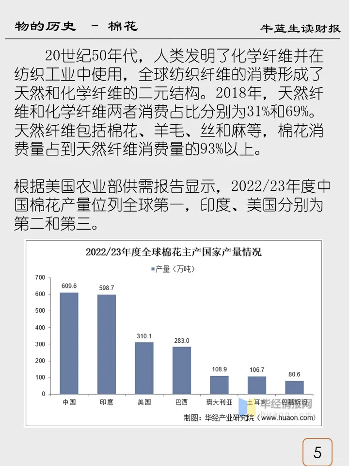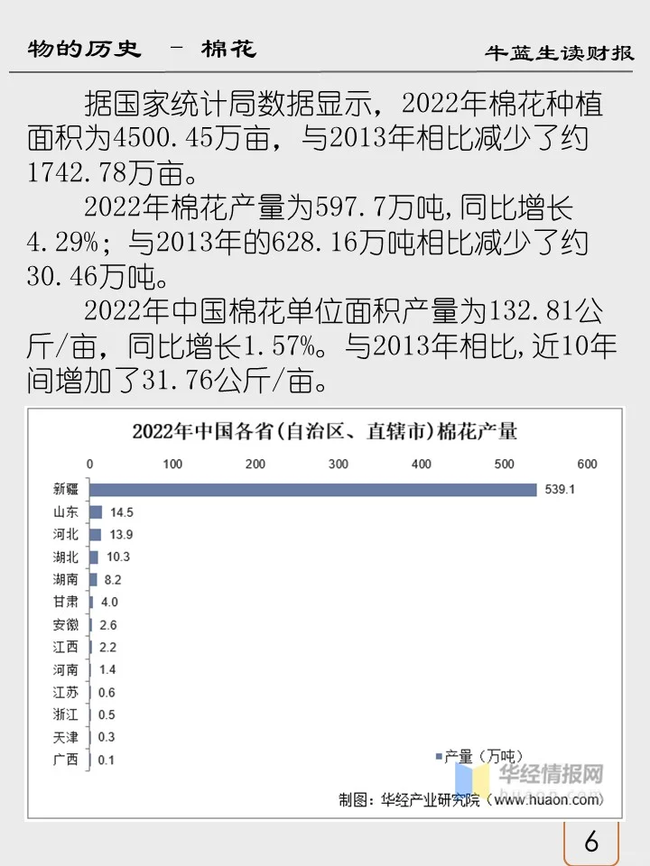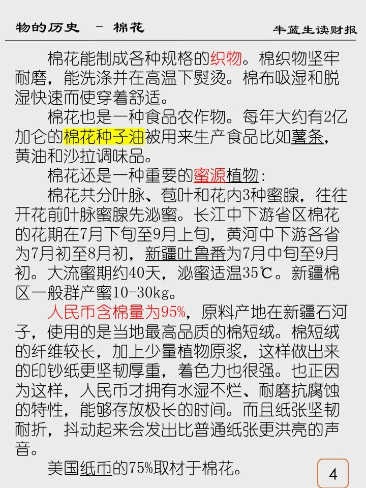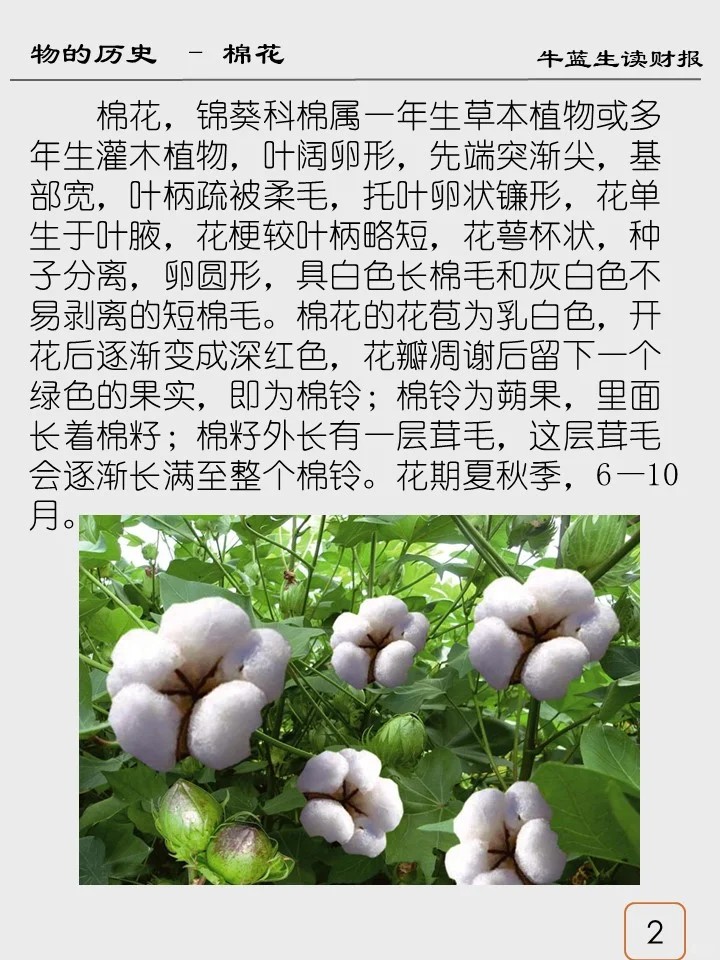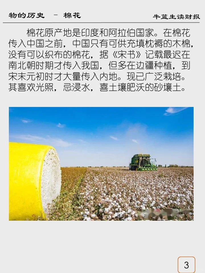 ✈棉花能制成各种规格的织物;棉花种子油被用来生产食品比如薯条,黄油和沙拉调味品;棉花还是制作人民币的主要原料。 ✈棉花原产地是印度和阿拉伯国家。在棉花传入中国之前,中国只有可供充填枕褥的木棉,没有可以织布的棉花,据《宋书》记载最迟在南北朝时期才传入我国,但多在边疆种植,到宋末元初时才大量传入内地。现已广泛栽培。其喜欢光照,忌浸水,喜土壤肥沃的砂壤土。