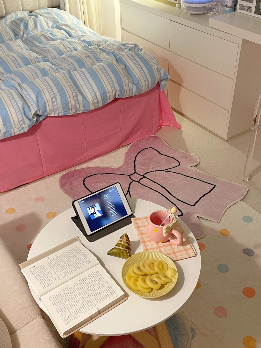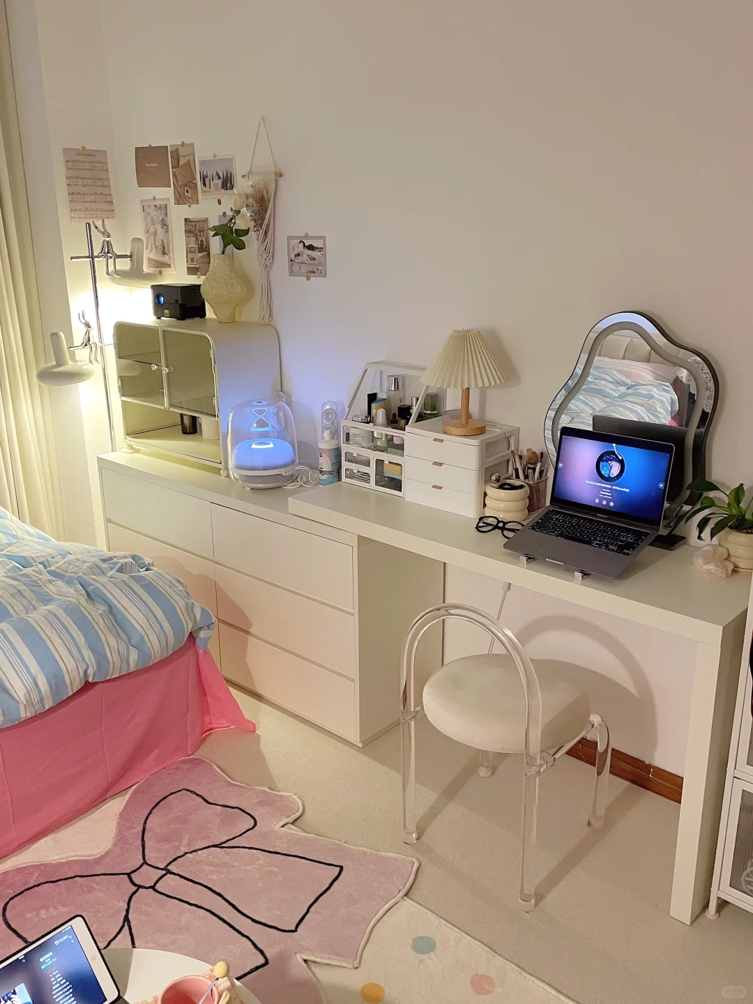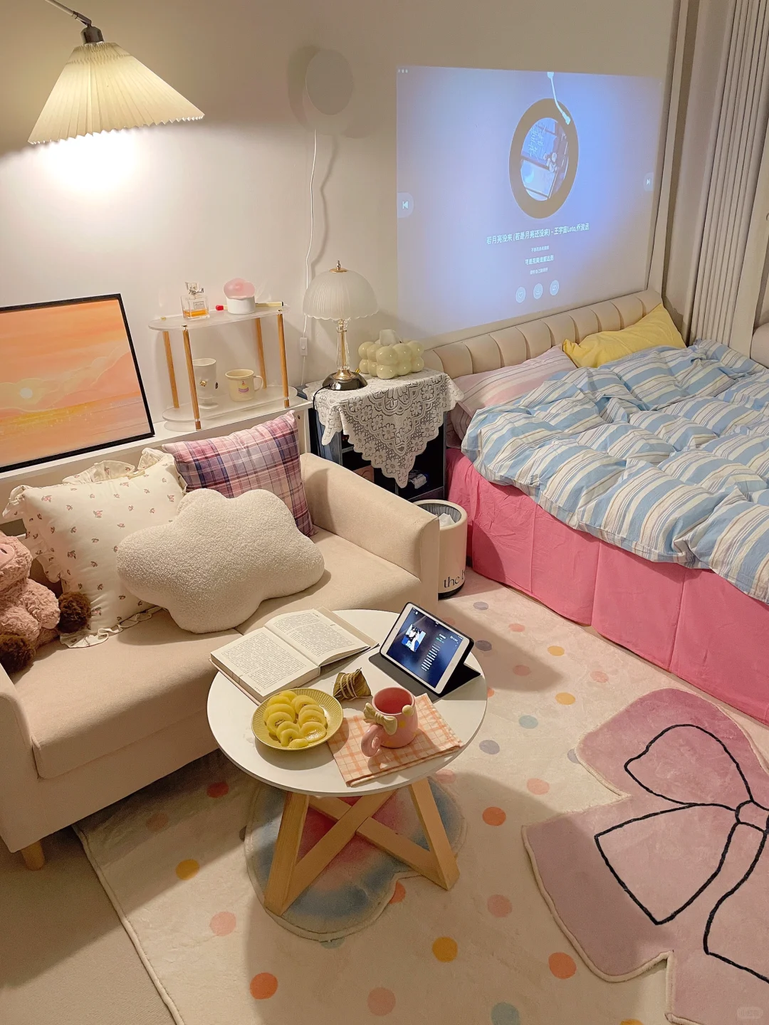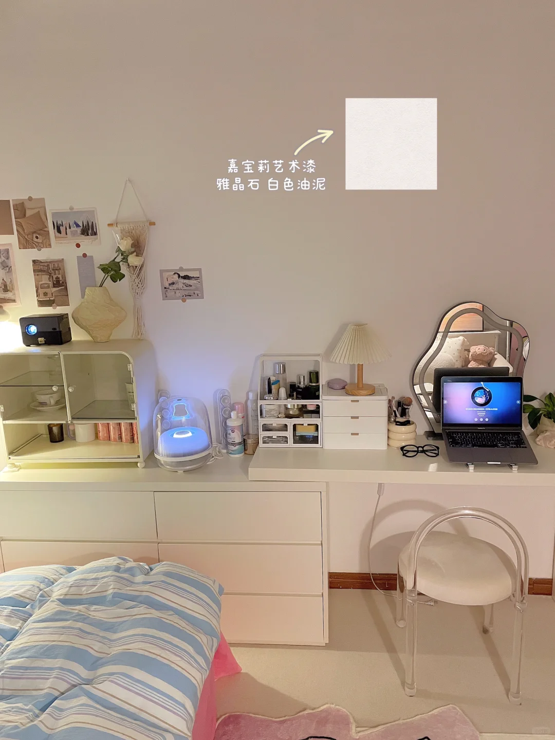 都是我一点点满满布置出来的呀 首先得有一个通透的干净的大白墙 我用的嘉宝莉艺术漆—白色油泥/雅晶石 耐刮蹭很好打理,百搭又好看 后面就是软软的地毯➕漂亮的四件套➕喜欢的家具 最后就会得到自己想要的样子啦