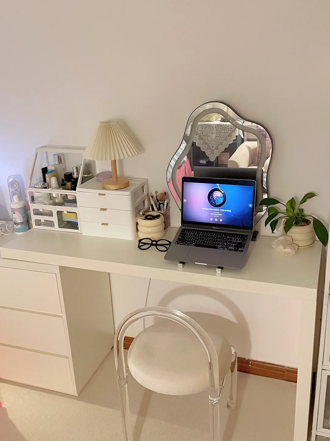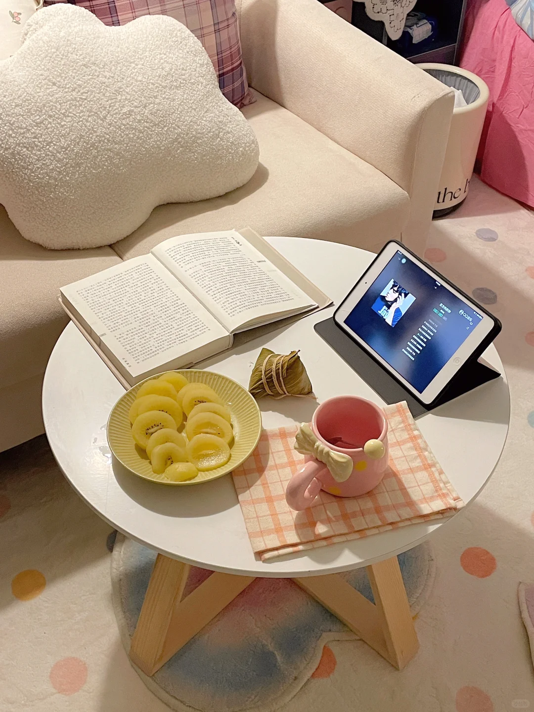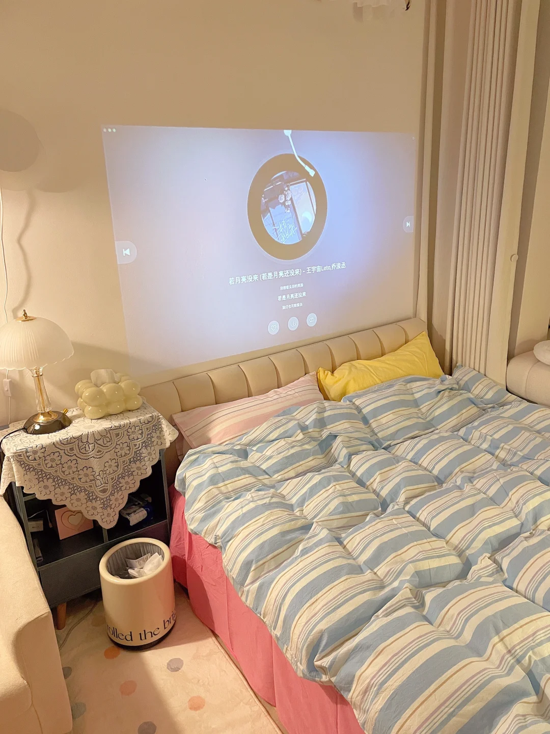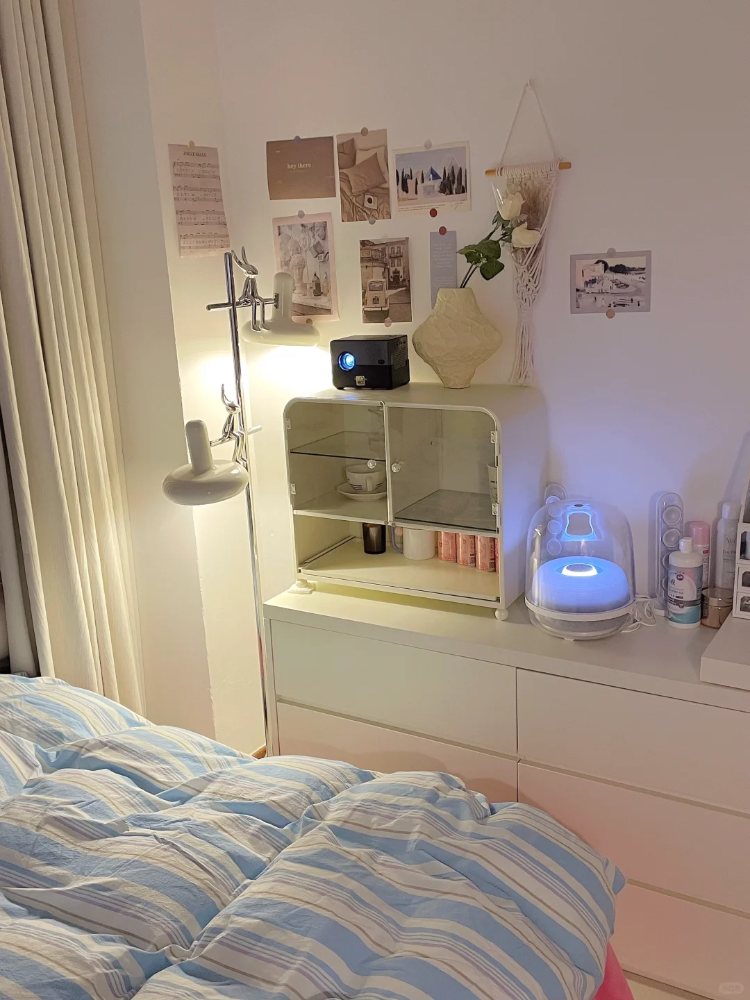 都是我一点点满满布置出来的呀 首先得有一个通透的干净的大白墙 我用的嘉宝莉艺术漆—白色油泥/雅晶石 耐刮蹭很好打理,百搭又好看 后面就是软软的地毯➕漂亮的四件套➕喜欢的家具 最后就会得到自己想要的样子啦