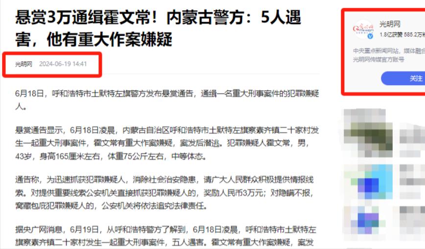 善良真的可以保命!”内蒙灭门案6人中唯一的幸存者就是这家的儿媳妇!只因为她本性善良,曾说过一句话,被凶手放过了。 2024年6月,一场让人惊心动魄的案件悄悄发生。 故事的主人公名叫霍文常,是一个在别人心中不会主动惹事的老好人。 他勤劳朴实,乐于助人,谁家有个大事小情,他都二话不说,热心帮忙。谁能想到,就是这样一位“老好人”,竟然在一夜之间变成了手持砍刀的杀人恶魔? 这件让人心惊胆战的事件,要追溯到几年前的一纸土地承包合同。 霍文常并不是有钱人,相反,她的生活贫苦,仅仅依靠自己的一点田地维持生活。 后来,他把自己的田地放给牛家人进行耕种。 牛家在当地颇有势力,人称“牛霸”,村民们都不敢说什么。 起初,牛家按时交租,相安无事。 但是后来,牛家人开始耍无赖。霍文常上门讨要,不仅要不回钱,还被牛家人百般羞辱,甚至大打出手。 “老好人”霍文常选择了息事宁人 ,默默承受着这一切。 他不是不想反抗,只是他知道,以自己的力量根本无法与牛家抗衡。可是,他的一再退让,得到的却是牛家人的再次逼迫。 2024年6月,牛家人的生命开始倒计时。 当时,村里要进行补贴。 当他来领钱的时候,才知道自己的钱已经被领走了。 这一次,霍文常心中无比愤怒。 他感觉自己就像一只任人宰割的怪兽,心中积压已久的愤怒和绝望如火山般喷发出来。在那个夜晚,他做出了一个令所有人震惊的决定…… 6月18日事情发生了。 村民们来到现场,看见牛家人的惨状。 并且只剩下儿媳妇还活着。 警方立刻赶来现场。 现场留下了大量的线索,包括凶器、血迹、脚印等等。 刑警一眼就看出,凶手并没有刻意隐藏自己的行踪,反而像是在故意留下,似乎是想让所有人都知道,这起灭门惨案是他干的。 经过警方调查和儿媳妇的指认,霍文常被锁定为头号嫌疑人。 据村民们反映,霍文常与牛家积怨已久,双方曾多次发生激烈冲突,案发前几天,还有人看到霍文常在牛家门口徘徊,眼神凶狠,像是要报复。 这件事情引起社会巨大的反应。人们在谈论这起案件的时候,都会不约而同地问出同一个问题:究竟是什么,让一个从来不主动惹事的“老好人”变成了杀人不眨眼的恶魔? 这起灭门惨案的真相究竟如何?潜逃的霍文常最终会被绳之以法吗?让我们拭目以待。 信息来源:光明网-悬赏3万通缉霍文常!内蒙古警方:5人遇害,他有重大作案嫌疑2024.06.19;百姓关注