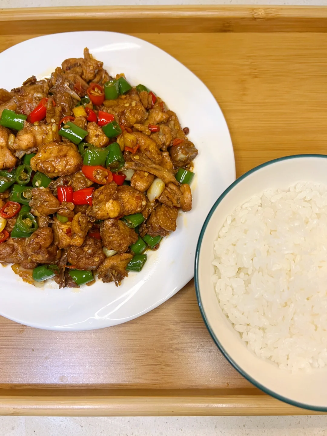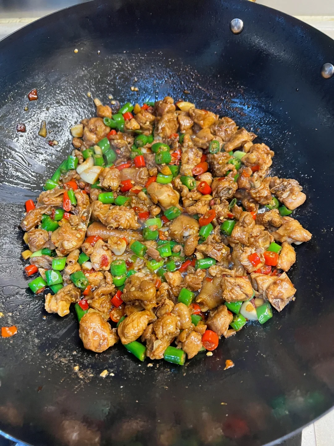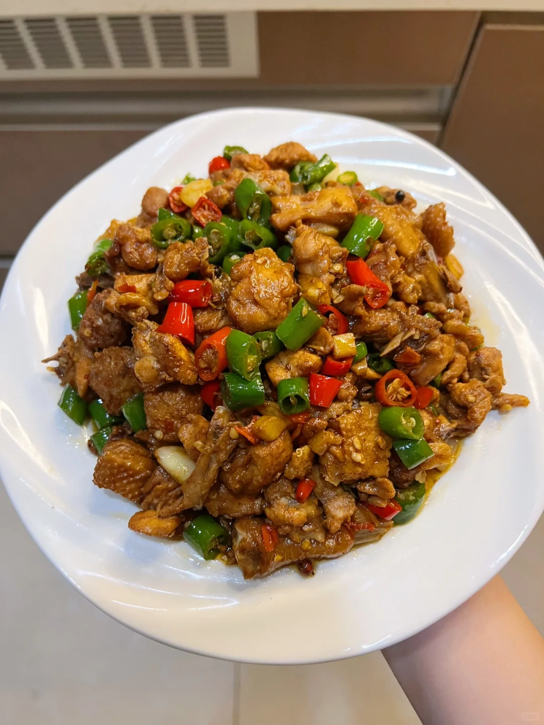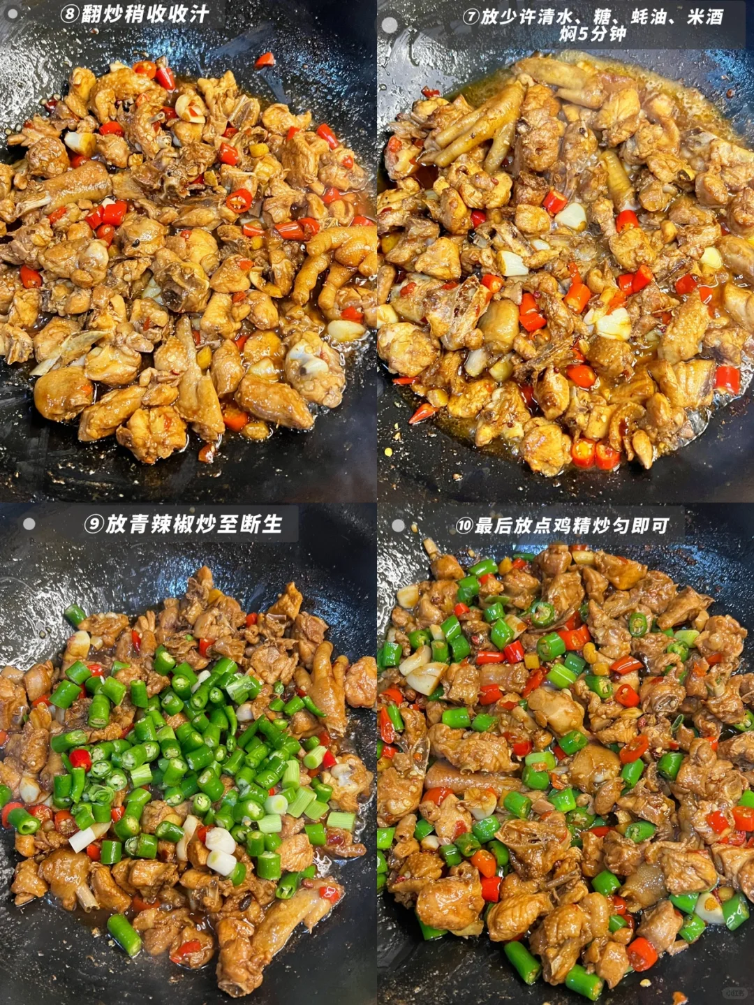 不用半锅油炸做出来的小煎鸡也特别惊艳,鸡要切小块一点,喜欢的朋友快安排起来吧[赞R][赞R] 🍀食材:鸡、姜蒜、青二荆条、小米辣、花椒; 👇做法: 1、鸡肉切小块,放葱姜焯水洗净,油热下鸡块炒香,放盐、生抽、老抽上色,放姜蒜粒炒出香味,放少许豆瓣酱、剁辣椒、花椒炒香,放小米辣炒匀; 2、放少许清水、糖、蚝油、米酒焖五分钟,翻炒收汁,放青椒炒至断生,最后放点鸡精即可;