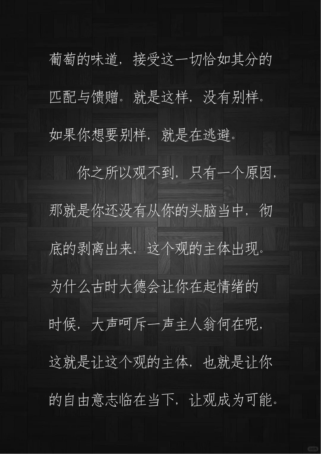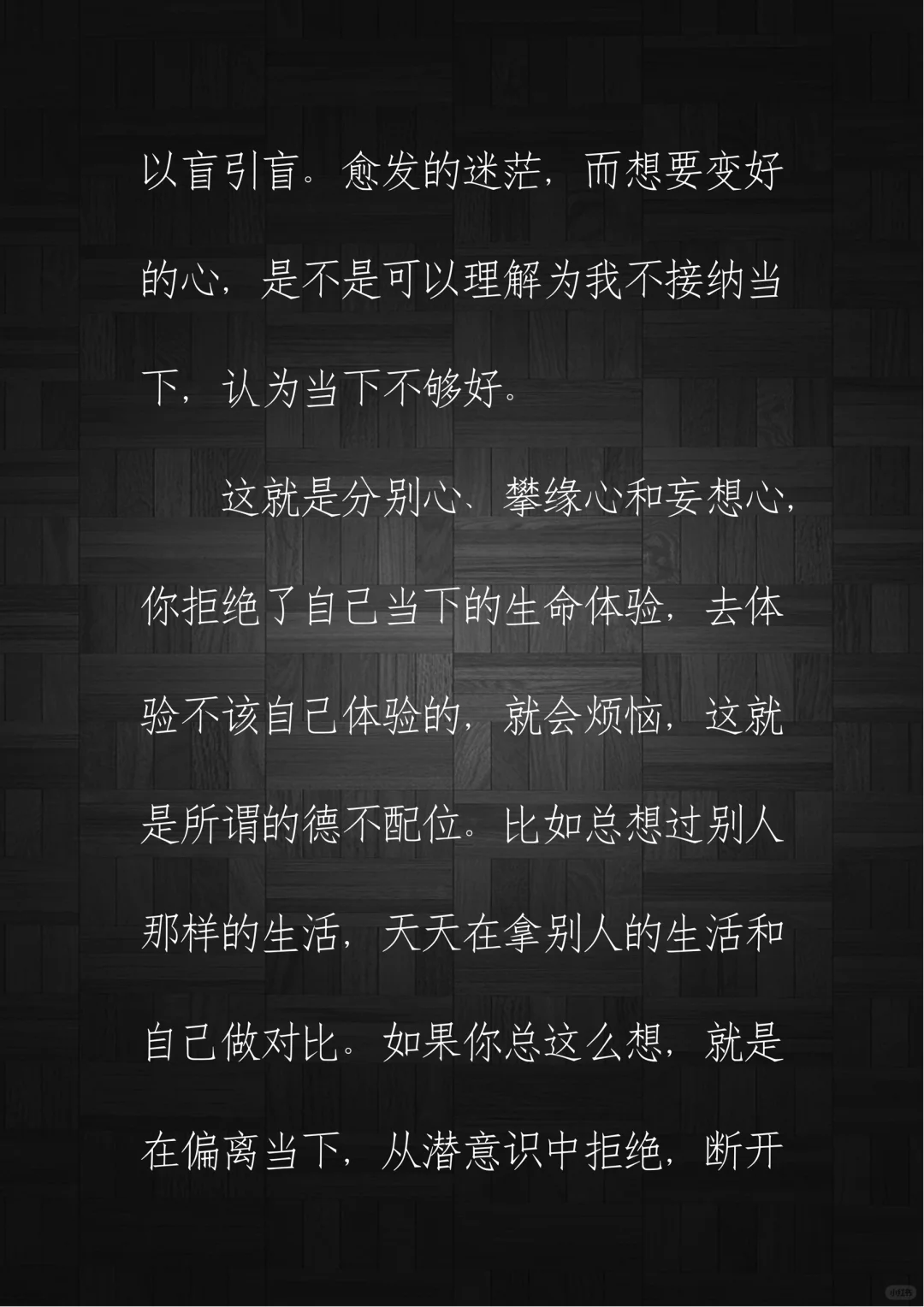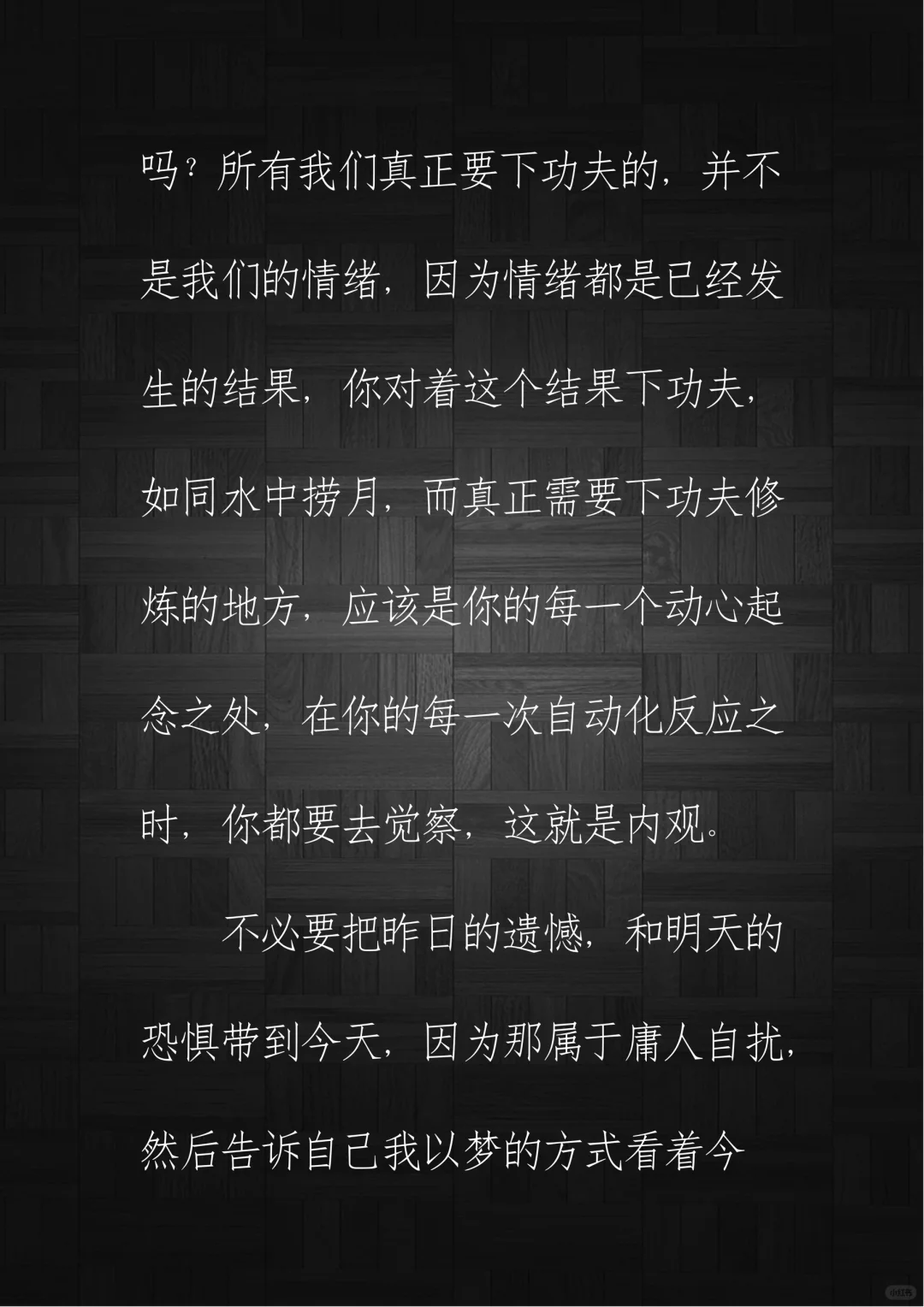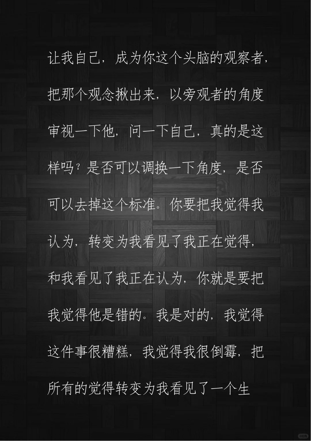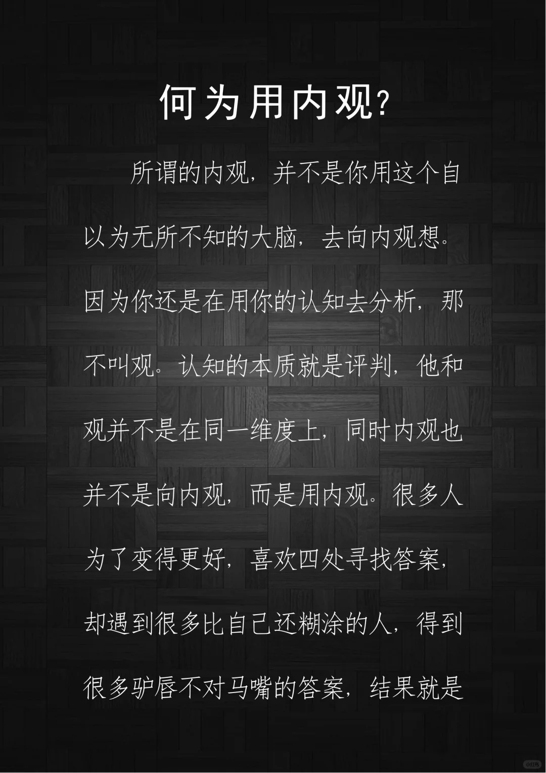 所谓的内观,并不是你用这个自以为无所不知的大脑,去向内观想。因为你还是在用你的认知去分析,那不叫观。认知的本质就是评判,他和观并不是在同一维度上,同时内观也并不是向内观,而是用内观。很多人为了变得更好,喜欢四处寻找答案,却遇到很多比自己还糊涂的人,得到很多驴唇不对马嘴的答案,结果就是以盲引盲。愈发的迷茫,而想要变好的心,是不是可以理解为我不接纳当下,认为当下不够好。