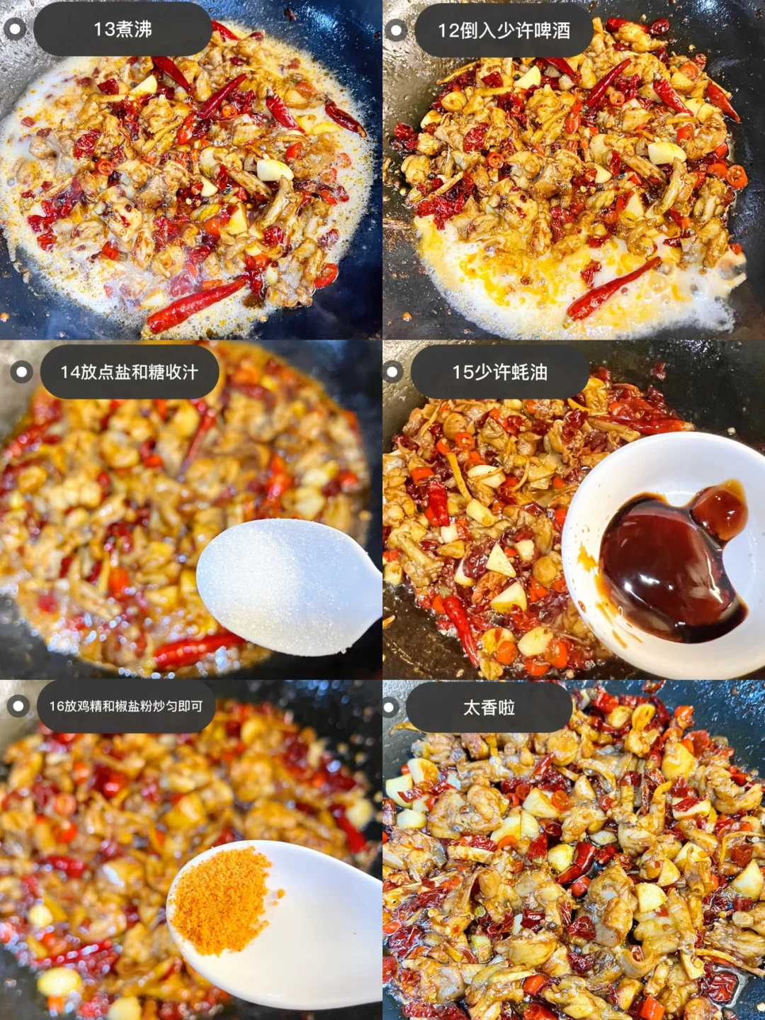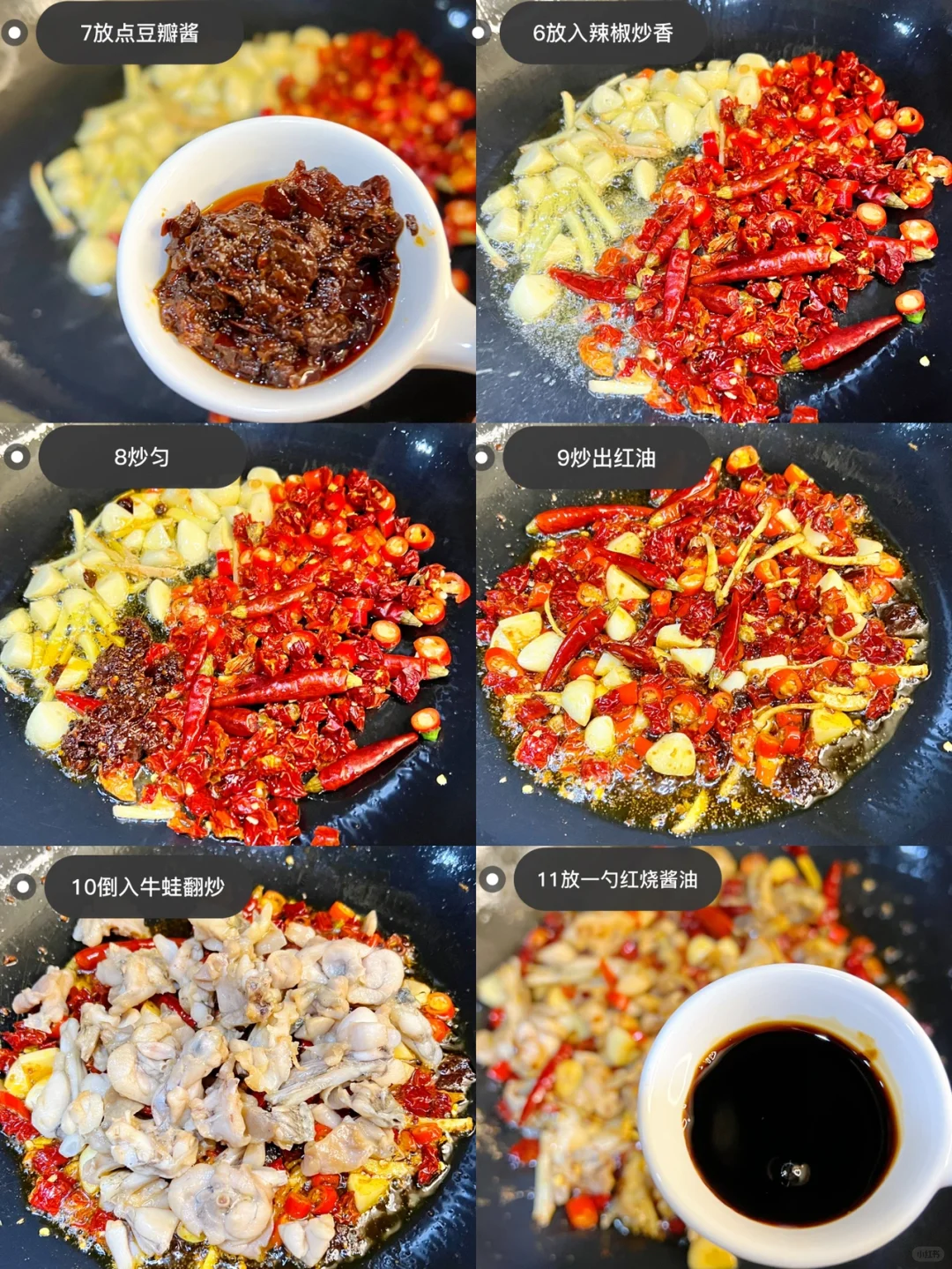 2⃣️另起锅放油,先放姜蒜爆香,再放入干辣椒和小米辣炒香,放一勺豆瓣酱炒出红油,倒入牛蛙炒匀,放一勺红烧酱油上色,再放入少许啤酒,放点盐和糖焖一分钟,多炒几下收汁,炒干一点更香,放一丢丢蚝油,再放点鸡精和椒盐粉炒匀就可以起锅啦;