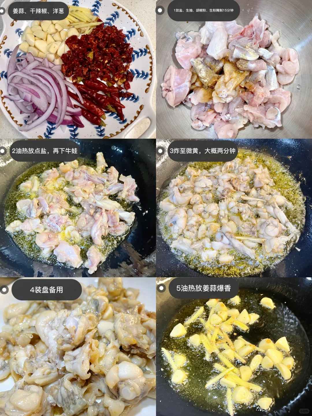 1⃣️牛蛙用盐、生抽、胡椒粉、生粉腌制15分钟,油热放点盐防粘锅,下牛蛙炸至两面微黄,捞起备用;
