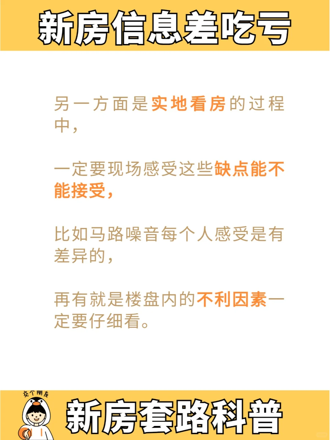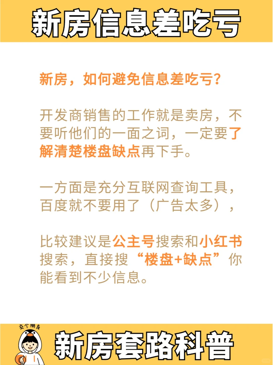 开发商销售的工作就是卖房,不要听他们的一面之词,一定要了解清楚楼盘缺点再下手。 一方面是充分互联网查询工具,百度就不要用了(广告太多),比较建议是公主号搜索和搜索,直接搜“楼盘+缺点”你能看到不少信息。 另一方面是实地看房的过程中,一定要现场感受这些缺点能不能接受,比如马路噪音每个人感受是有差异的,再有就是楼盘内的不利因素一定要仔细看!!! 还有什么疑问?评论区告诉我[暗中观察R]