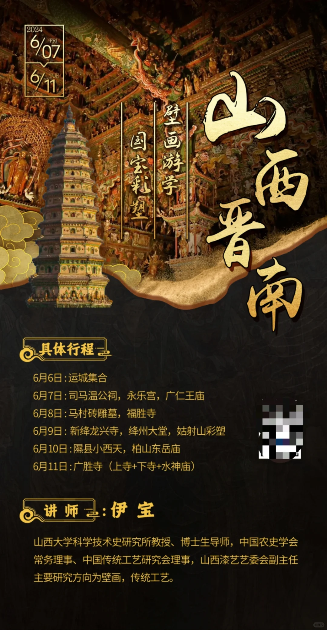 端午山西晋南游学~经典的晋南路线,对着文物地图百里挑一,行程里已经包含了山西晋南最好的彩塑壁画,永乐宫、青龙寺元代壁画+隰县小西天、姑射山明代悬塑+广胜寺、福胜寺彩塑壁画! 专业老师全程细致讲解,纯深度游学无购物+专业贴心领队~~备受好评的路线和服务 6月6日:运城集合 6月7日:司马温公祠永乐宫,广仁王庙 6月8日:马村砖雕墓,福胜寺 6月9日:新绛龙兴寺,绛州大堂姑射山悬塑 6月10日:隰县小西天,柏山东岳庙 6月11日:广胜寺(上寺+下寺+水神庙)