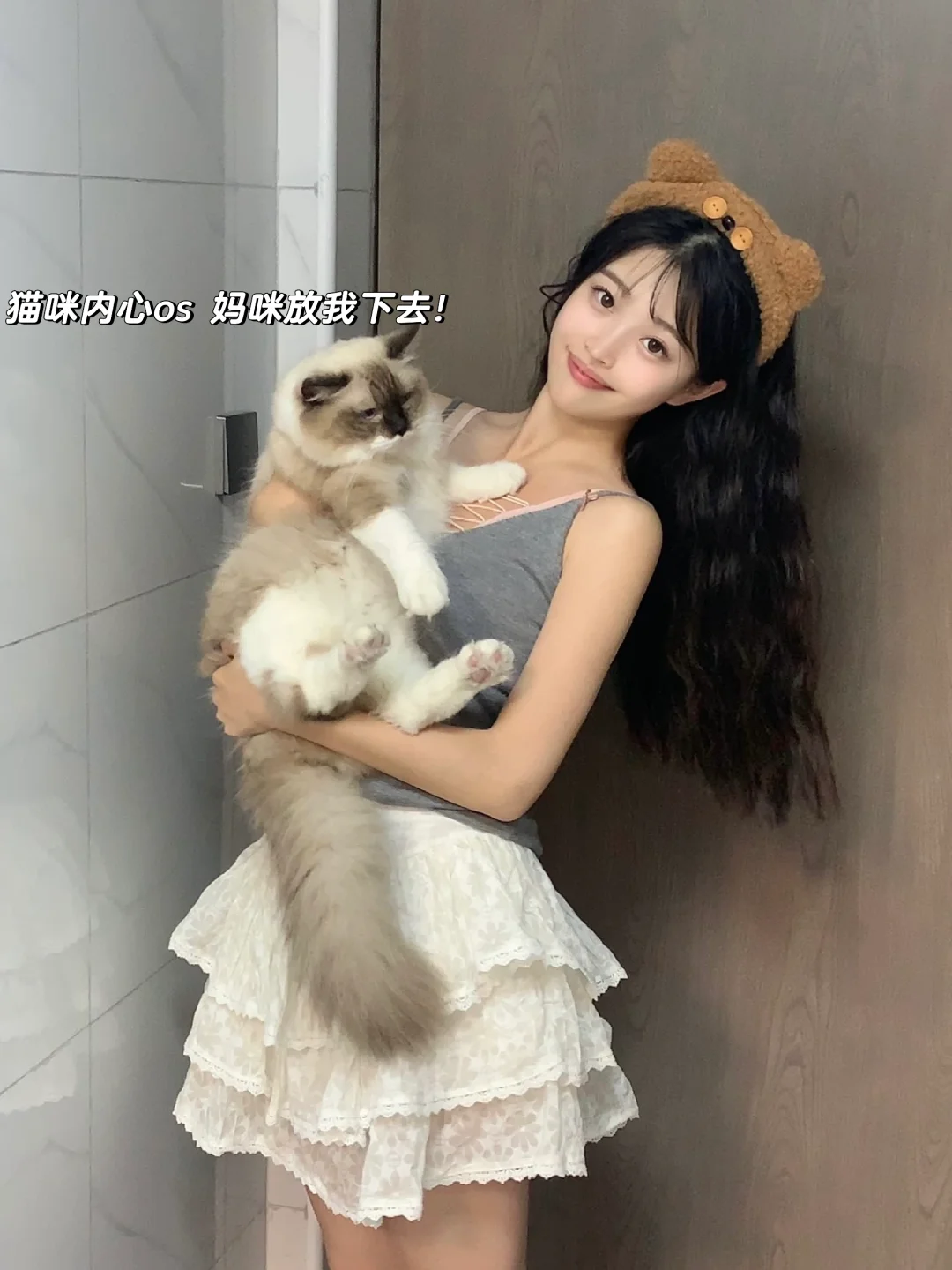 好清纯的美女,和小猫咪在一起拍照真好看!