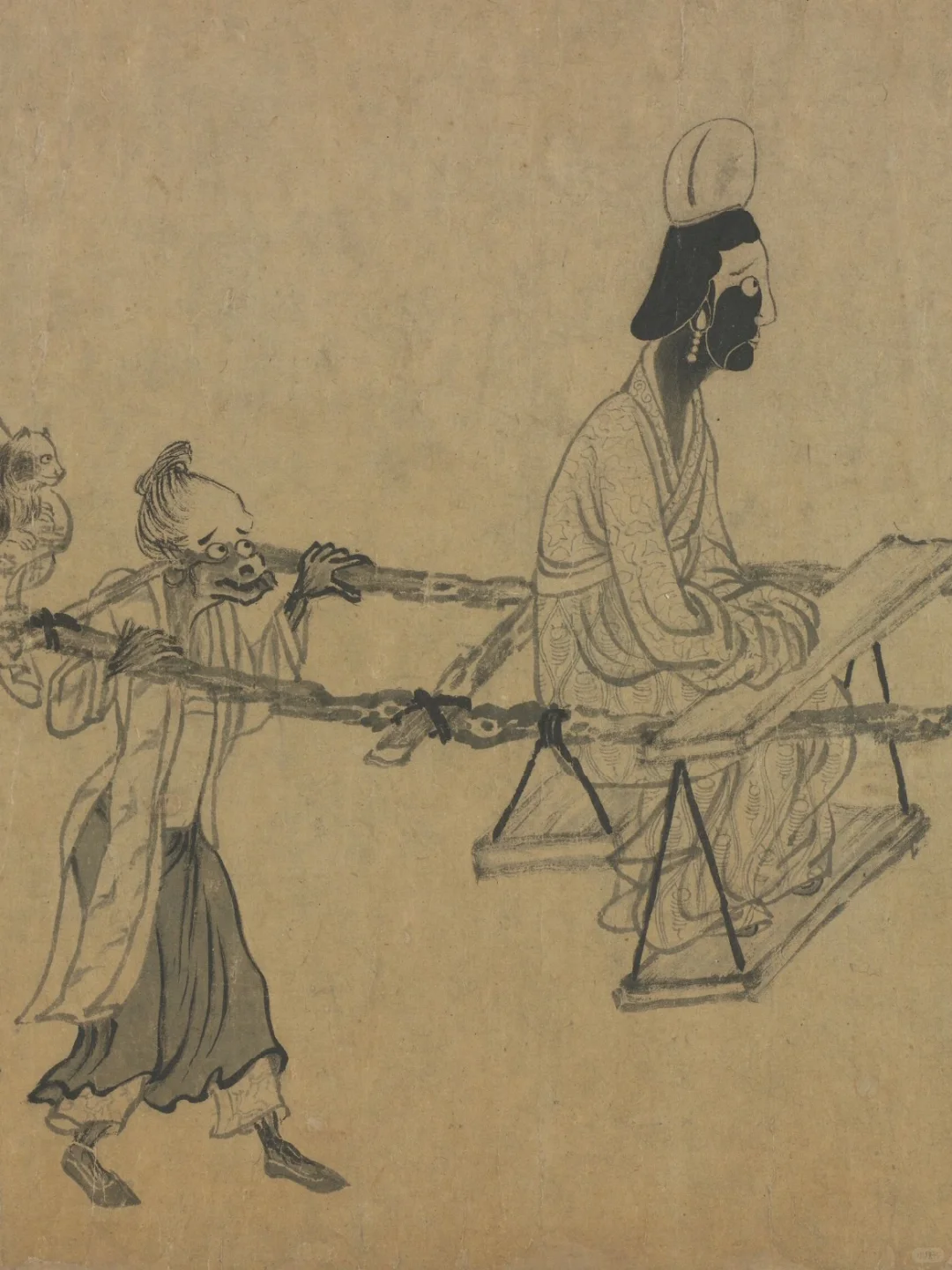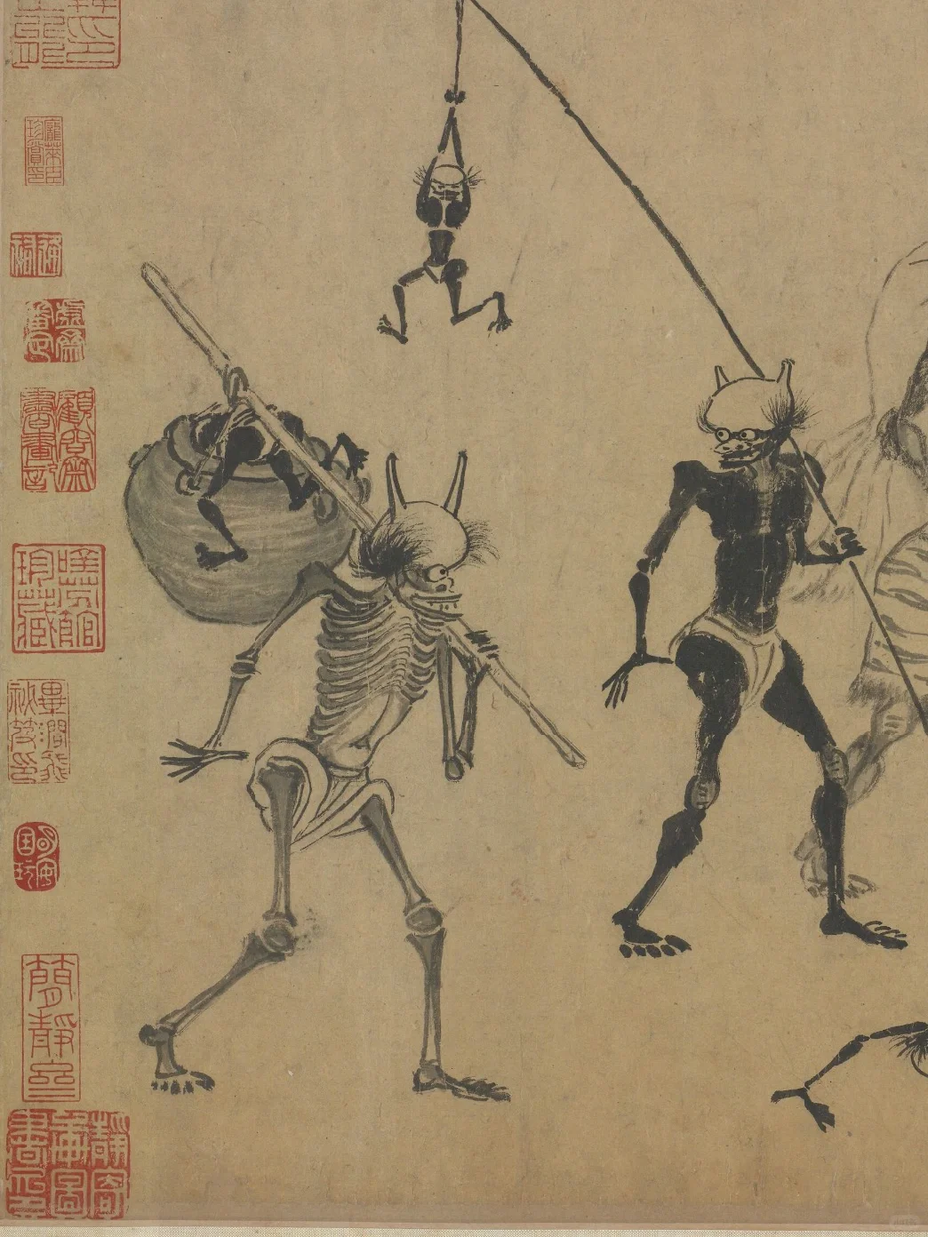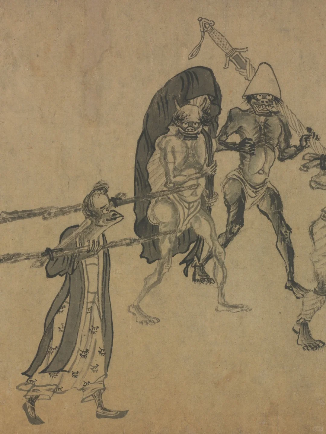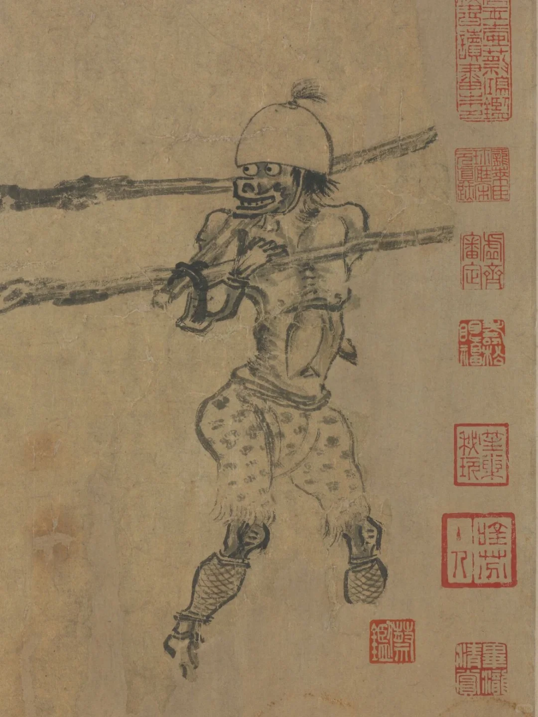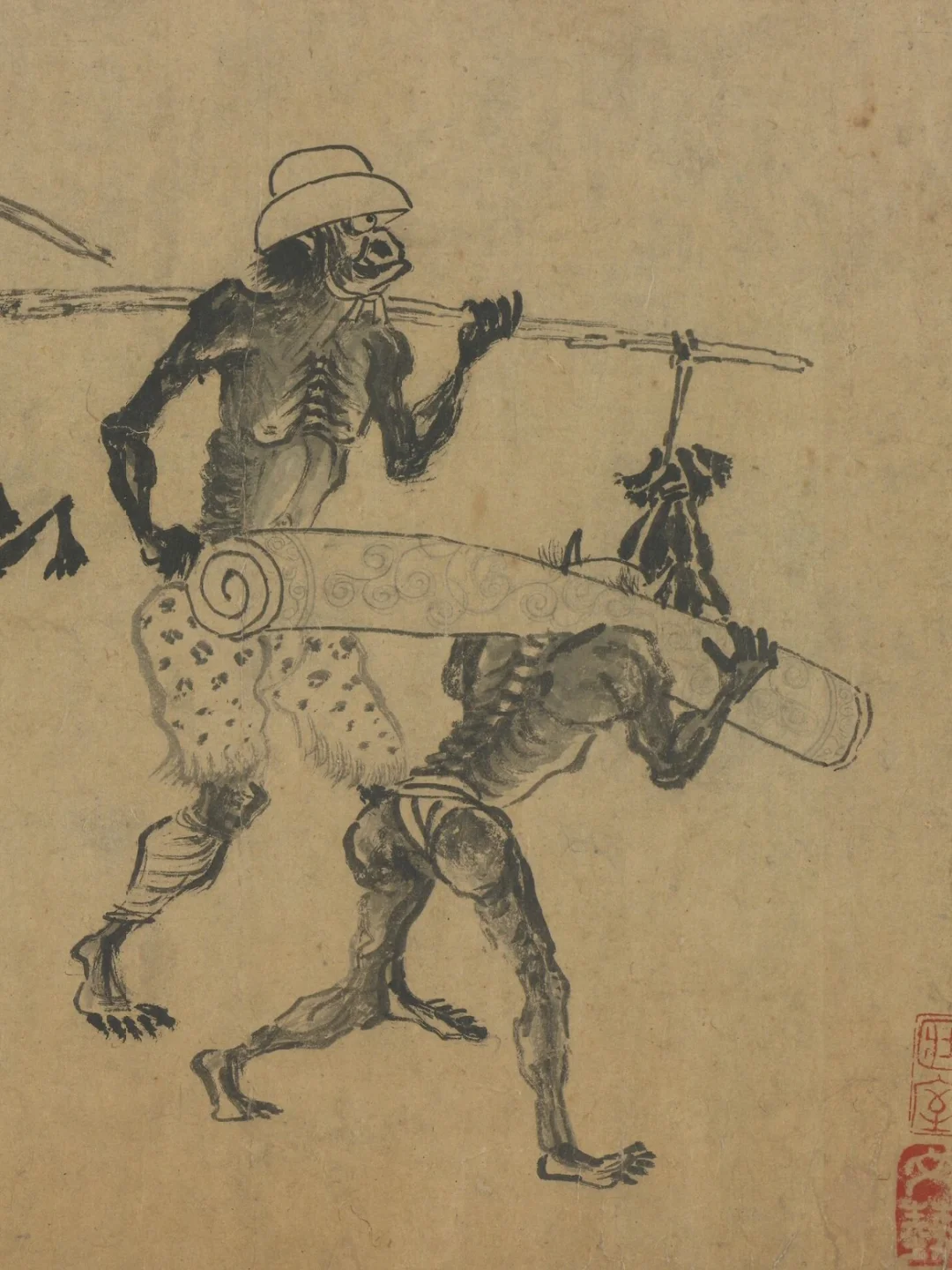 🍀《中山出游图》画民间传说钟馗与小妹出游的故事。 钟馗是唐宋以来流行的绘画题材。 最早画钟馗的是唐代画家吴道子,相传唐玄宗患病,夜间梦一大鬼捉食小鬼,自称钟馗,武举不捷,誓为皇帝除天下之妖孽。 梦醒后店疾顿瘳,乃诏吴道子画梦中所见,自后岁暮画钟馗,以祛除邪魅,相沿成为习俗。 五代时黄筌、周文矩、石恪等人都画过钟馗,龚开首创以墨代替设色画法,他在题跋中说,不应将墨鬼视为戏笔,它乃是画家之草圣,世上岂有不善真书而能作草书者。然而,《中山出游图》实是运用漫画手法画钟馗和鬼趣图的首创之作。 画家自题其画日:“髯君家本住中山,驾言出游安所适?谓为小猎无鹰犬,以为意行有家室,阿妹韶容见靓妆,五色胭脂最宜黑·”诗与画都充满了荒诞、诙谐的趣味。 由龚开所开创的这一画风,为后来许多画钟馗、鬼趣图者所借鉴与发挥。