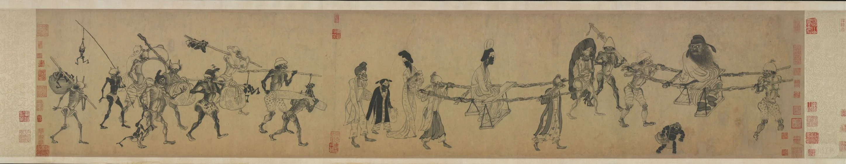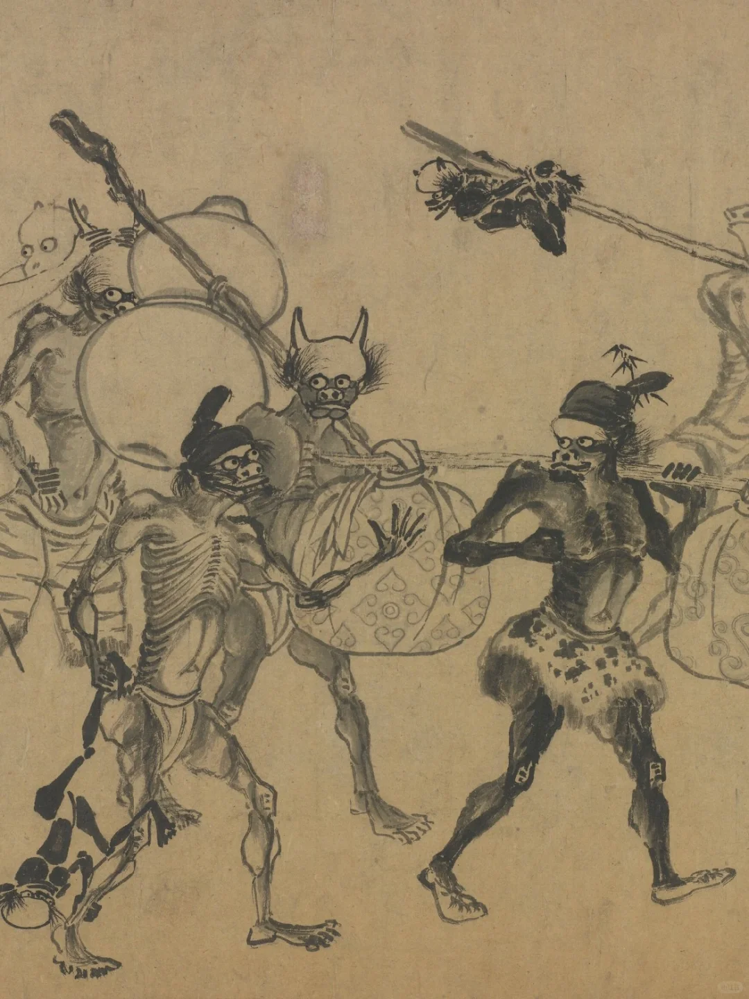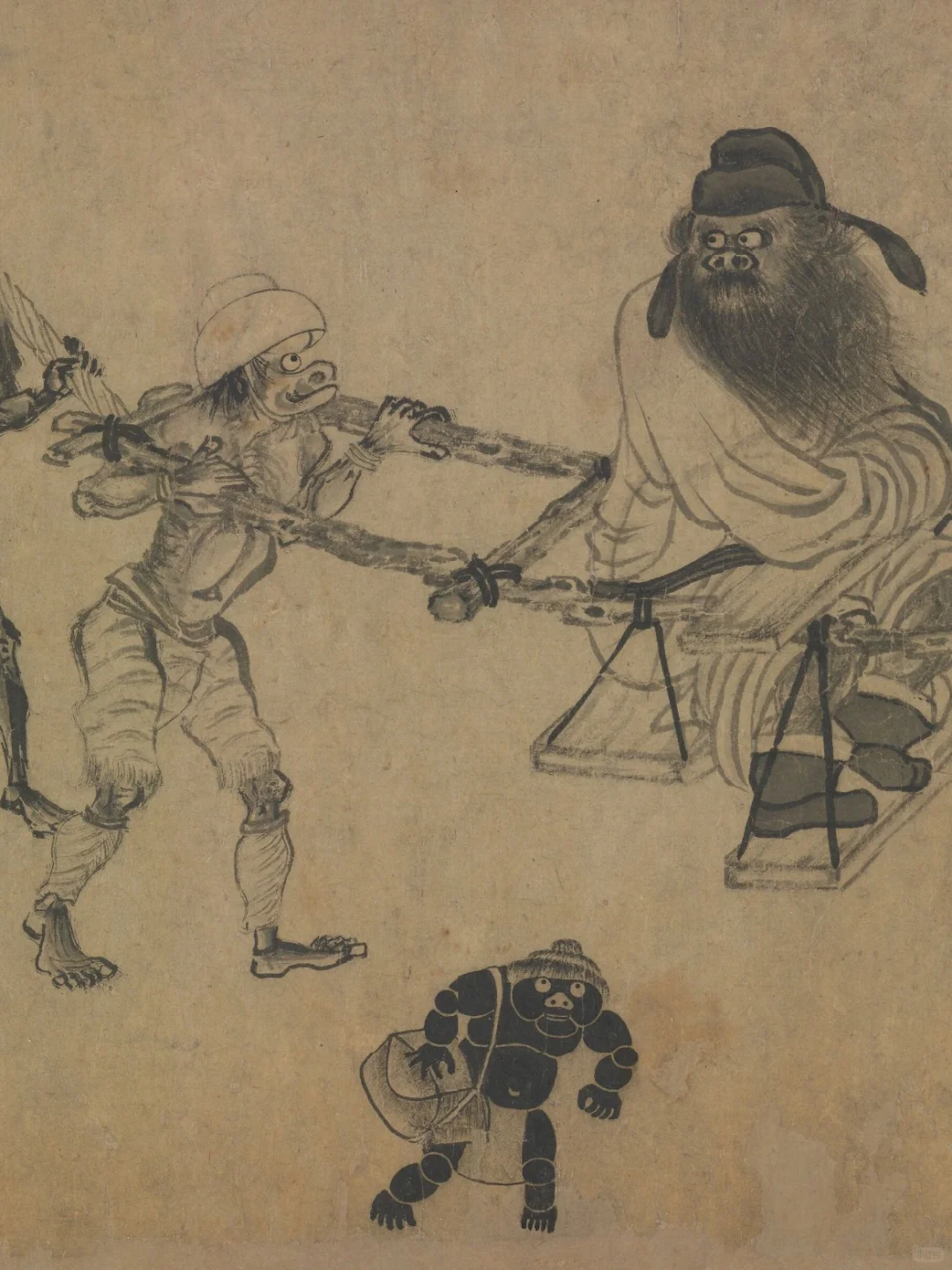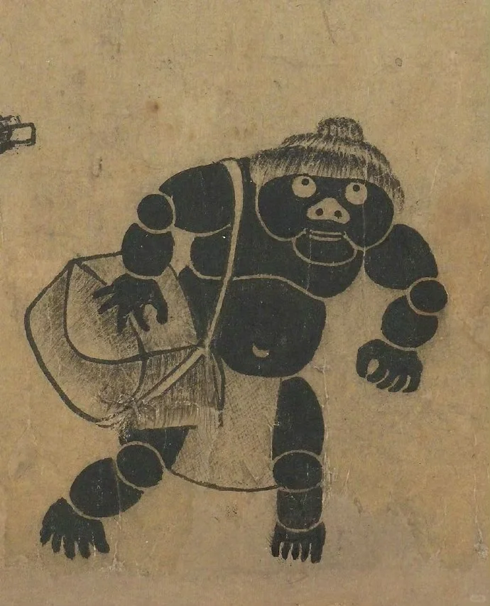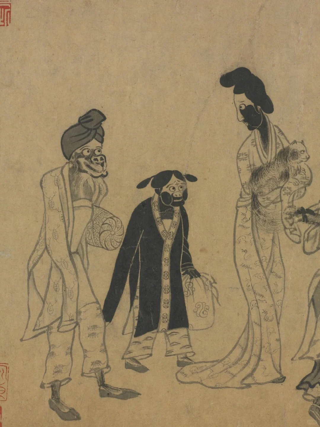🍀《中山出游图》画民间传说钟馗与小妹出游的故事。 钟馗是唐宋以来流行的绘画题材。 最早画钟馗的是唐代画家吴道子,相传唐玄宗患病,夜间梦一大鬼捉食小鬼,自称钟馗,武举不捷,誓为皇帝除天下之妖孽。 梦醒后店疾顿瘳,乃诏吴道子画梦中所见,自后岁暮画钟馗,以祛除邪魅,相沿成为习俗。 五代时黄筌、周文矩、石恪等人都画过钟馗,龚开首创以墨代替设色画法,他在题跋中说,不应将墨鬼视为戏笔,它乃是画家之草圣,世上岂有不善真书而能作草书者。然而,《中山出游图》实是运用漫画手法画钟馗和鬼趣图的首创之作。 画家自题其画日:“髯君家本住中山,驾言出游安所适?谓为小猎无鹰犬,以为意行有家室,阿妹韶容见靓妆,五色胭脂最宜黑·”诗与画都充满了荒诞、诙谐的趣味。 由龚开所开创的这一画风,为后来许多画钟馗、鬼趣图者所借鉴与发挥。