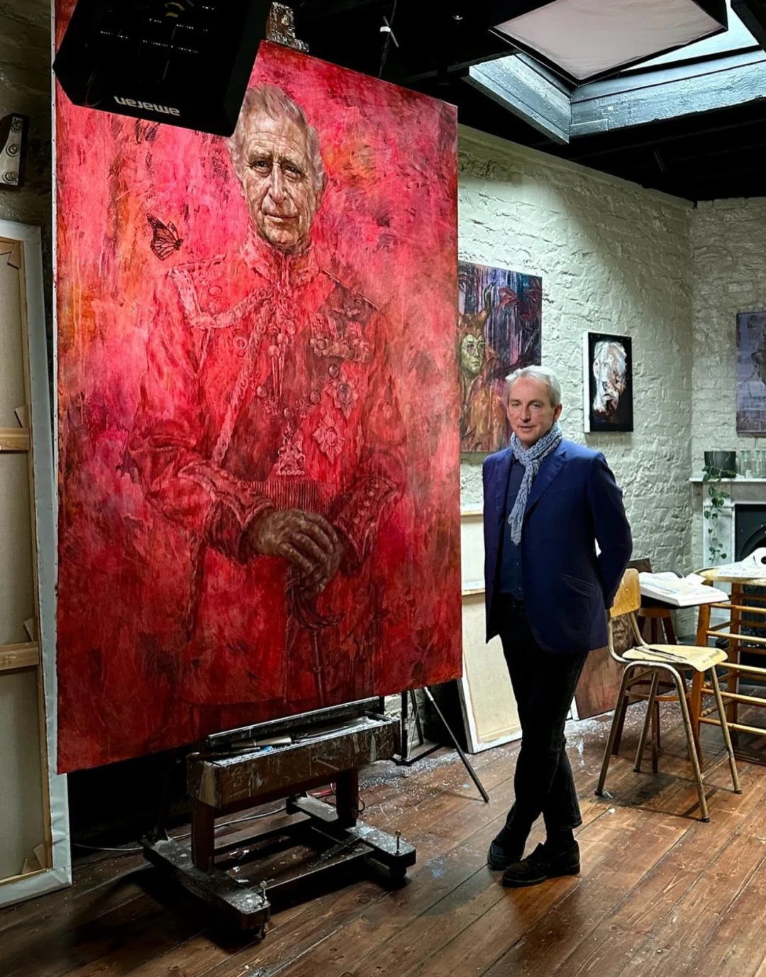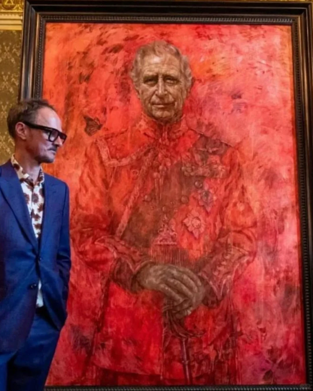 🍀这幅肖像尺寸为9x7英尺,画面上,查尔斯穿着威尔士卫队的制服,他在 1975 年被任命为团上校,整个画面是霸气的红色色调,国王的右肩上还有一只蝴蝶,画面被刺眼的红色所笼罩。这幅画是由著名肖像画家Jonathan Yeo绘制。