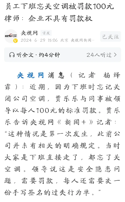 在乐乐的案例中,我们见证了企业管理与员工权益之间的微妙冲突。乐乐因一时疏忽未关办公室空调,却遭遇了公司严厉的罚款措施,这不仅让她心生不满,也触动了公众对于企业管理方式合理性的思考。