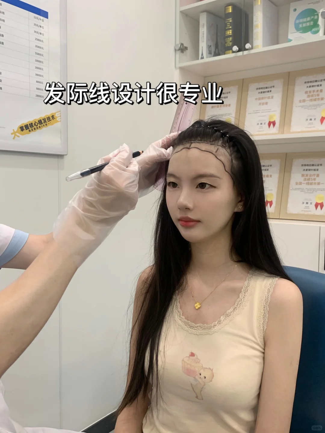 面诊时会先做一个头皮检测,来看看头皮的健康情况,然后再根据我的三庭五眼和风格和我的需求,来设计一个适合我的发际线形状,我选择的是小花瓣形,这样更能勾勒我的脸型,帮我设计的👩⚕非常有耐心,也很细心,跟我沟通是否要留取我的山羊角位置的小绒毛,能感受到医生的尊重和温暖的服务~
