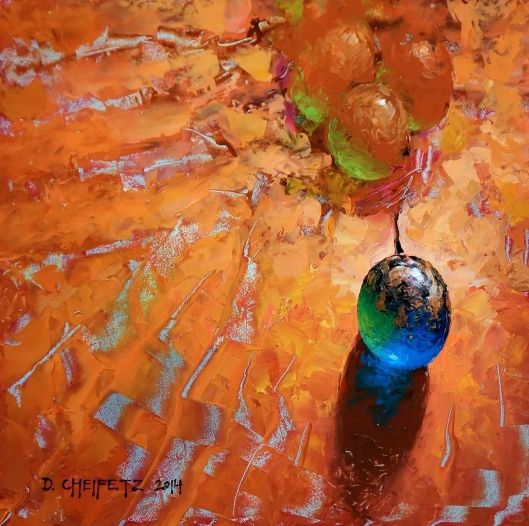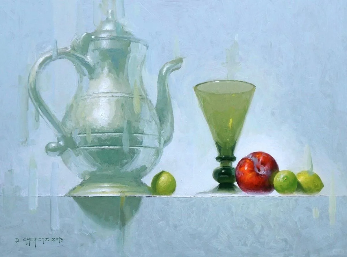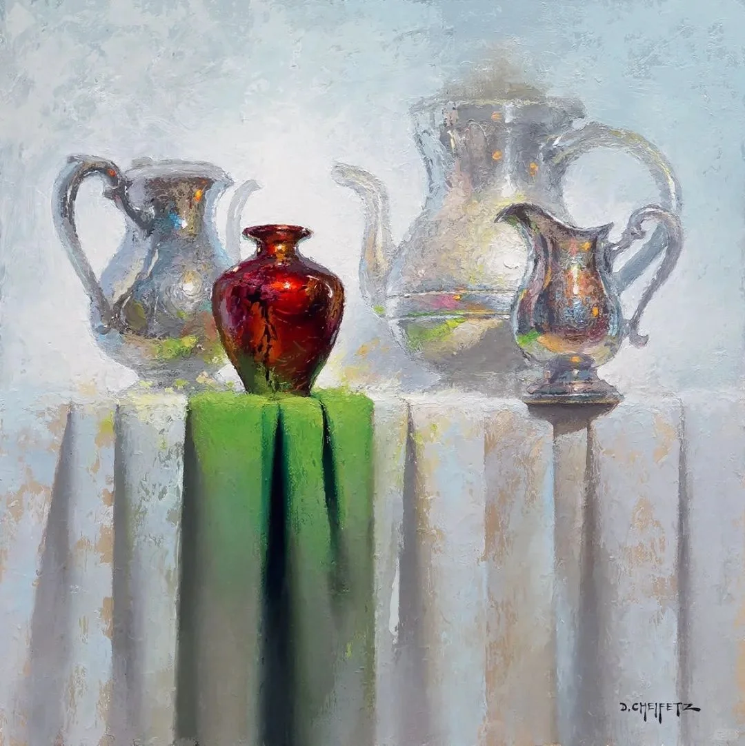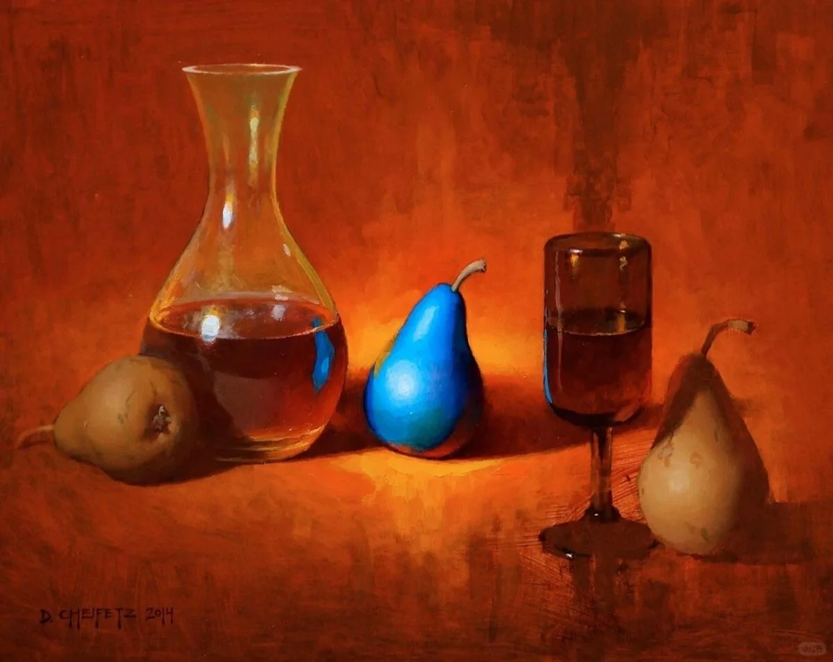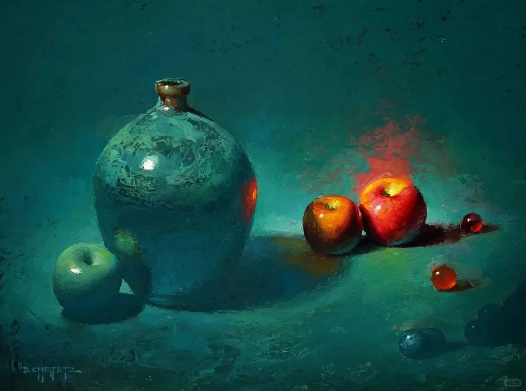 🍀大卫·切菲兹采用Alla Prima (一次性画法/直接画法) 绘画,一种将油画颜料应用于先前的湿颜料层的油画技法。他的作品没有细致的底画或研究,而是通过突出、富有表现力的笔触和强烈的明暗对比来营造氛围。David Cheifetz在创作静物油画时注重体现生活气息,而且特别重视整体与局部的关系。他的笔触十分自由,常常使用融合笔法,隐去了笔迹。他喜欢采用层叠加色的技巧,丰富画面的层次。在表现暗部中的物体时,采用透明色,增加了明暗对比效果。画中呈现的半透明效果,体现了其娴熟的技巧。