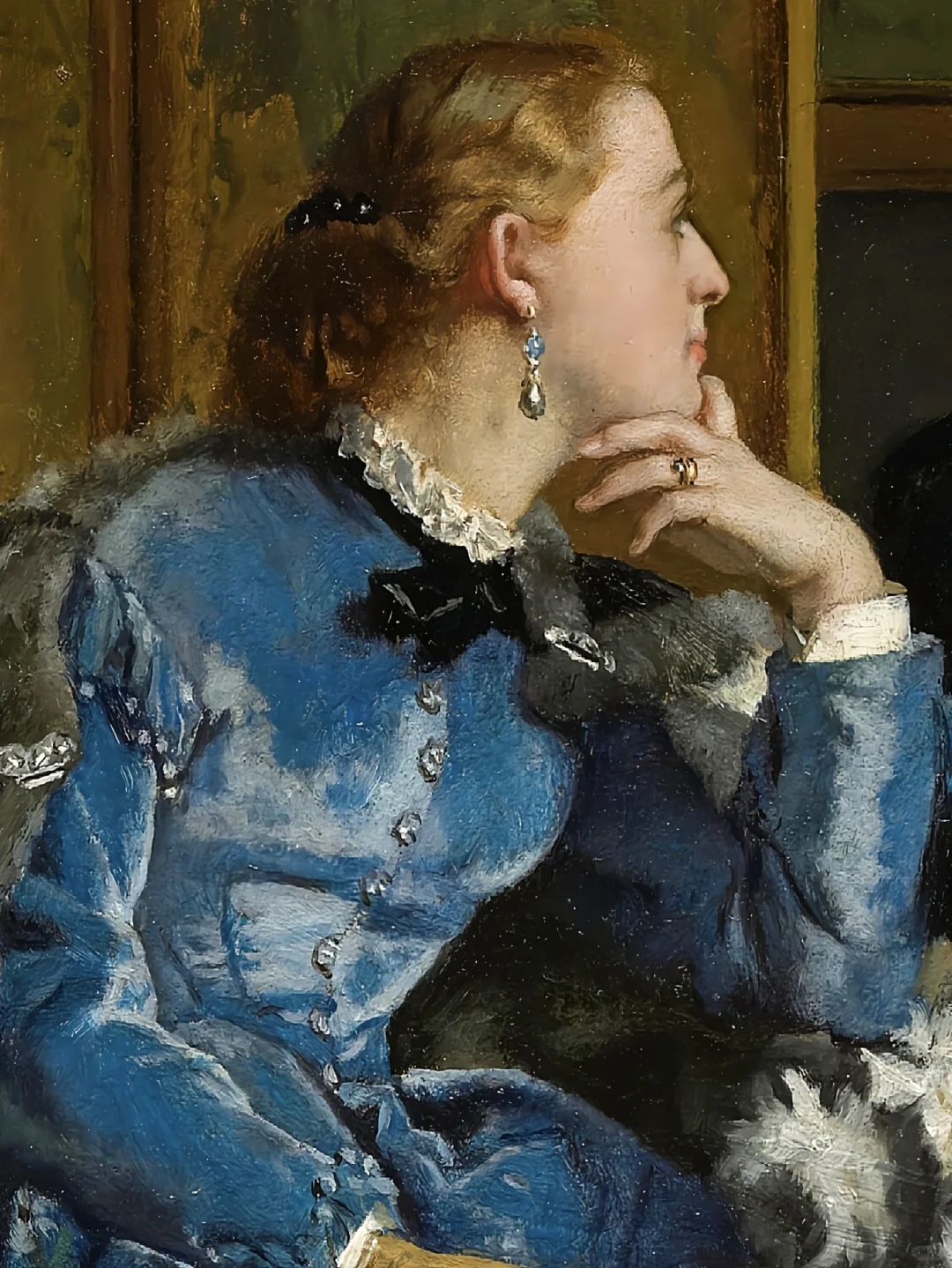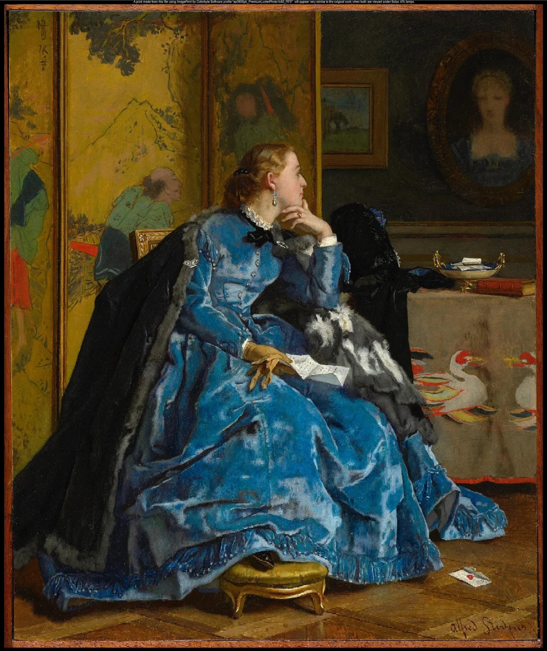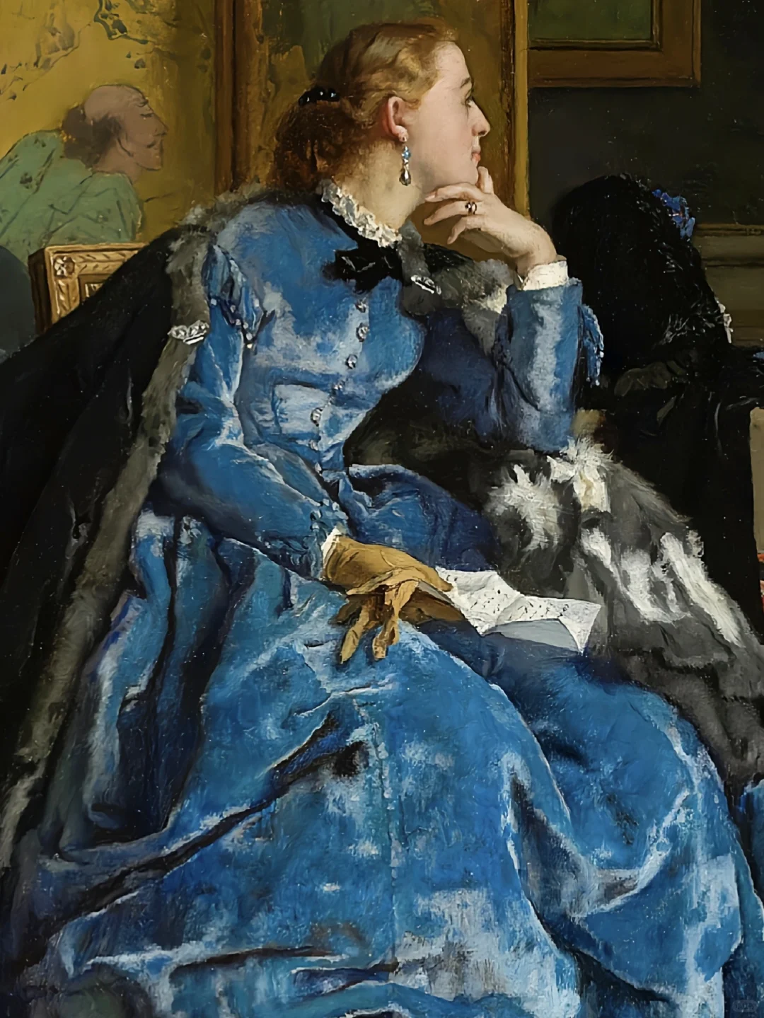 🍀《蓝裙子》又名《公爵夫人》,最早在1867年巴黎世界博览会上展出。以一位身穿豪华蓝色裙子的已婚贵族女子为主角。她可能刚刚从某个聚会的场所回来,身上的黑色披风还没有退去,金色华贵的手套也只脱掉一只。她脚边散落着打开的信封,手上攥着那封信,脸扭到右边的墙上,那里挂着一幅女子的肖像画。