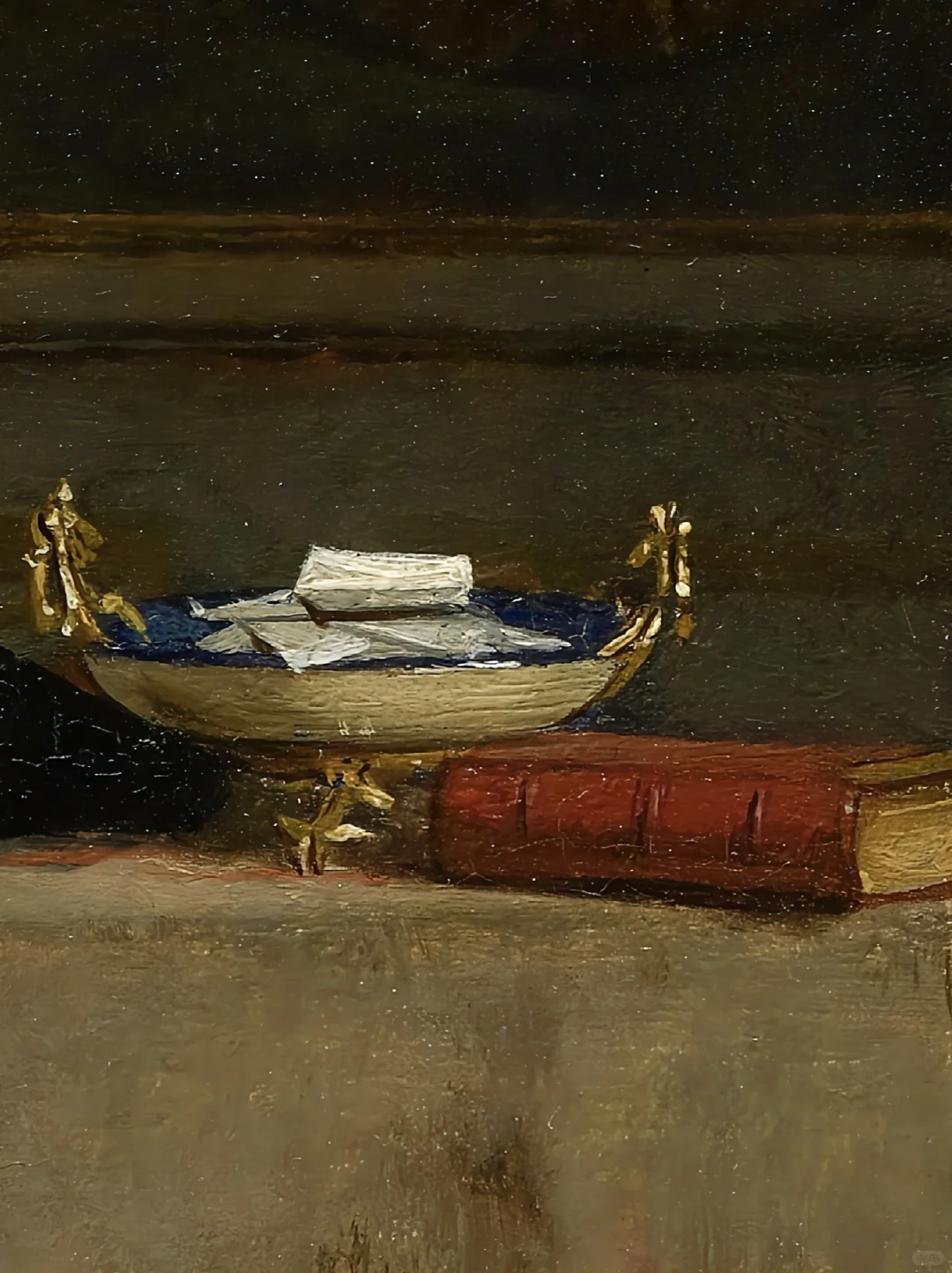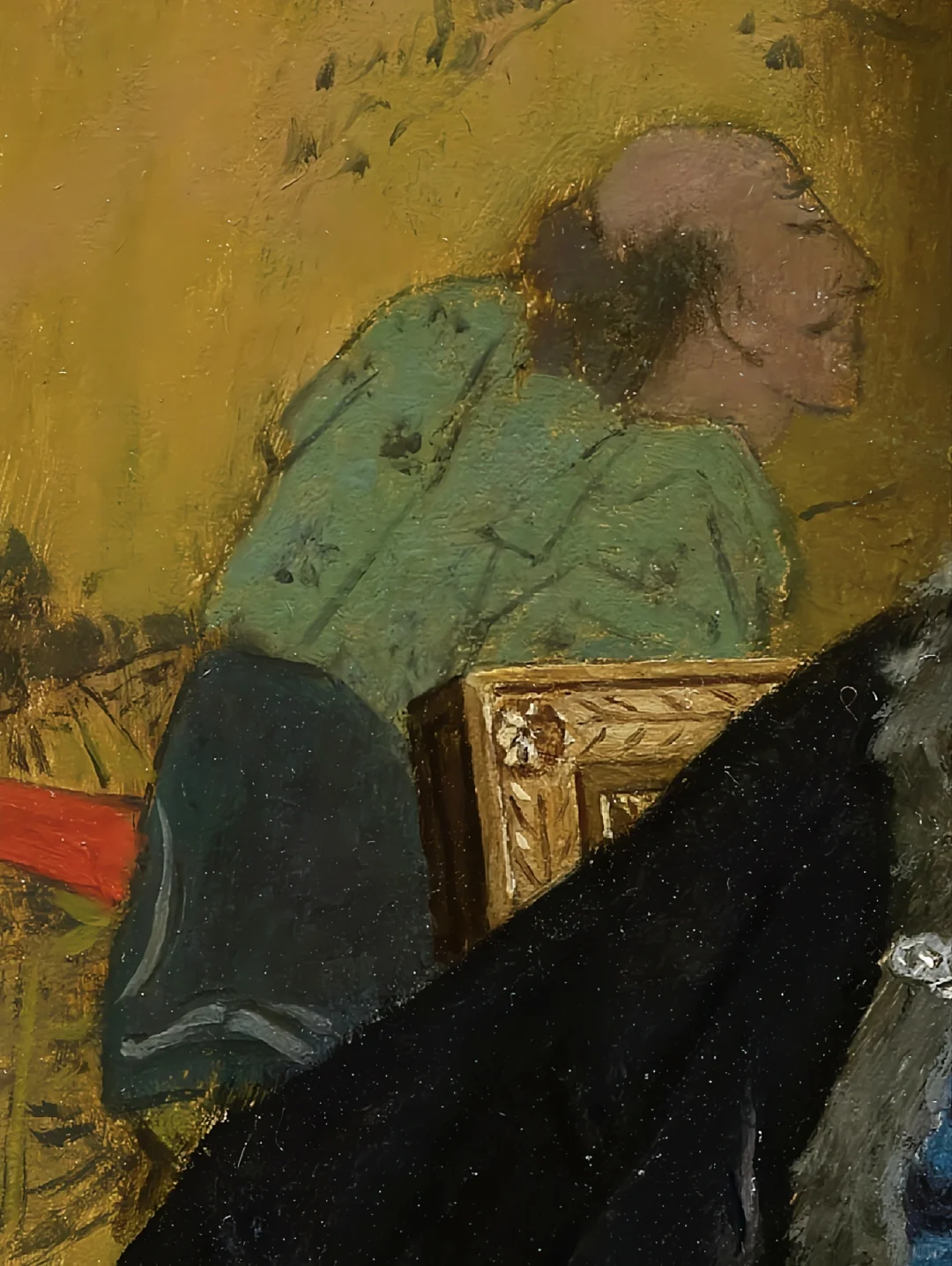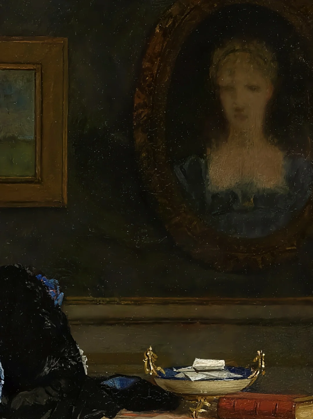 🍀《蓝裙子》又名《公爵夫人》,最早在1867年巴黎世界博览会上展出。以一位身穿豪华蓝色裙子的已婚贵族女子为主角。她可能刚刚从某个聚会的场所回来,身上的黑色披风还没有退去,金色华贵的手套也只脱掉一只。她脚边散落着打开的信封,手上攥着那封信,脸扭到右边的墙上,那里挂着一幅女子的肖像画。