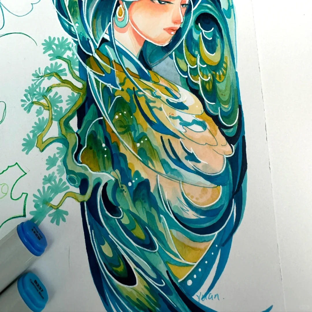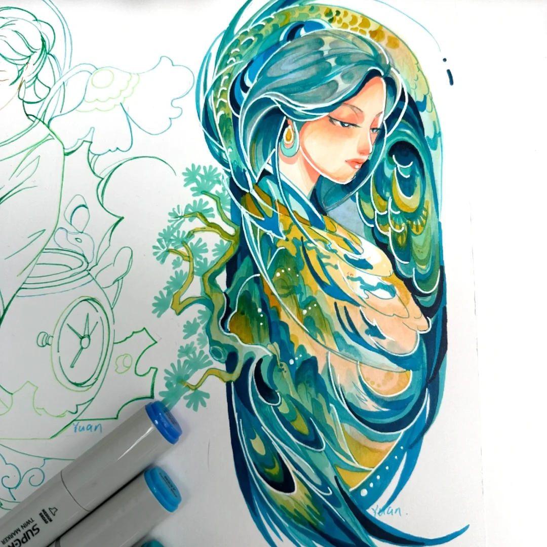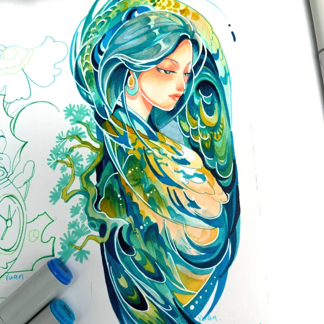 马克笔手绘系列直播—文物拟人主题(原创) 第一场直播:文物拟人—《千里江山图》4.16 第二场直播:文物拟人—《非遗:服饰云肩》4.17 第三场直播:文物拟人—《非遗:景泰蓝》4.18 文物拟人,即可对人物塑造进行练习,也可对文物中的色彩及纹样进行提取概括学习。当我们将文物与人物相结合时,可以采用多种的图创方法,如同构并构,置换等手法。利用S形和C形等大曲线构图,将其他辅助元素与主体元素相结合,会更加自然生动。 大家还想要什么文物进行拟人化的可以评论区告诉我哦~