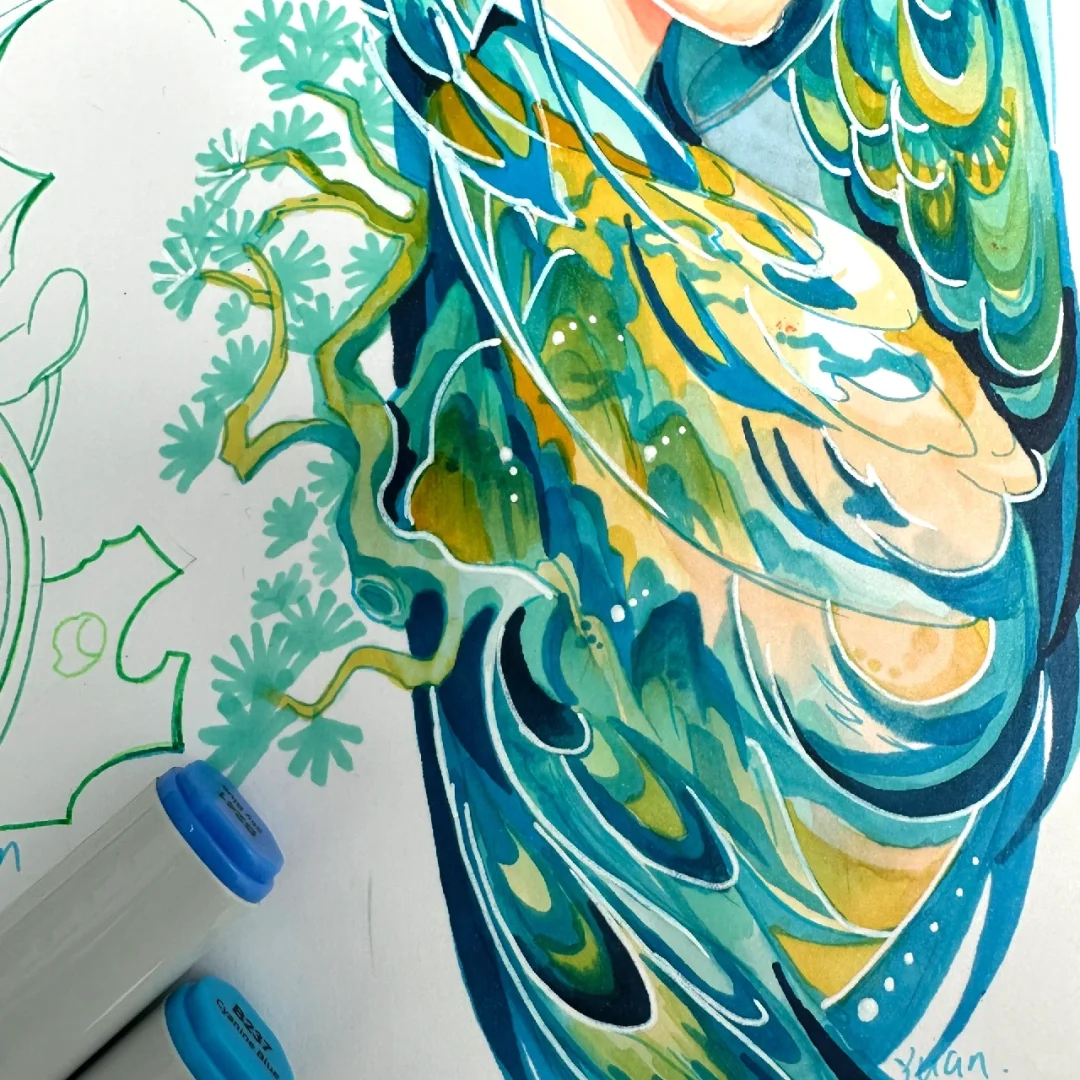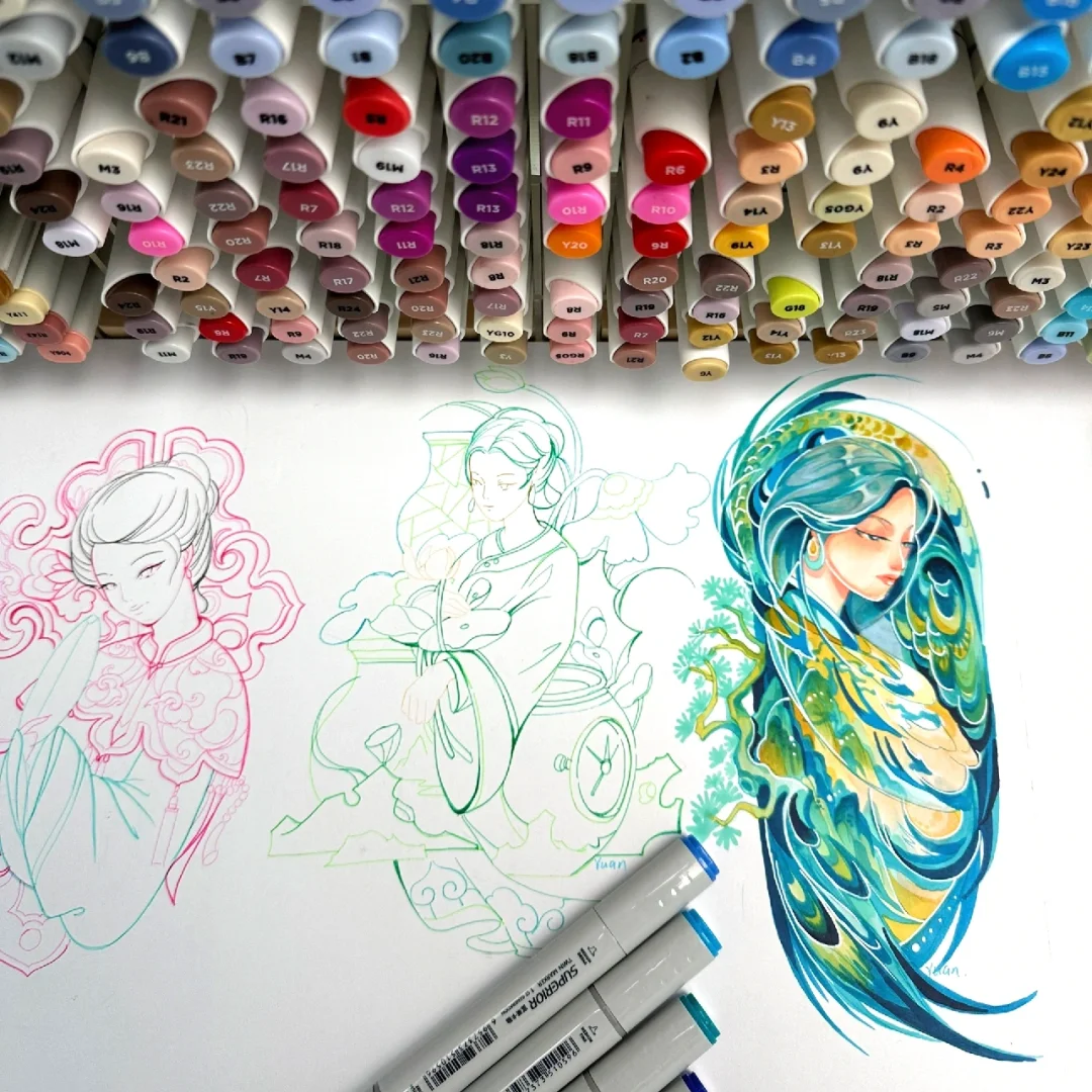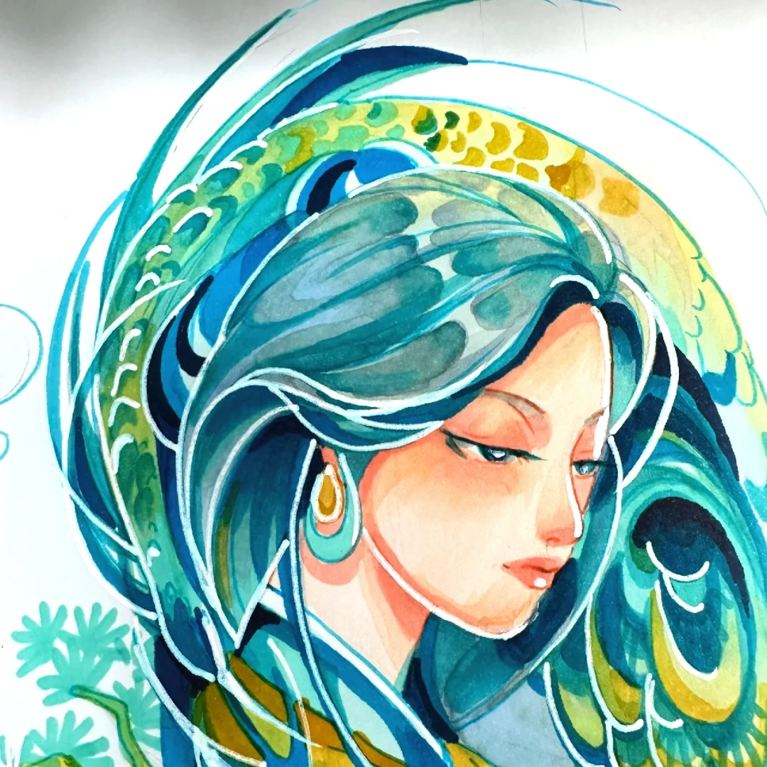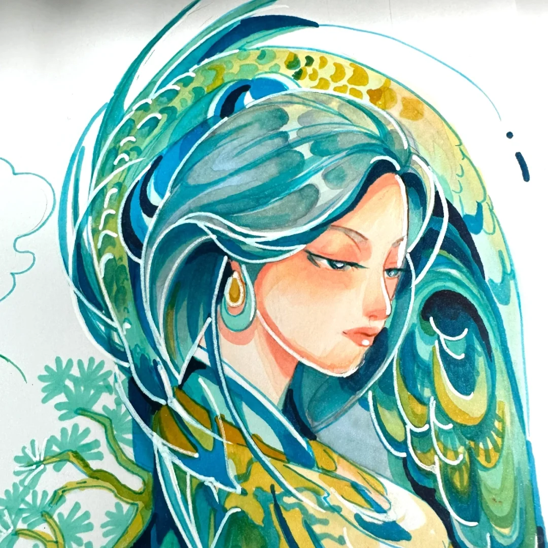 马克笔手绘系列直播—文物拟人主题(原创) 第一场直播:文物拟人—《千里江山图》4.16 第二场直播:文物拟人—《非遗:服饰云肩》4.17 第三场直播:文物拟人—《非遗:景泰蓝》4.18 文物拟人,即可对人物塑造进行练习,也可对文物中的色彩及纹样进行提取概括学习。当我们将文物与人物相结合时,可以采用多种的图创方法,如同构并构,置换等手法。利用S形和C形等大曲线构图,将其他辅助元素与主体元素相结合,会更加自然生动。 大家还想要什么文物进行拟人化的可以评论区告诉我哦~