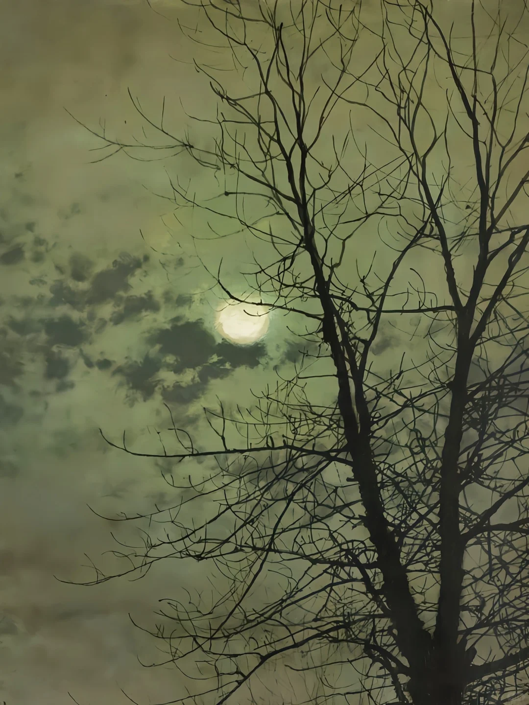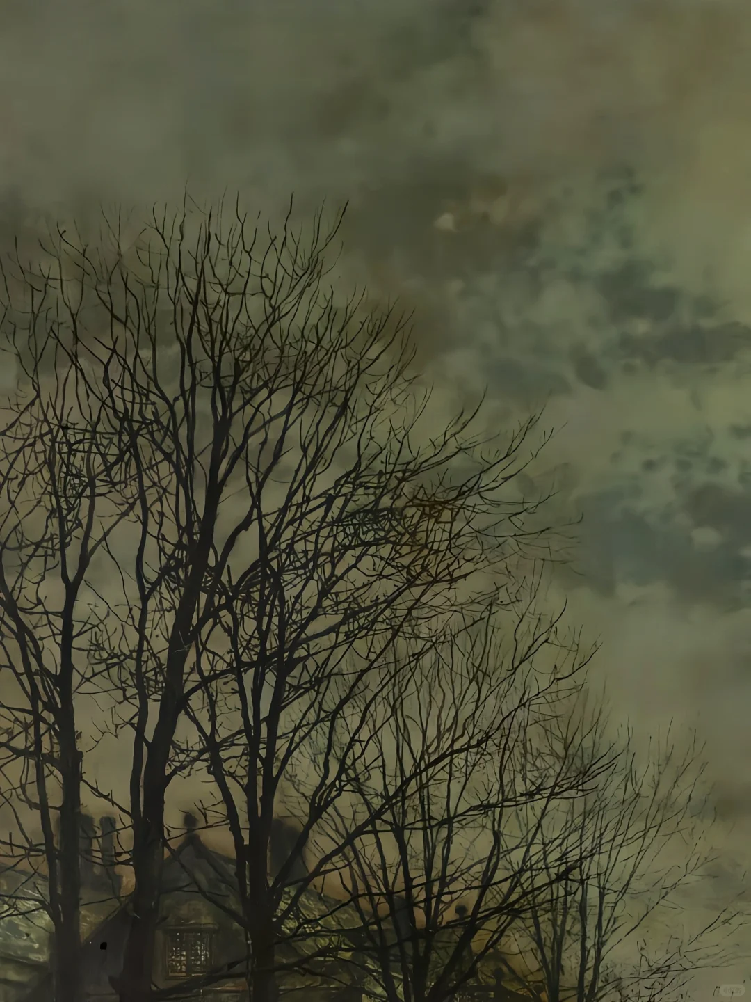 🍀时值深秋,树木落光了叶子,在孔雀石绿的天空的映衬下显得格外苍劲,形成了丝状图案,勾勒出蜿蜒曲折的道路曲线。傍晚的月亮正圆的时候,在天空云层的映衬下,投射出寒冷而灿烂的银色光芒。夜幕降临,高墙后优雅宅邸中的居民躲在温暖的煤气灯的光线中。人造的金色光芒与永恒之月的空灵壮美形成鲜明对比。