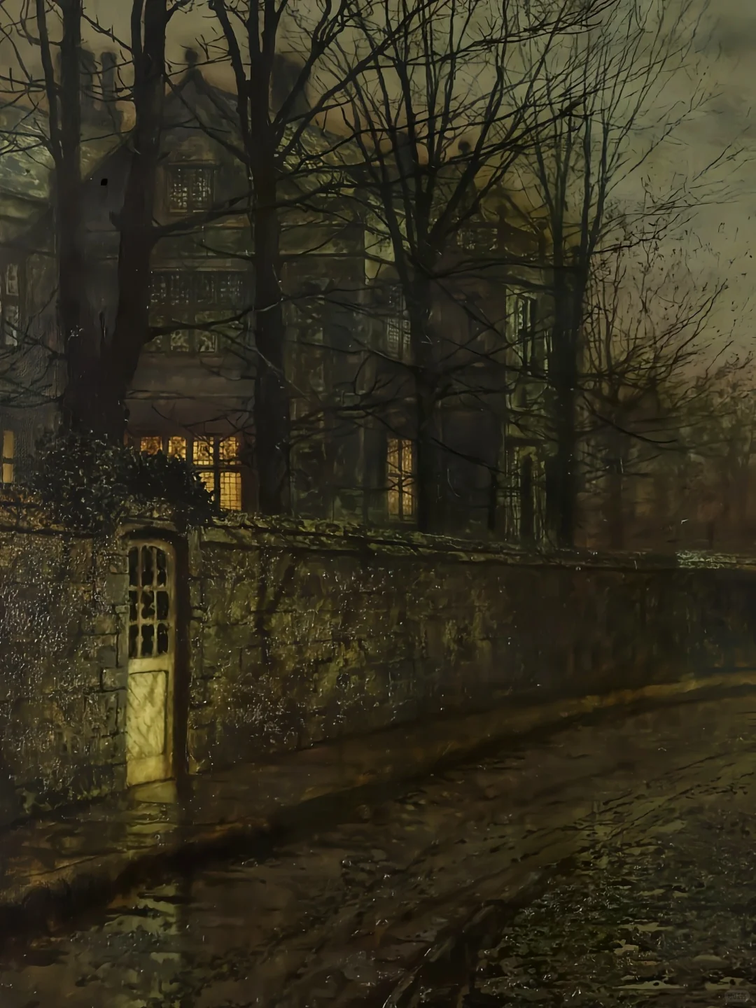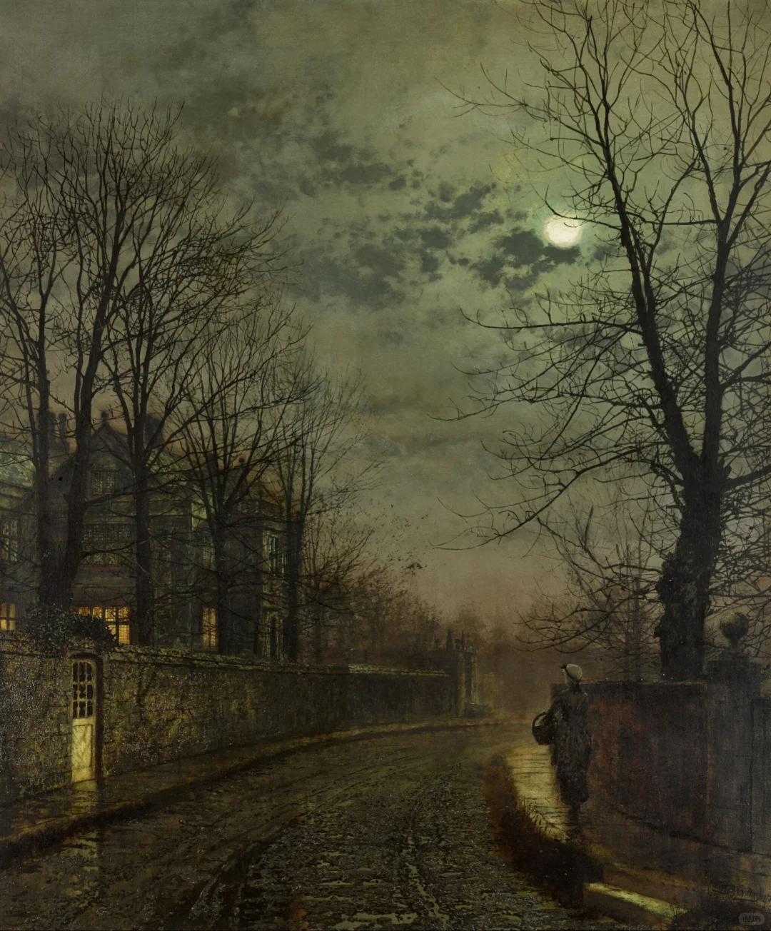 🍀这幅画的标题增添了对旧时光的怀念之情,暗示着对时光流逝的遗憾。不过,也有一种感觉是,一切都没有什么变化--老宅依然如故,人们依然来来往往,月亮也在不断更新。每过一年,树木都会落叶,古老的墙壁上也会多长出一些青苔,但从根本上说,这里的景色还是一成不变的。这就是格里姆肖画作的永恒魅力所在,因为即使在今天,利兹郊区的景象依然如故。