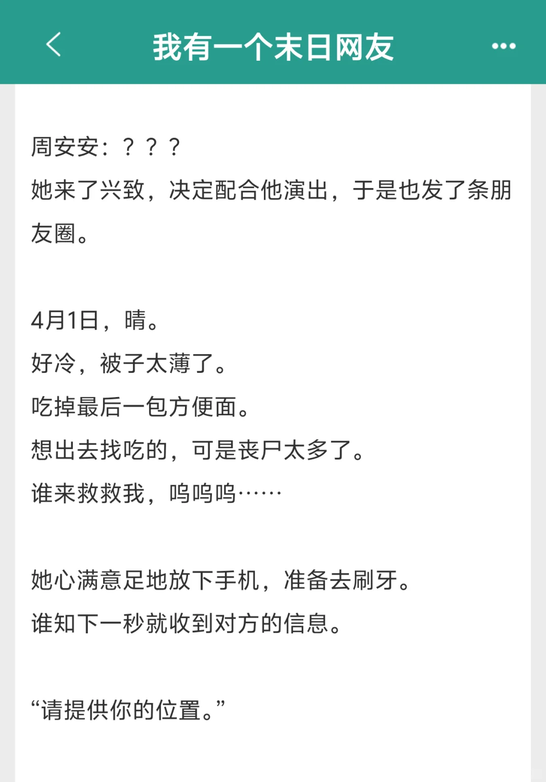 我有一个末日网友 作者·奶香味哒 周安安的手机被雷劈了,恢复后微信里多出一个 陌生人。 本打算删掉,陌生人却发了朋友圈。 4月1日,晴。 空气污染严重,气温-10℃。 吃粥,咸鸭蛋即将耗尽。 丧尸较多,不宜外出。 周安安:??? 她来了兴致,决定配合他演出,于是也发了条朋 友圈。 4月1日,晴。 好冷,被子太薄了。 吃掉最后一包方便面。 想出去找吃的,可是丧尸太多了。 谁来救救我,呜呜呜····· 她心满意足地放下手机,准备去刷牙。 谁知下一秒就收到对方的信息。 “请提供你的位置。”