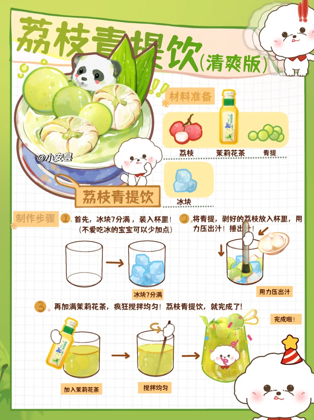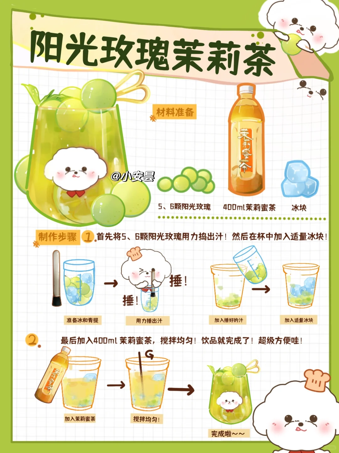 首先,尝试一下清爽的阳光玫瑰葡萄茶,给你带来一股夏日清凉!🌹🍇接着,自制青提冰粉,超级适合在炎炎夏日享受!🥤❄️ 快来自己动手制作这些饮品,感受阳光下的小确幸吧!✨