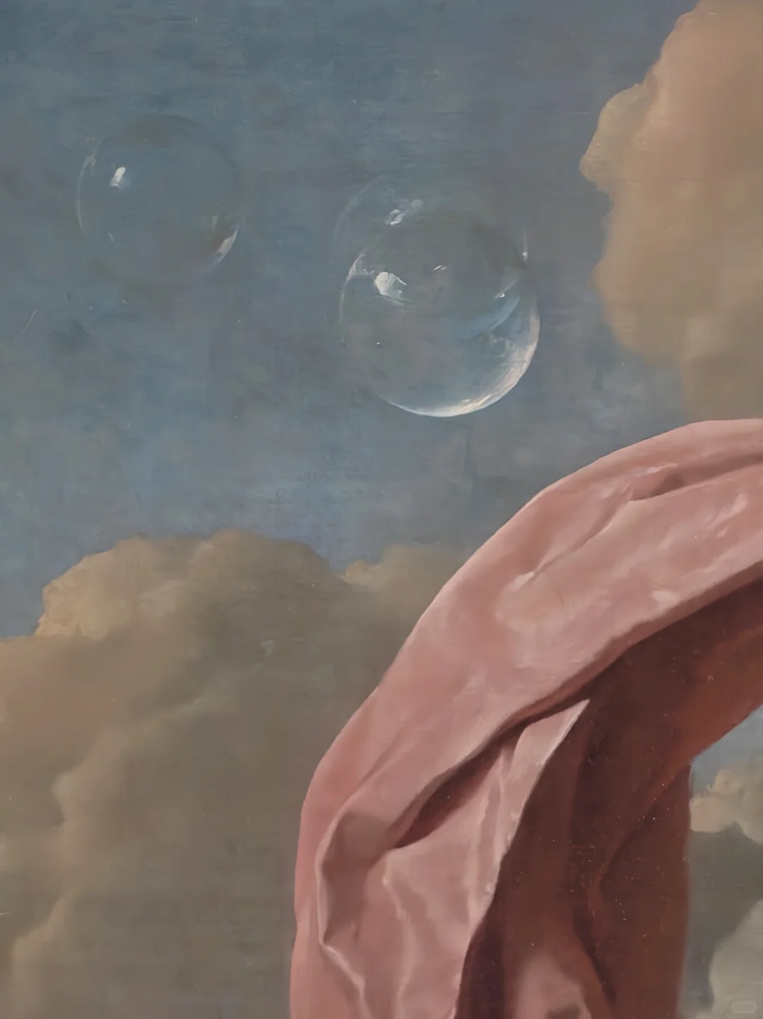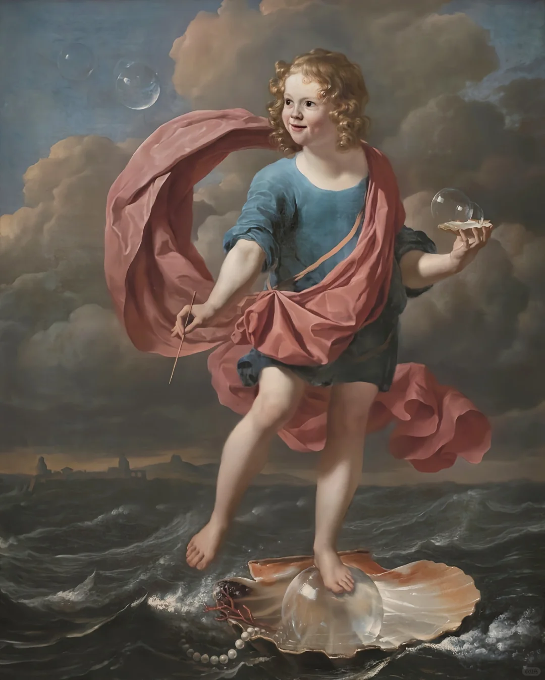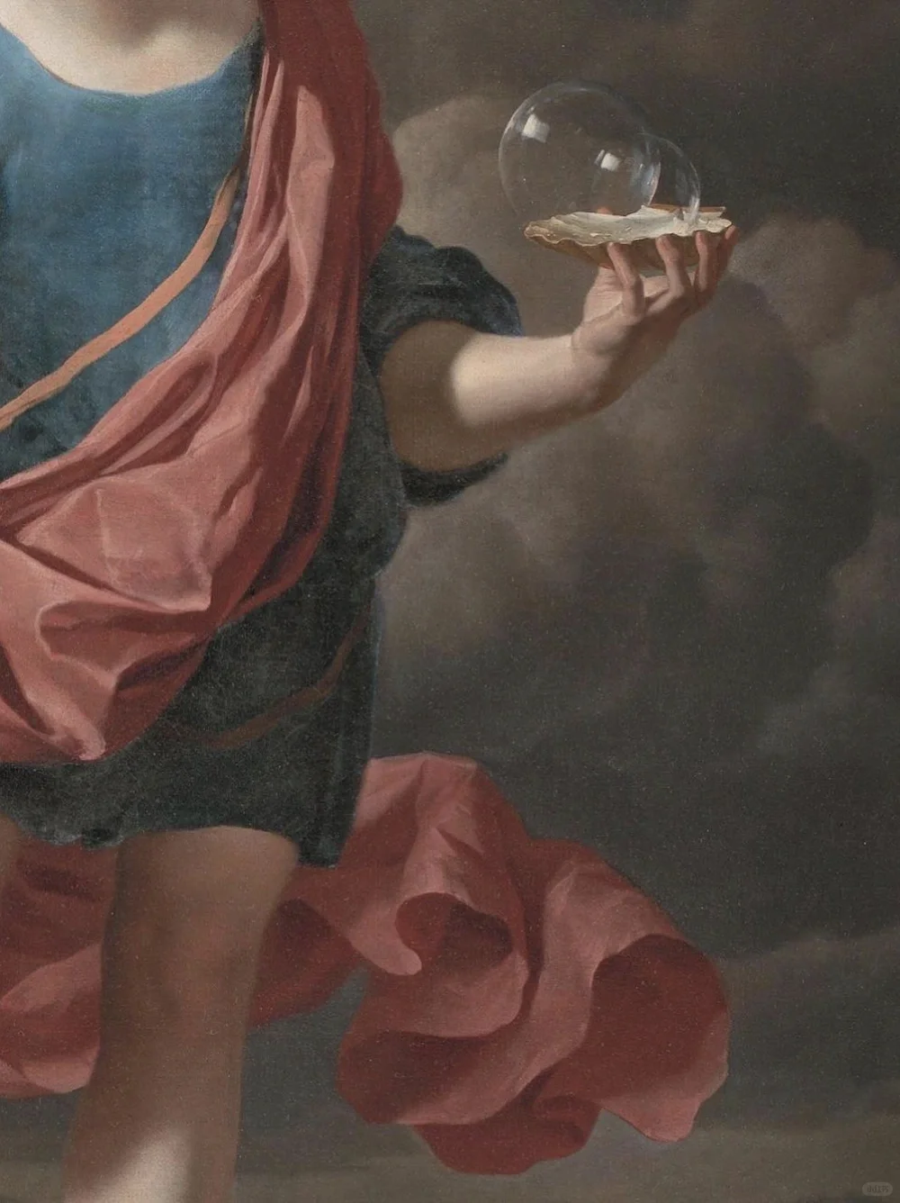 🍀这幅作品结合了17世纪的两个著名比喻:福尔图纳(Fortuna)(吉祥女神,在球上荡漾着波浪)以及“Homo Bulla (est)”(人是一个泡泡)的概念,这个概念通常被描绘成一个吹肥皂泡的孩子。