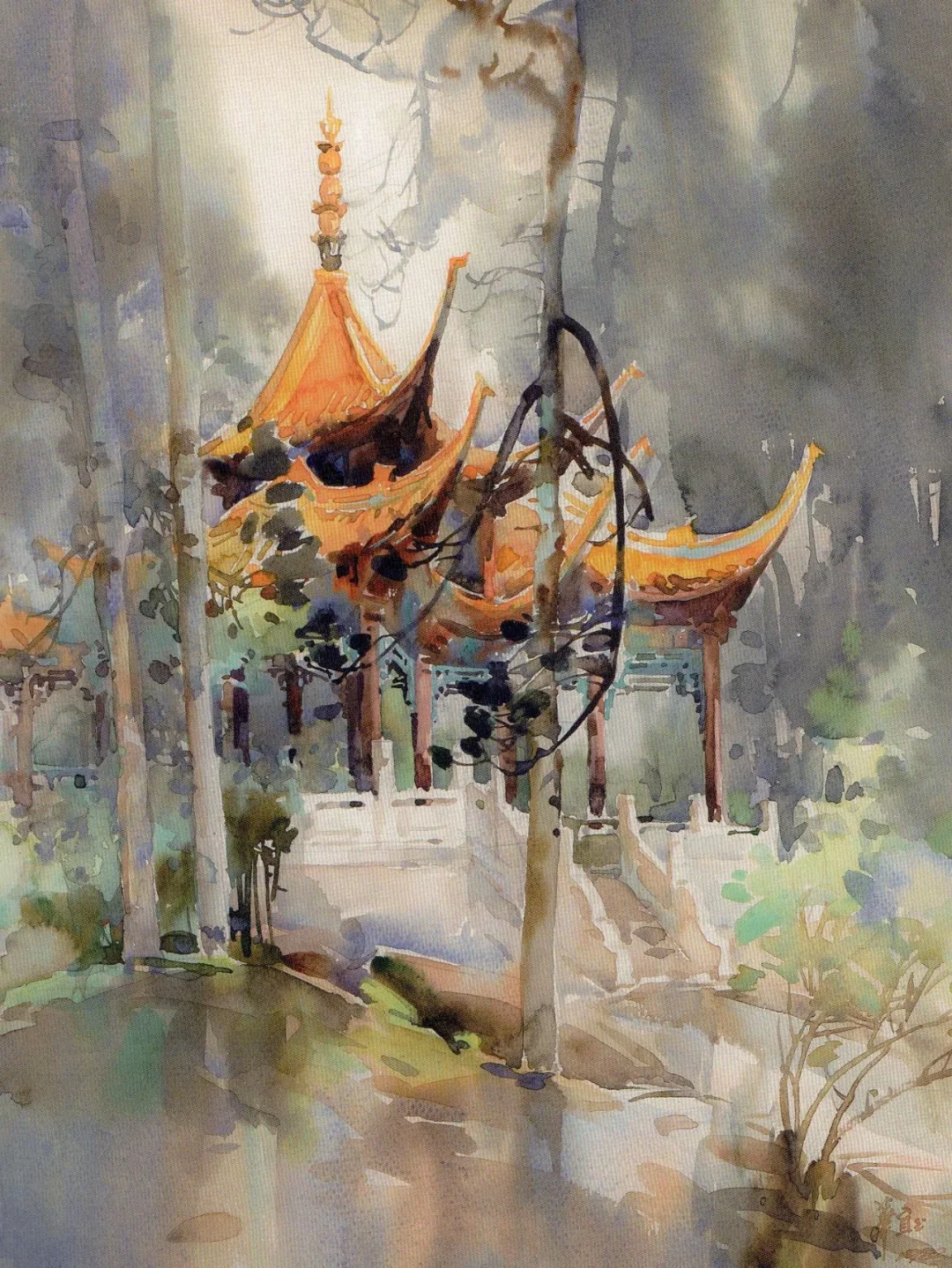 🍀华宜玉画建筑水彩画,一是强调表现建筑物的结构严谨、规矩;二是强调用色彩表现光影对照的鲜明、洒脱;三是强调笔触的运用,点、线、面的表现坚实有力,生动准确;四是强调水分的运用,虚虚实实渗化多变,使建筑主体置于协调的幽美环境之中,既是建筑水彩画,又是高雅的水彩艺术。