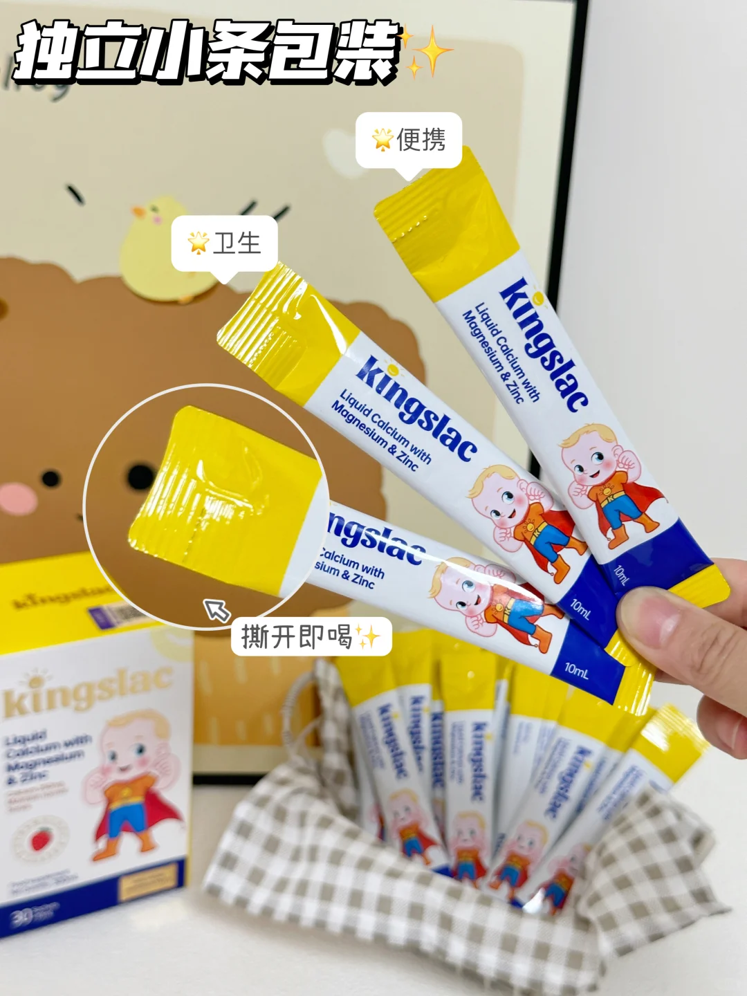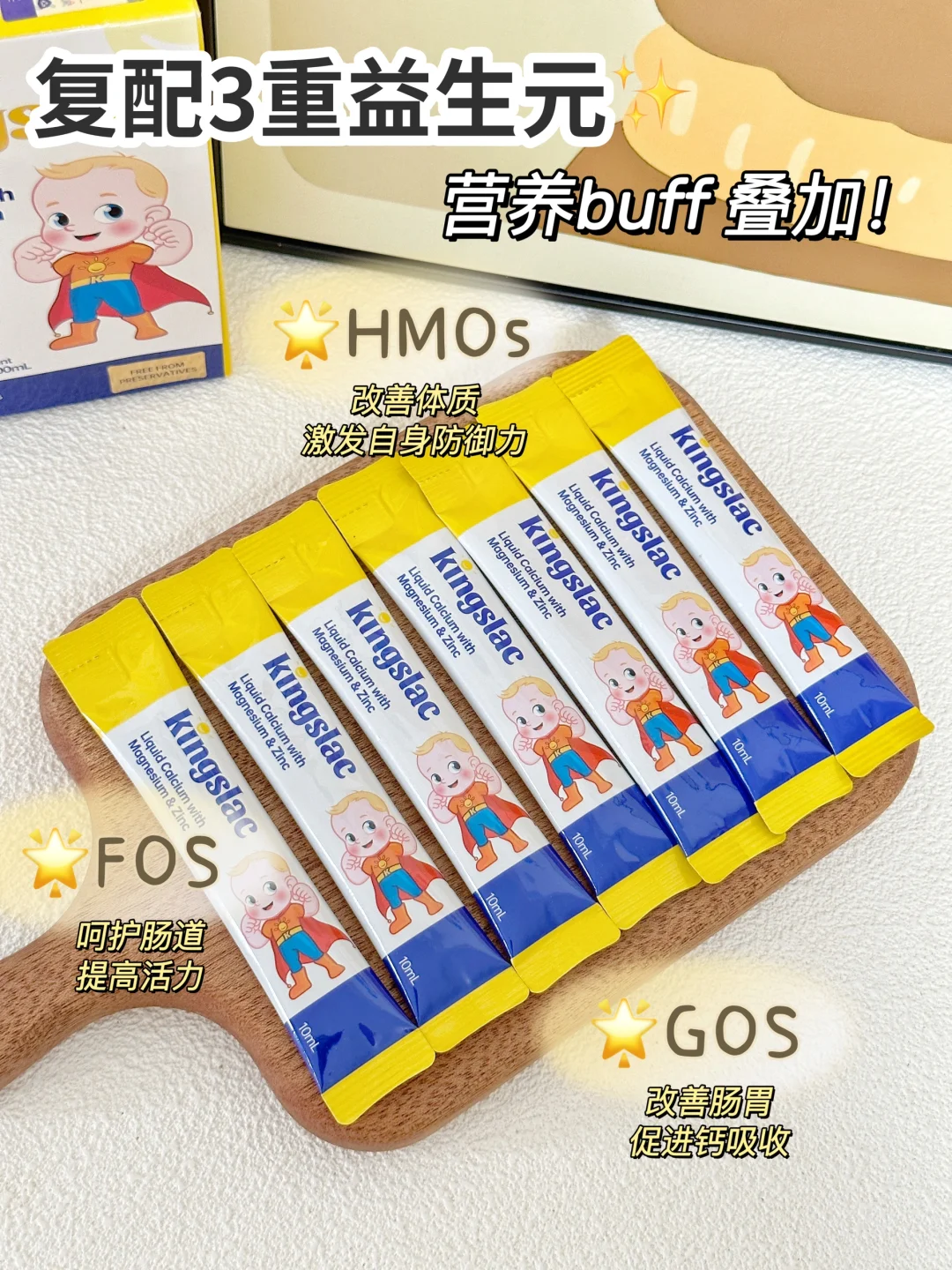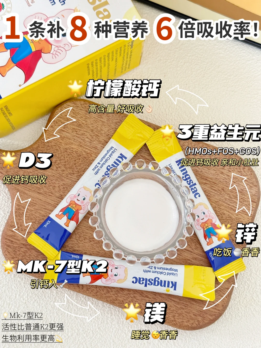 我们家大宝是个挑食的犟种 跟同龄比起来就像个小竹竿! 所以纯靠🍲补不太行了,我后面做了功课又给他安排上了Kingslac钙镁锌 - 作为新一代成分党妈妈 我可是🔍了好久,生怕错过一点小问题 还好,这一款可以直接亮绿灯💡! 没有防腐剂、没有香精、色素跟糖, 给娃吃可以妥妥放心了~ - 当然了,还得看它的营养成分符合预期不? 这里面含有8种营养!6重的吸收率👍🏻 所需营养元素一次补齐,除了钙镁锌,额外还有D3(促进钙吸收)跟MK-7型K2(生物利用率超高) 隔离搭配,提高吸收率!主打一个把钙补到🦴里~ - 复配的HMOs➕FOS➕GOS三重益生元,亲和宝宝小肚肚,促进钙吸收的同时还能改善肠胃功能,尤其是HMOs还是母乳中的成分,增强免疫力🏃‍♂没得说,特别适合黛玉体质的宝宝~ - 一条含钙量就有250mg,直接满足宝宝的每日需求~ 独立包装,一次一条真的很方便~ 柠檬酸钙好吸收,不用担心刺激宝宝肠胃 液体钙小月龄宝宝也能喝,酸酸甜甜的草莓🍓味道也是让娃欲罢不能 - 再也不用因为挑🍲,担心营养跟不上就补一大堆!真的很省妈! 趁着618我赶紧又囤了好几盒回来!!