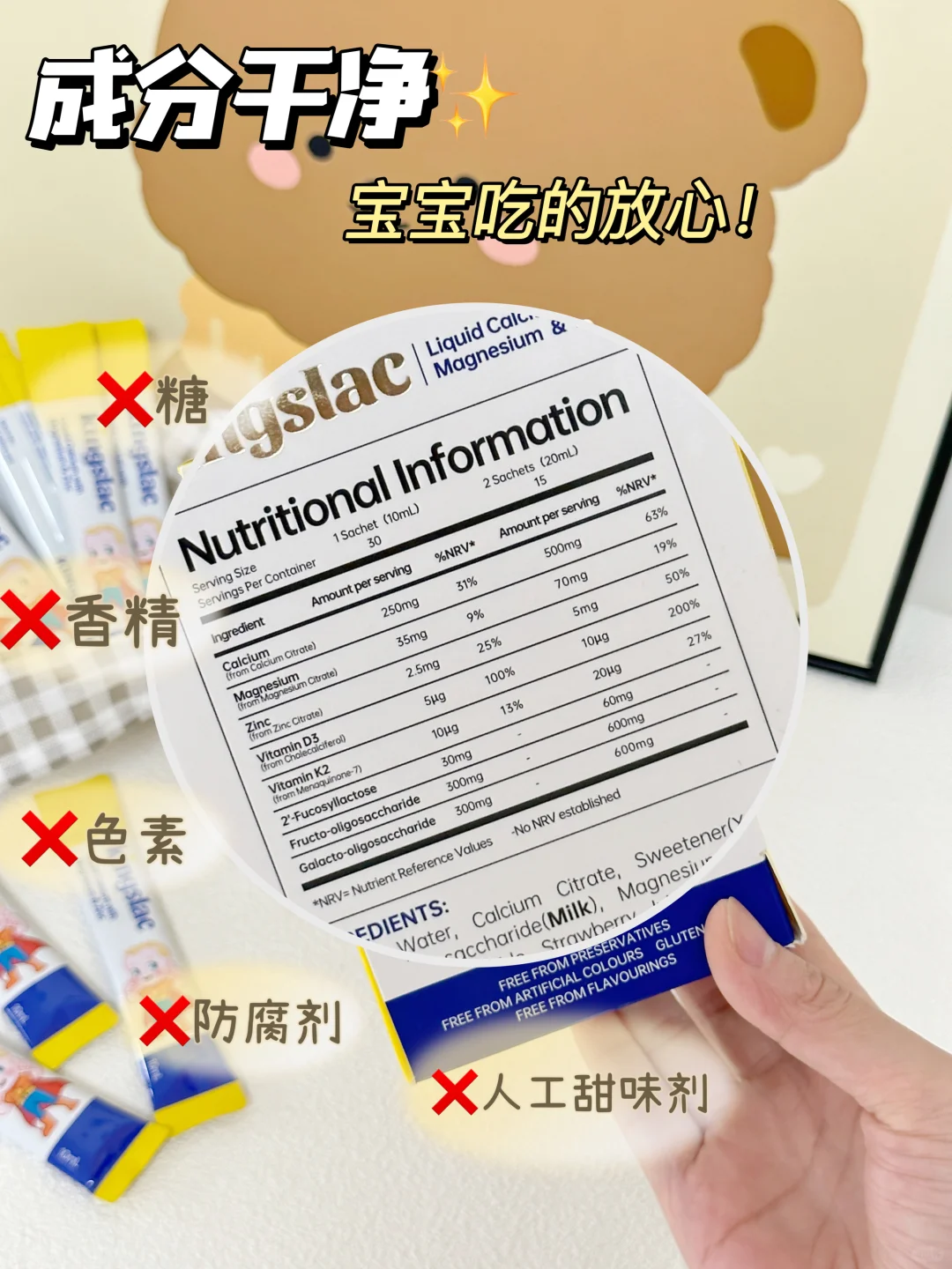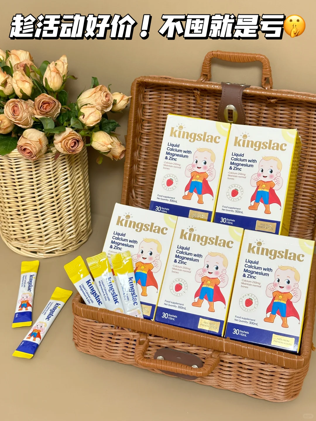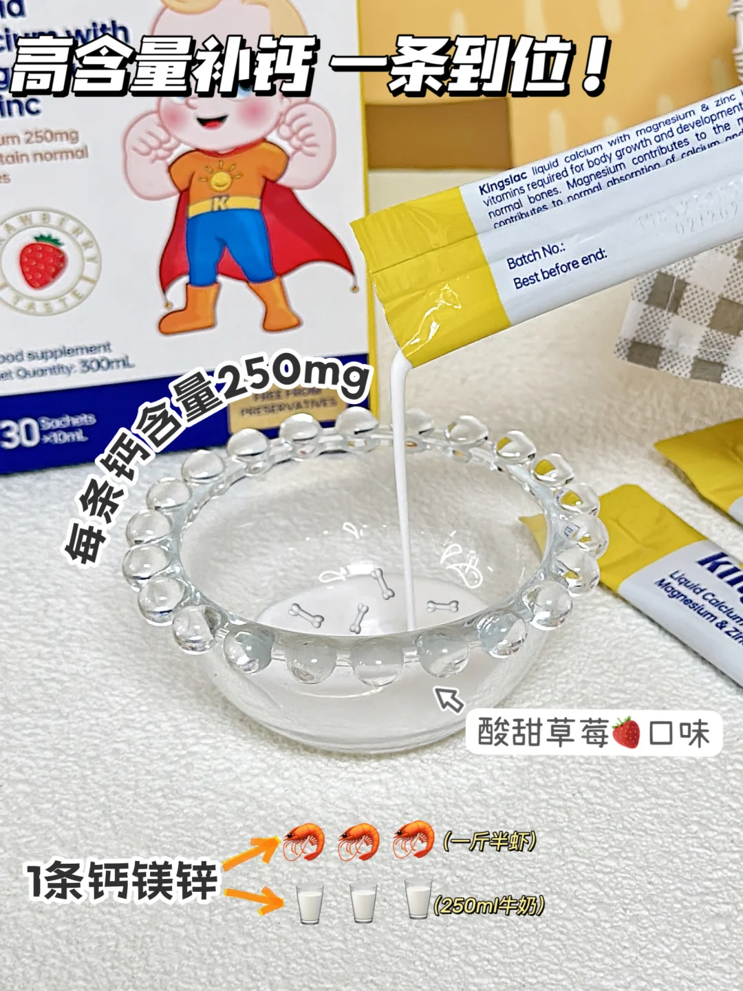 我们家大宝是个挑食的犟种 跟同龄比起来就像个小竹竿! 所以纯靠🍲补不太行了,我后面做了功课又给他安排上了Kingslac钙镁锌 - 作为新一代成分党妈妈 我可是🔍了好久,生怕错过一点小问题 还好,这一款可以直接亮绿灯💡! 没有防腐剂、没有香精、色素跟糖, 给娃吃可以妥妥放心了~ - 当然了,还得看它的营养成分符合预期不? 这里面含有8种营养!6重的吸收率👍🏻 所需营养元素一次补齐,除了钙镁锌,额外还有D3(促进钙吸收)跟MK-7型K2(生物利用率超高) 隔离搭配,提高吸收率!主打一个把钙补到🦴里~ - 复配的HMOs➕FOS➕GOS三重益生元,亲和宝宝小肚肚,促进钙吸收的同时还能改善肠胃功能,尤其是HMOs还是母乳中的成分,增强免疫力🏃‍♂没得说,特别适合黛玉体质的宝宝~ - 一条含钙量就有250mg,直接满足宝宝的每日需求~ 独立包装,一次一条真的很方便~ 柠檬酸钙好吸收,不用担心刺激宝宝肠胃 液体钙小月龄宝宝也能喝,酸酸甜甜的草莓🍓味道也是让娃欲罢不能 - 再也不用因为挑🍲,担心营养跟不上就补一大堆!真的很省妈! 趁着618我赶紧又囤了好几盒回来!!