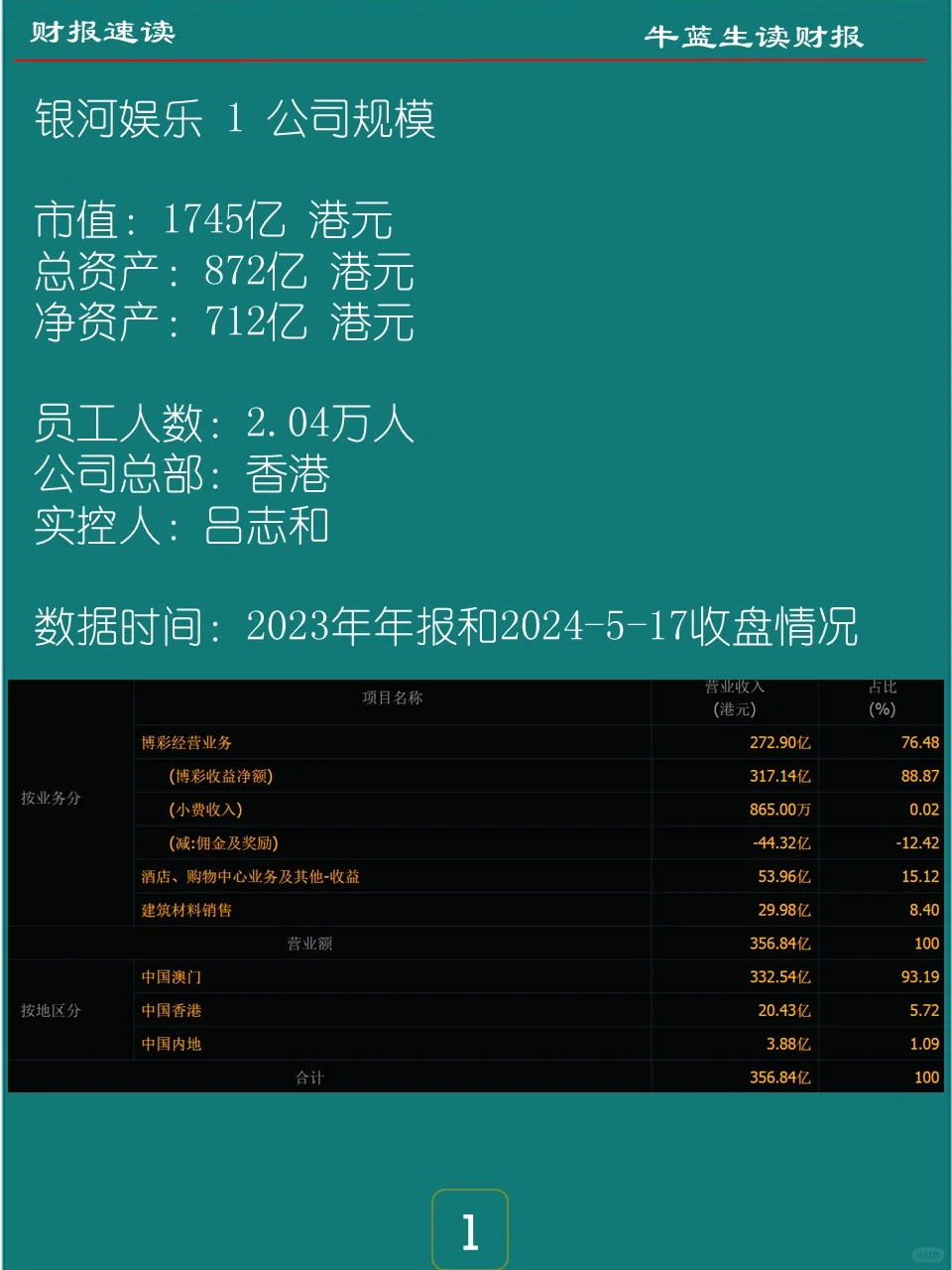 -按业务,博彩经营业务76.48%(273亿港元),酒店、购物中心业务及其他-收益15.12%(54亿港元),建筑材料销售8.40%(30亿港元)。
