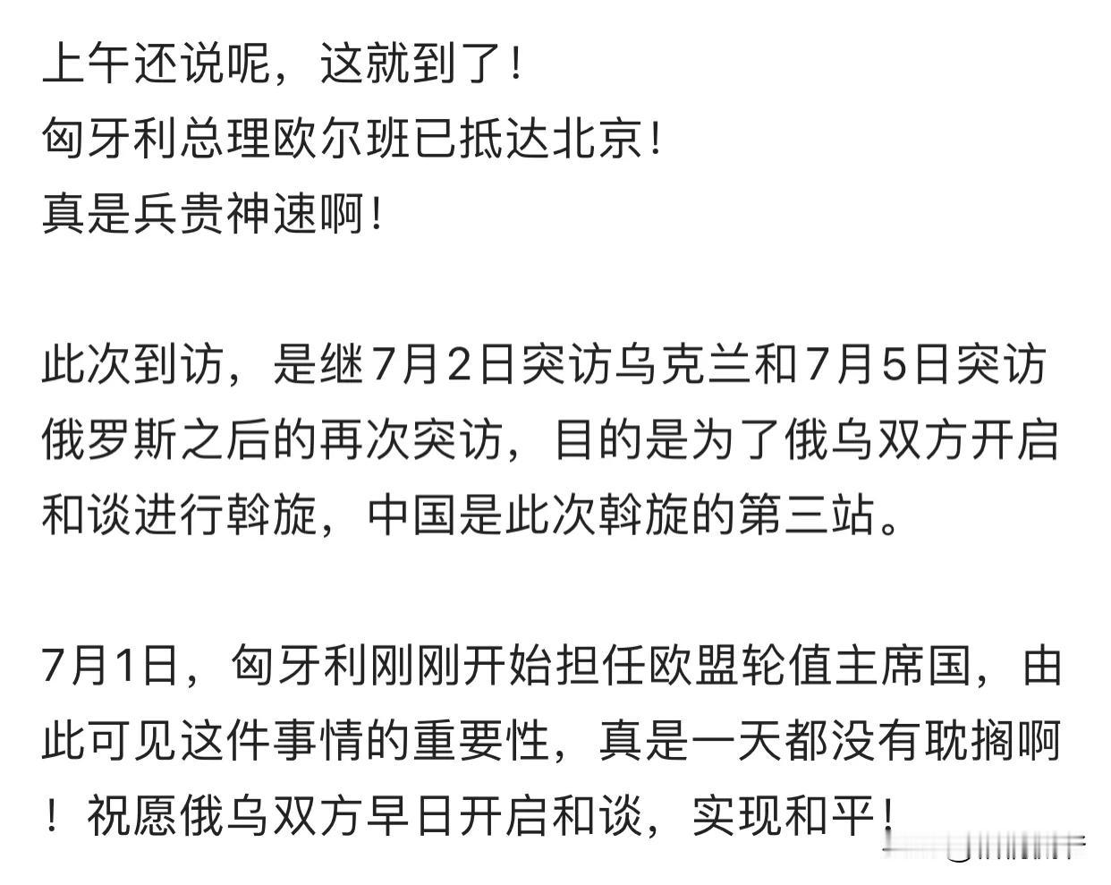 匈牙利总理欧尔班究竟是个什么人?他是个大忙人! 自从欧尔班担任欧盟轮值主席国以来,他就先后马不停蹄开始了穿梭外交,7月2日访问了乌克兰,与泽连斯基探讨了实现和平的可能性,欧尔班则表示愿意支持乌克兰经济现代化,此前,匈牙利一直反对援助乌克兰武器和资金。 紧接着,7月5日又突访了俄罗斯,与普京进行了深入沟通交流,尽管欧尔班介绍了匈牙利和欧盟在乌克兰问题上的立场,但此举仍然在欧盟与北约内部都引起了强烈的反弹与不满。 7月8日,欧尔班又风风火火地赶到北京,开启其担任欧盟轮值主席国以来的第三站行程,而此次的重点依然是探讨实现和平的可能性,而欧尔班自己也将此行形象地喻为“和平使命3.0”,希望他这次能够有所收获,担负起作为欧盟轮值国主席的重任,为实现和平做出自己的贡献。 国家无论大小,都是国际社会的重要一员,都能够为实现世界和平做出自己应有的贡献,这是当代文明社会的重要特征。但是,以美国为首的西方国家,热衷于搞对立,煽动不同国家之间对抗,他们才是这个世界的乱源,还好向匈牙利这样的国家能够不畏强权,坚持客观中立的立场,为实现和平不辞辛劳、积极奔走,值得称赞! #欧尔班抵京发文配图华春莹接机##欧尔班访俄 欧盟反应强烈#