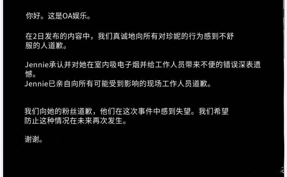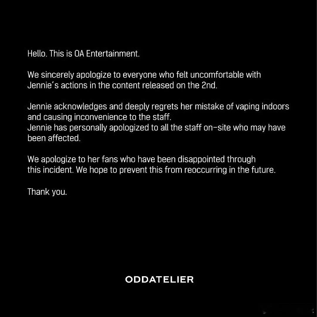 Jennie承认在室内吸电子烟,并表示给工作人员带来的不便她很抱歉,也为抽烟行为感觉到不舒服的人道歉。