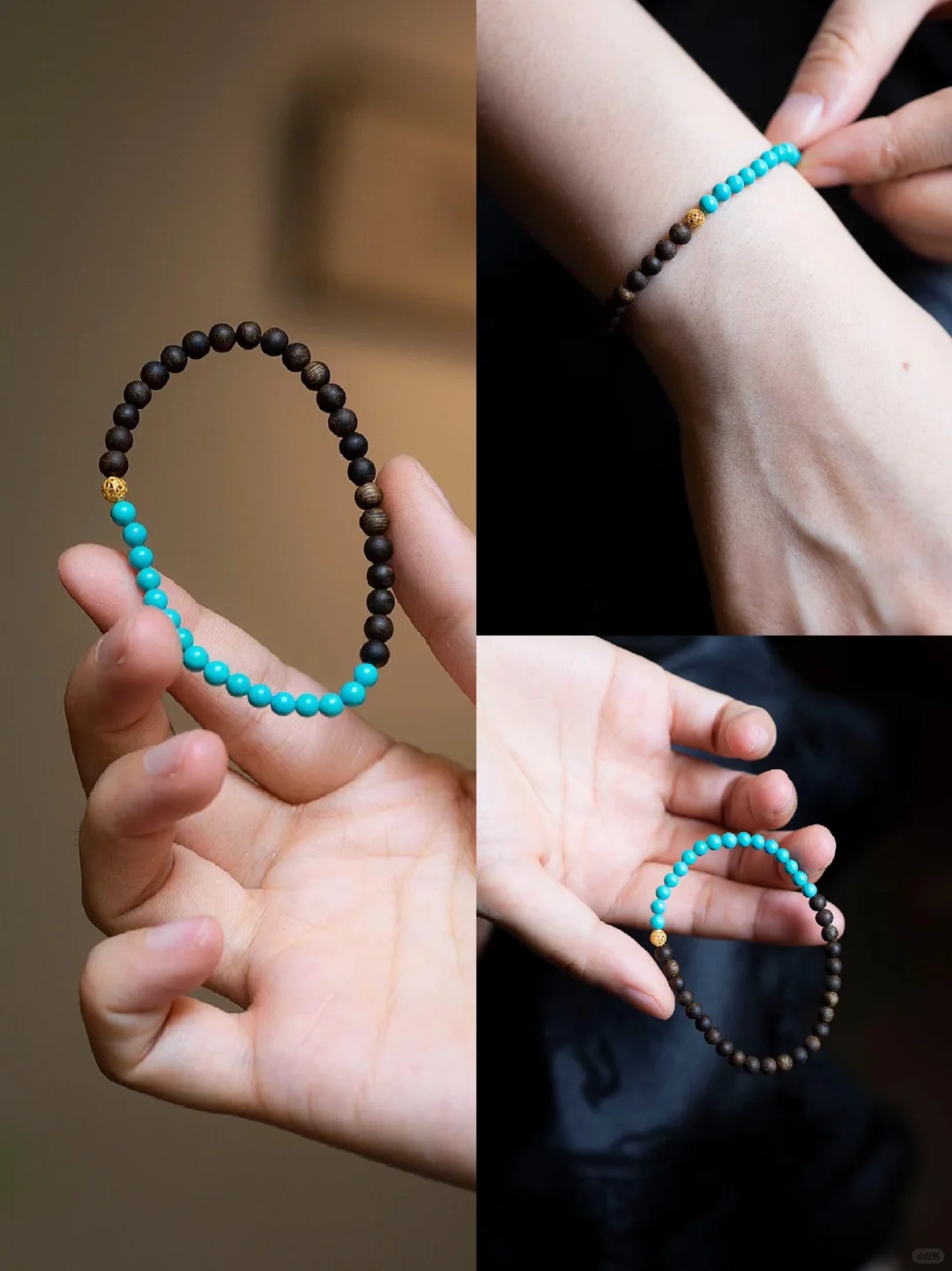 绝对是亮丽的颜色4mm小精品沉香手串 绿松石·18k金搭配,很阳光百搭