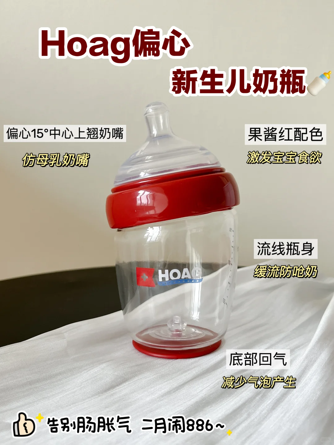 HOAG偏心奶瓶,它的偏心设计,15°离心上翘奶嘴,宝宝接受度高,而且是底部回气防胀气,喝奶时没有气泡,轻松度过二月闹~