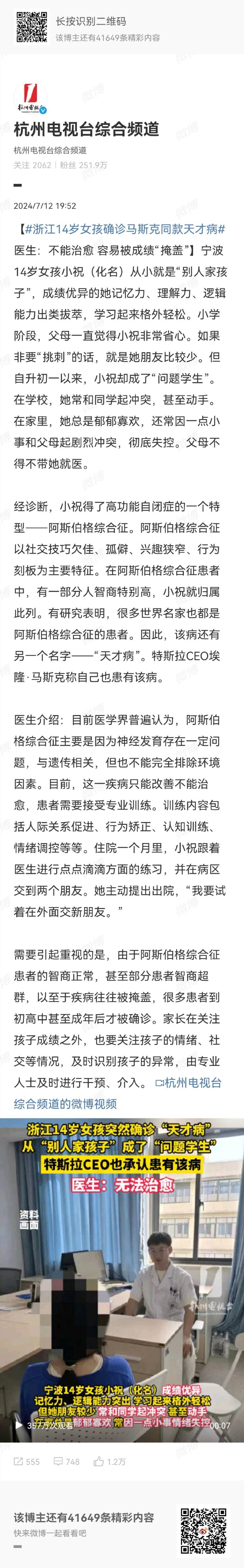 【浙江14岁女孩确诊马斯克同款天才病】媒体真是不忘抓住一切机会“炒作”。因为特斯拉CEO埃隆·马斯克称自己也患有该病,就将这种病说成“天才病”,实在是过于牵强附会了。