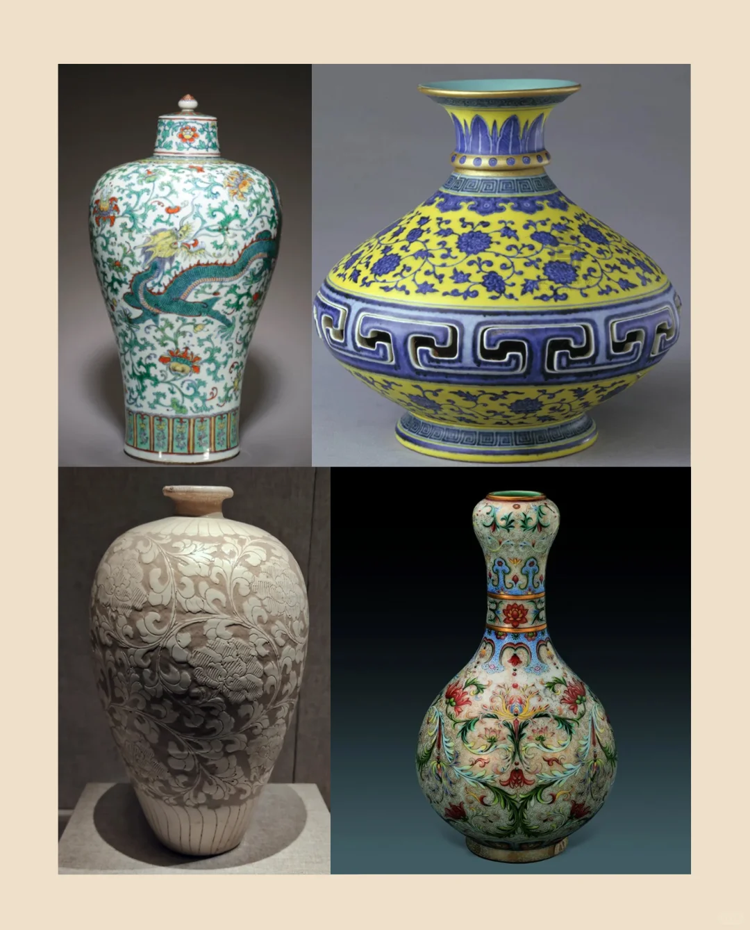 大家好,欢迎来到【某先生】课堂之中国传统纹样篇,今天为大家讲述的是关于《花瓶纹》的故事~ - 古代花瓶的造型和命名往往具有吉祥的寓意, 如葫芦瓶寓意“福禄”, 壁瓶装饰多寓有吉庆之意, 九桃瓶寓意“福寿长久” 。 - 花瓶中的“瓶”字与平安的“平”字谐音, 因此摆放花瓶象征着平安、平顺,甚至平步青云。 此外,花瓶插花也代表桃花运、爱情运,底部圆阔、 上部细窄的形状象征财富和圆圆满满 。