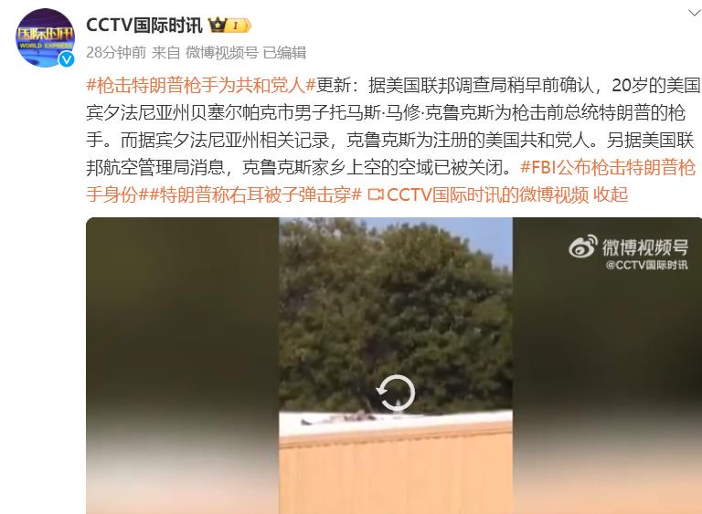 【枪击特朗普枪手为共和党人】据美国联邦调查局稍早前确认,20岁的美国宾夕法尼亚州贝塞尔帕克市男子托马斯·马修·克鲁克斯为枪击前总统特朗普的枪手。而据宾夕法尼亚州相关记录,克鲁克斯为注册的美国共和党人。另据美国联邦航空管理局消息,克鲁克斯家乡上空的空域已被关闭。