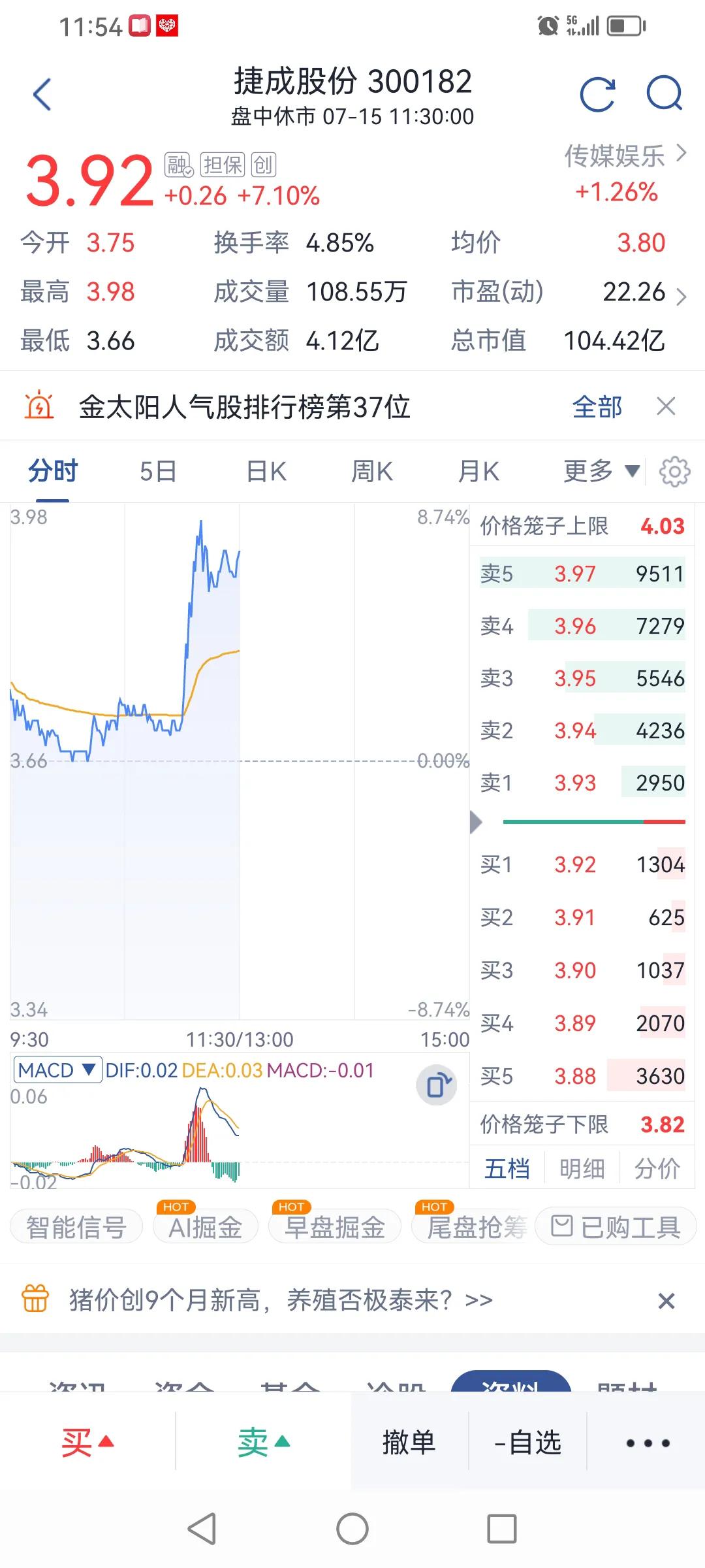 据有关消息,截至7月14日22时,2024年暑期档(6月1日-8月31日)总票房(含预售)突破42亿元。 受此影响,今天影视概念股大升。幸福蓝海、金逸影视、天地在线涨停。影视概念股涨幅前五名,三个涨停股未必买得到,而涨幅第四名唐德影视每股净资产不足1元。我决定留意:捷成股份。