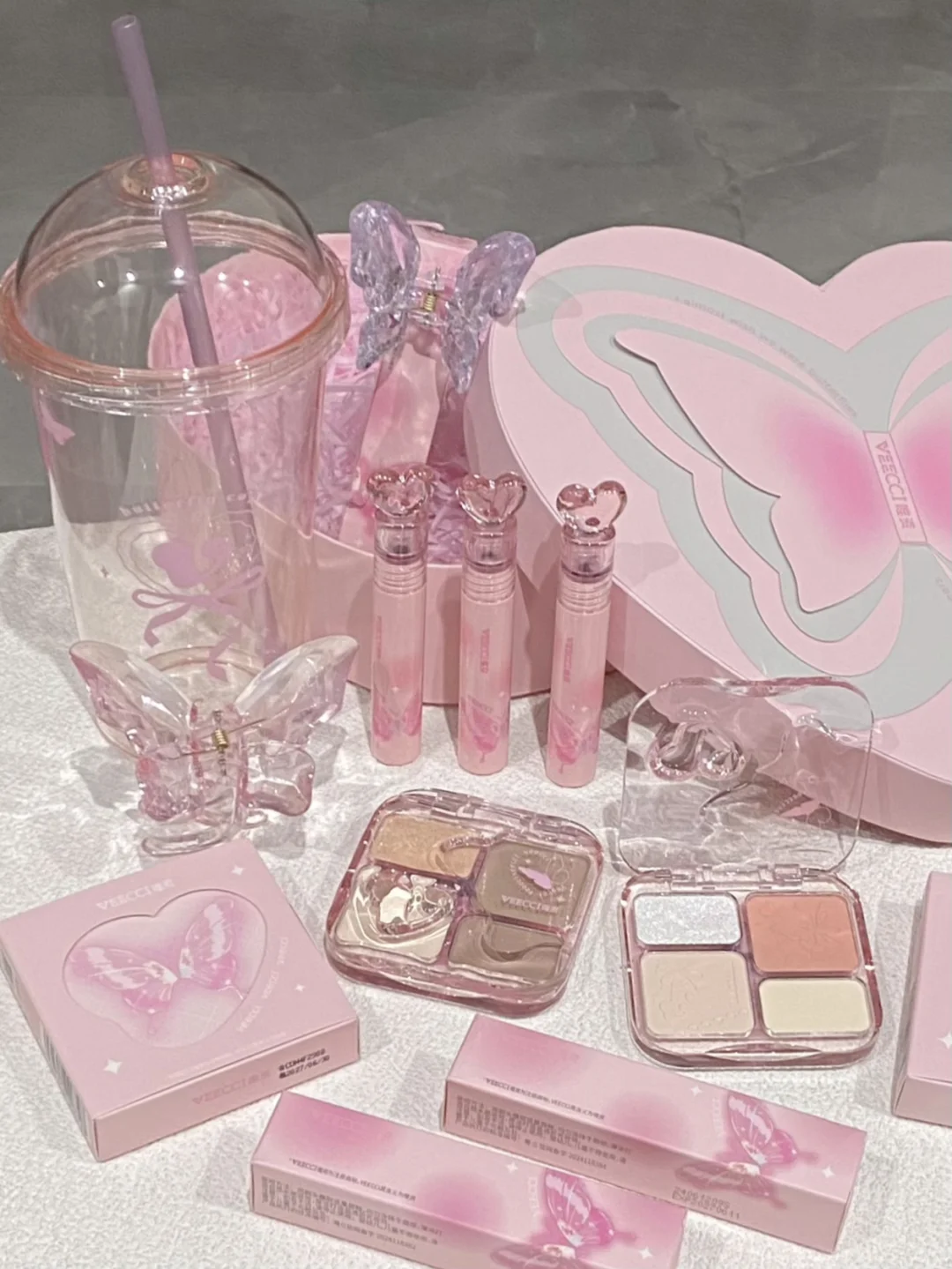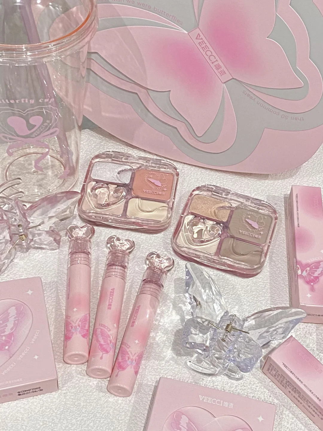 唯资设计师在吗! 你真的每一次每一次都让我惊喜!! 这次新品七夕礼盒粉粉的冰透蝴蝶好梦幻! 🫧周边水杯也很实用 新品面部综合盘和修容盘好米! 腮红眼影高光修容全搞定 不如说是全能盘! 调色也很自然 适合大多数人的肤色 VE01 甜莓粉 暧昧氛围感满满 新品唇釉的调色也很适合夏天! L03 琉璃 不挑皮的深玫瑰粉色 温柔气质拿捏! L06甜白桃 清透白桃橘粉 素颜也可涂!