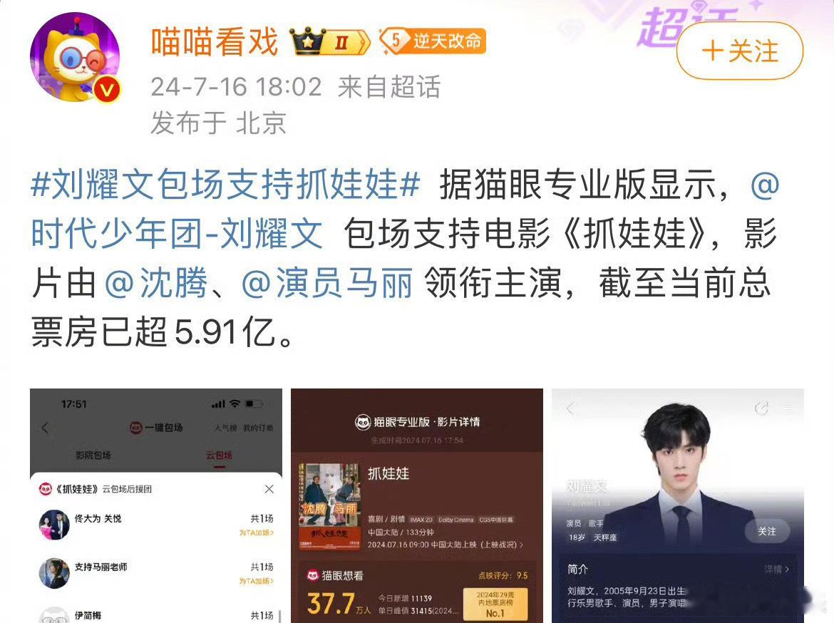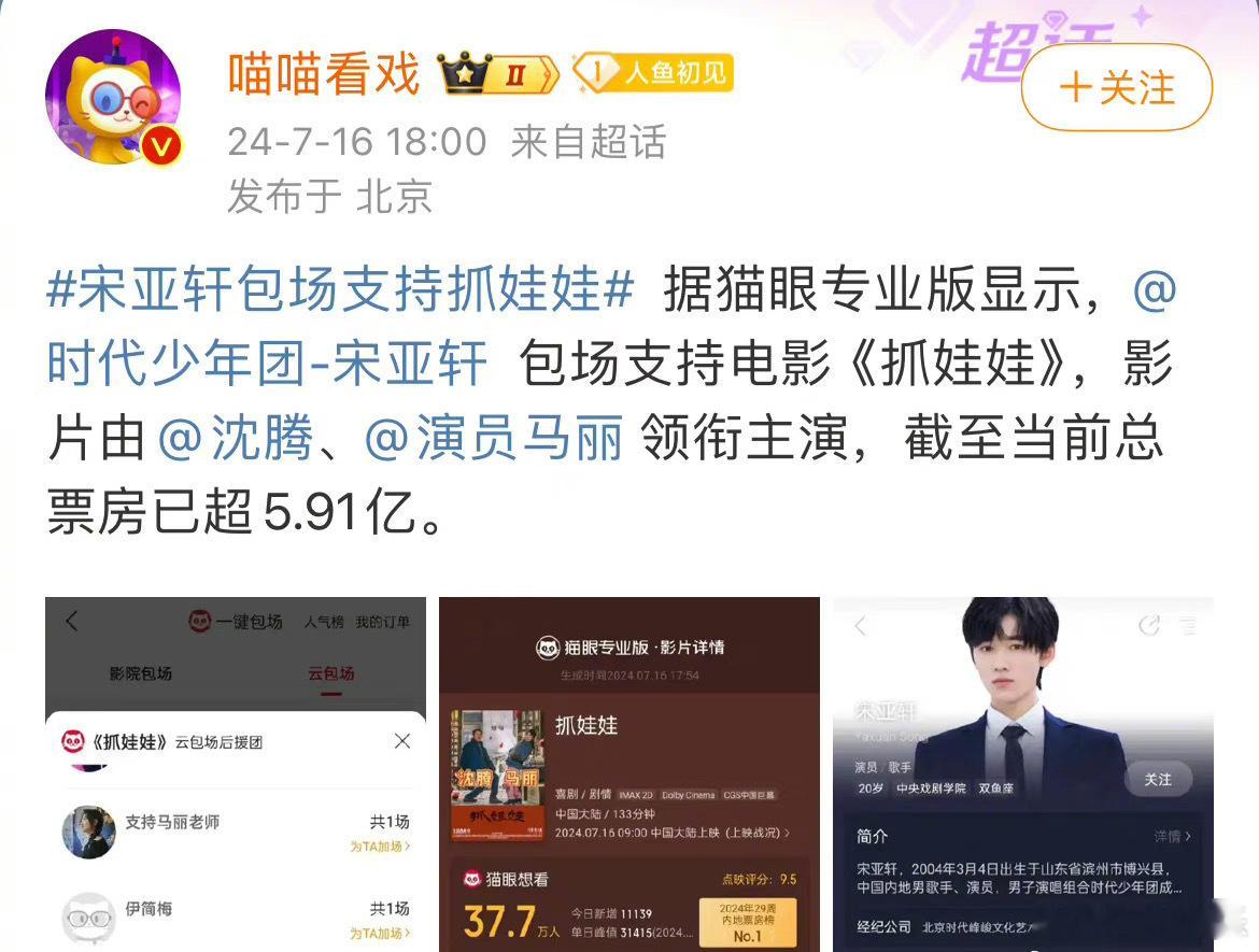 宋亚轩和刘耀文包场支持玛丽沈腾的新电影抓娃娃。一起走电影院去看电影吧。