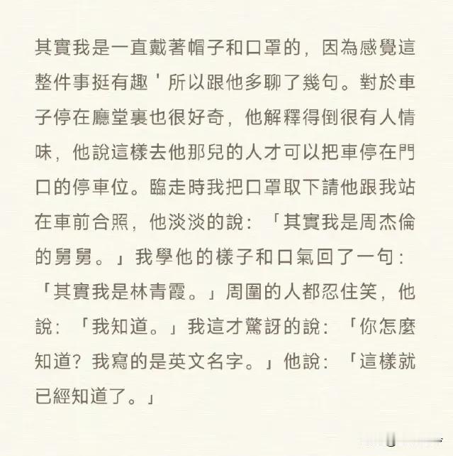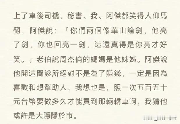周杰伦舅舅太搞笑了,开个私人诊所接待了林青霞,结果被林青霞的朋友怀疑是黑社会,可能会偷拍林青霞换衣服照片。事后虽然证明不是,但是周杰伦舅舅的业务水平确实一般,因为他诊断林青霞肋骨没裂,但后来林青霞去香港大医院复查才发现裂了两处,需要两个月才能痊愈。 另外,林青霞还觉得周杰伦舅舅开这个诊所不是为了赚钱,因为以诊所每次550台币的收费水准,她觉得周杰伦舅舅买不起停在诊所楼下的那辆豪华大轿车。(就不能是周杰伦买给舅舅的吗?)