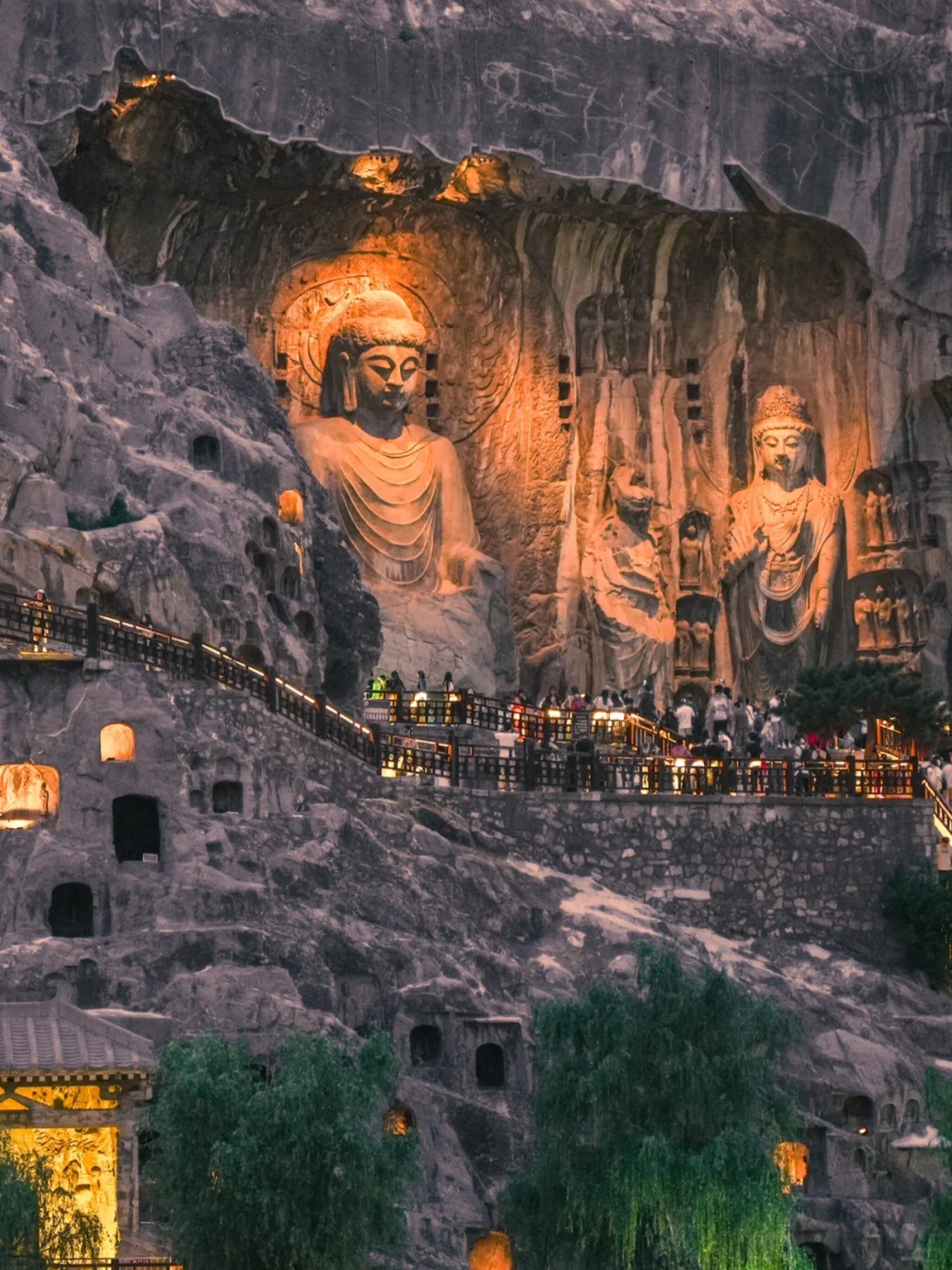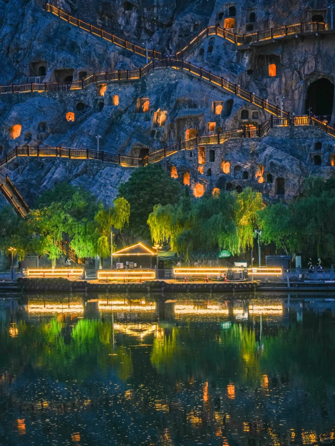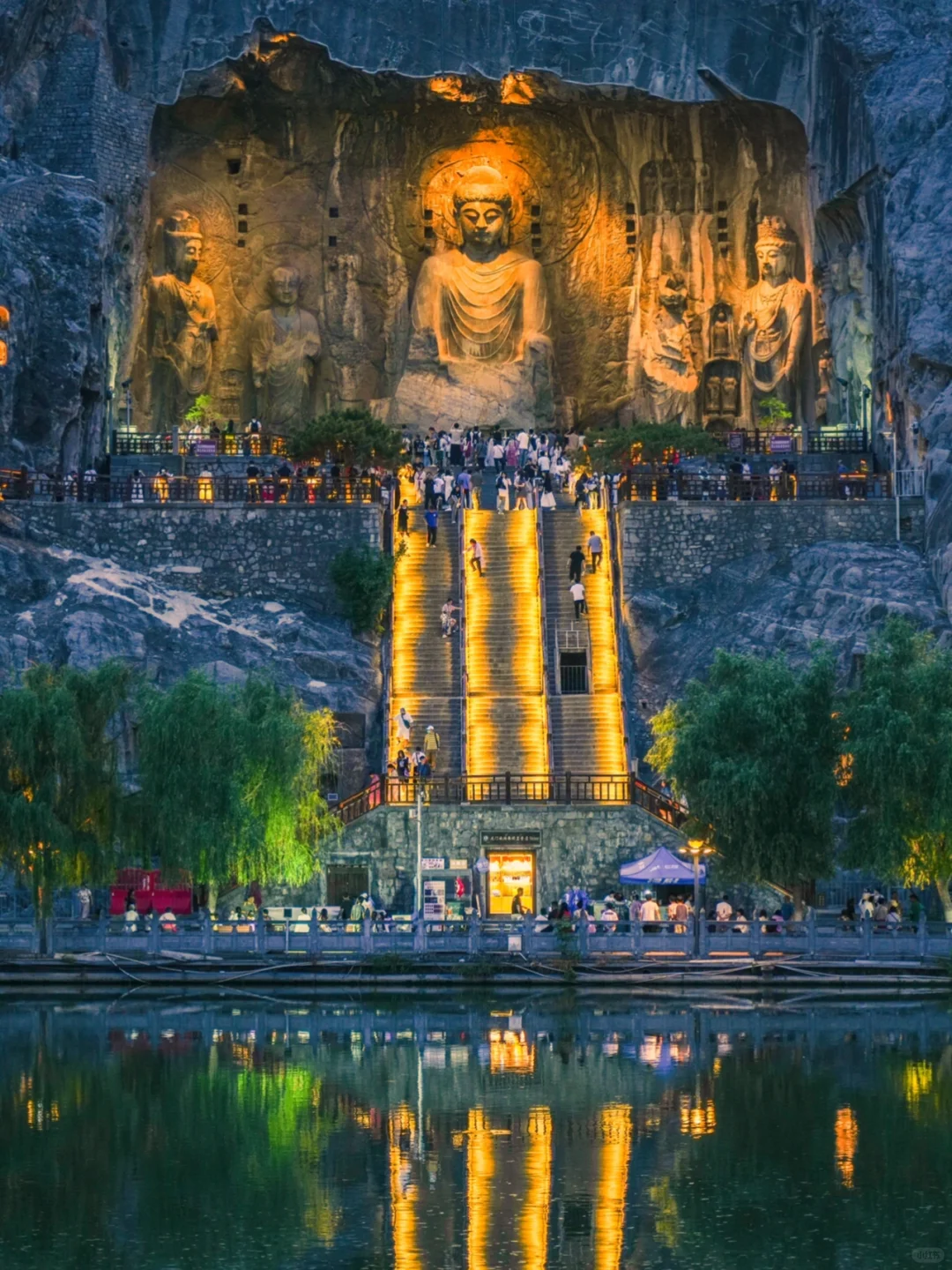➊龙门石窟夜景的龙门石窟真的太震撼了!一生必看系列,最佳拍照机位是最大石窟对面的观景台
