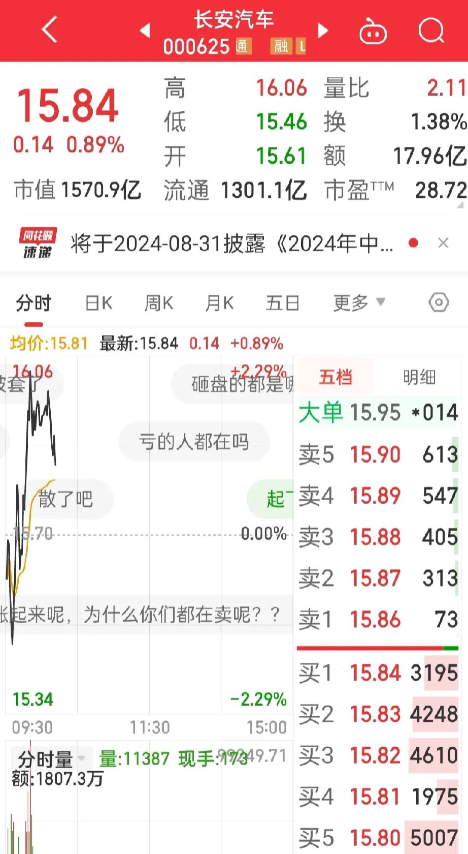 长安汽车, 太出其不意了,昨天委托的15.68元没有成交啊! 今早没有及时跟进,呼呼的大涨, 哎哟哟! 终于和大盘对着干, 看来这次又要追高了, 刚委托15.94元,心态又不稳了,已经上车了, 早上更好的机会,15.58元为什么不买呢? 真是服了长安汽车, 下午该不会直接跳水吧? 愿赌服输! 零跑C16于6月28日正式上市,售价15.58万元起,是LEAP 3.0技术架构的旗舰之作,定位超舒适智能6座SUV,为用户提供6大价值。 空间层面,舒适层面 豪华层面,智能层面, 驾乘层面,安全层面, 8295智舱芯片+后排吸顶娱乐屏+Orin X芯片+激光雷达,智能座舱和智能驾驶顶尖硬件全部堆在C16上。 纯电全域800V碳化硅高压快充平台,从30%充到80%只要15分钟;纯电增程双动力,增程续航1095km+;底盘质感好,驾乘舒适。 满足你对爱车的所有需求! #零跑C16爆火的秘密# #股市分析#
