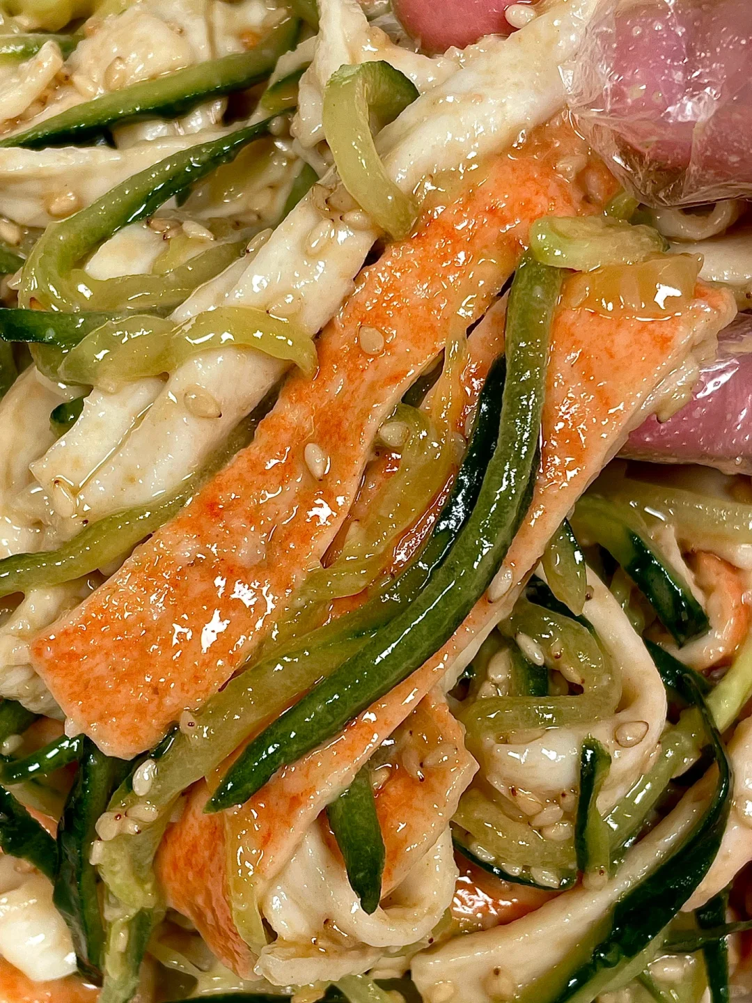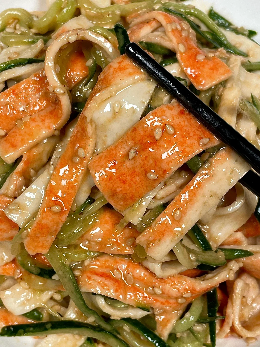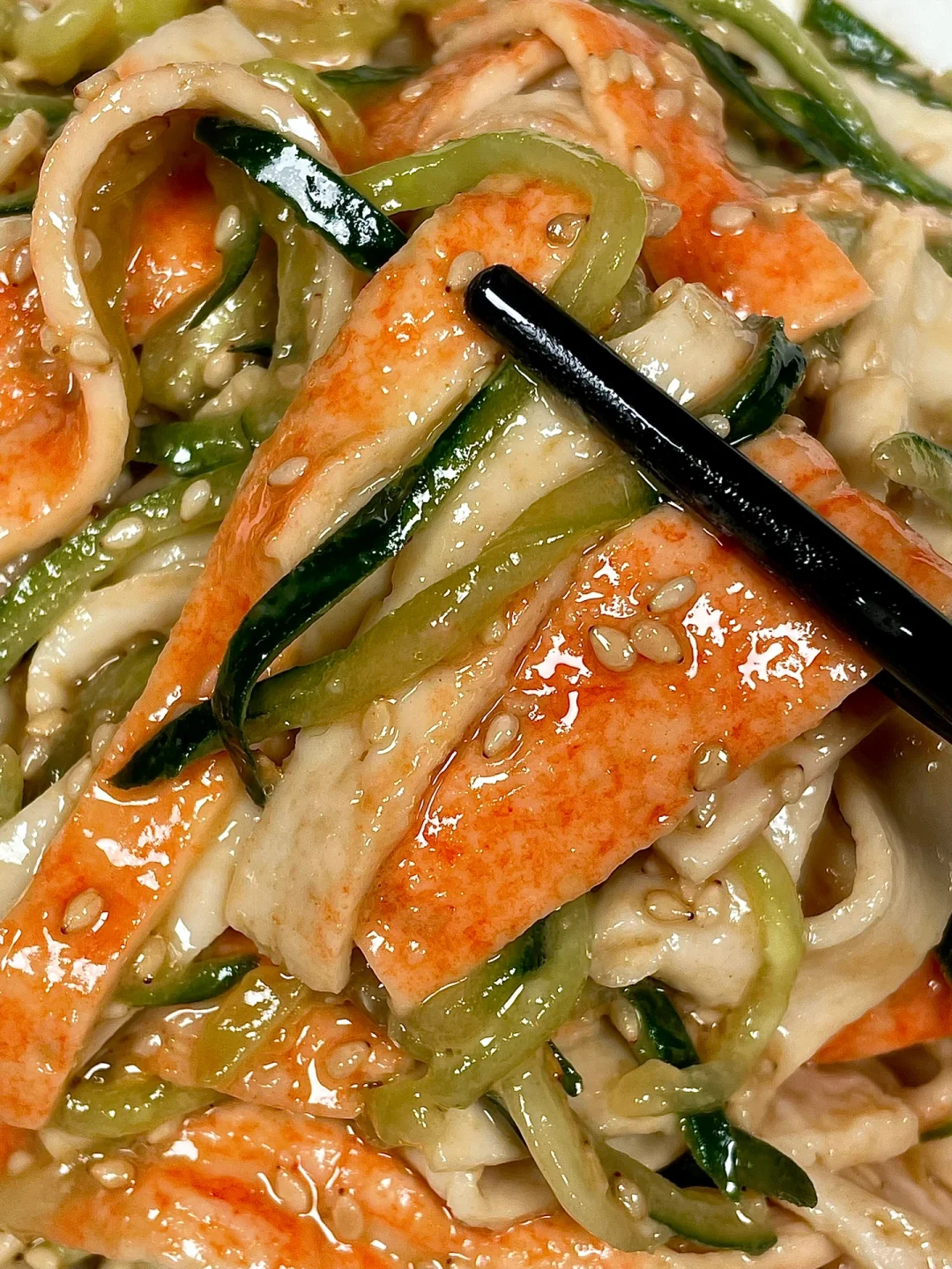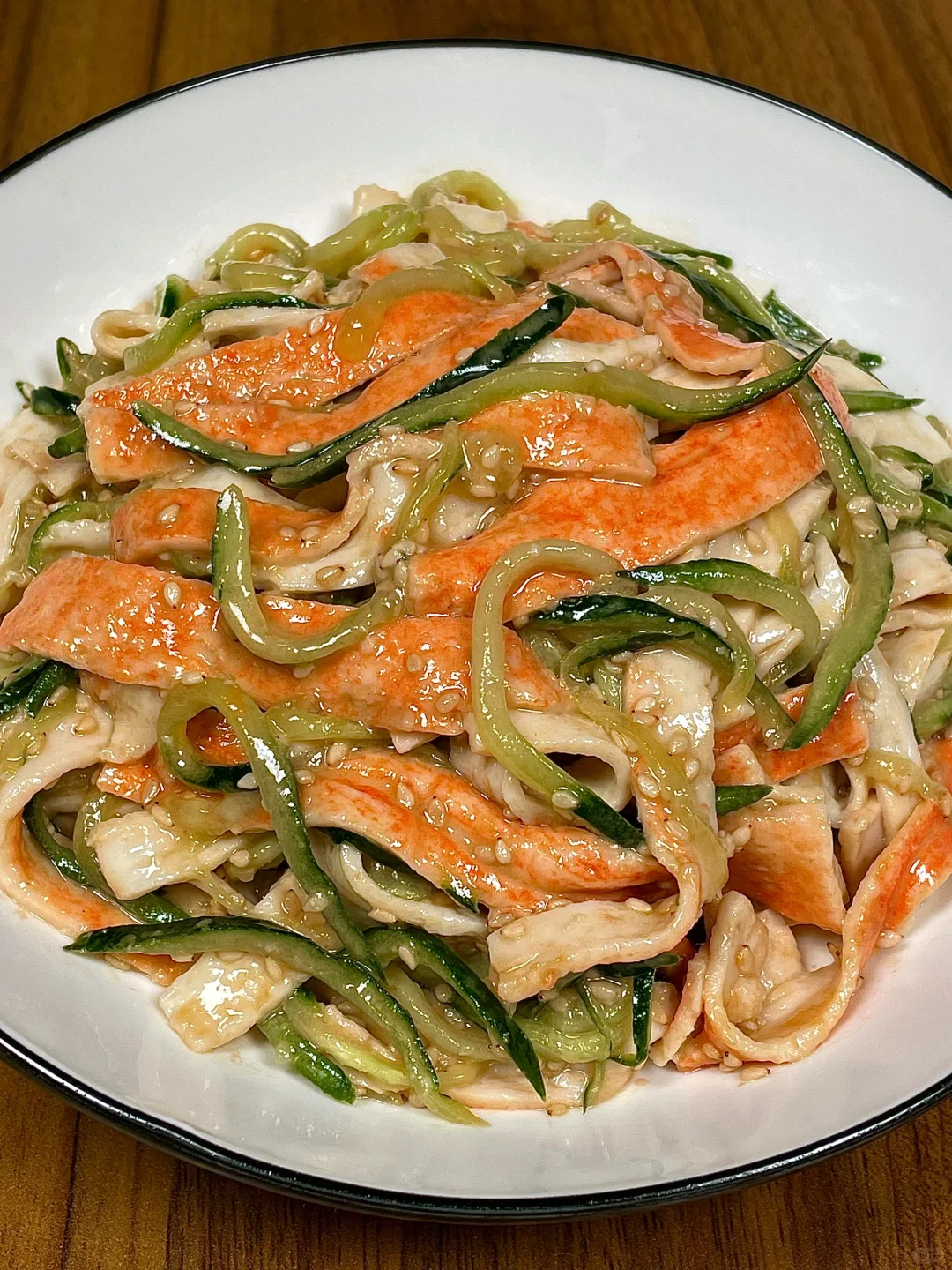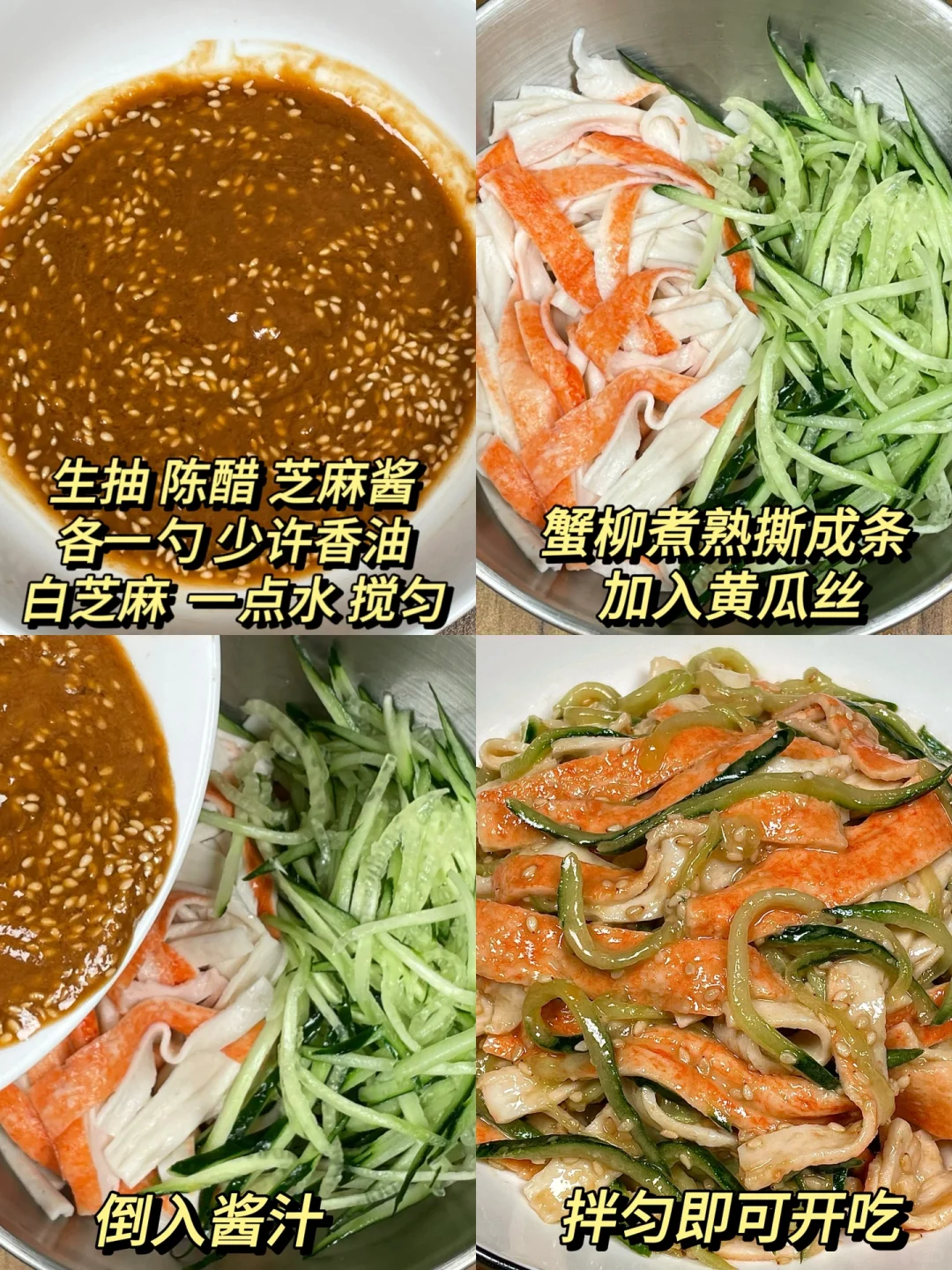 鲜美爽口的蟹柳拌黄瓜!这么做巨好吃[色色R] 蟹柳鲜香嫩滑,黄瓜清脆解腻,裹上芝麻酱香得嘞[黄金薯R]做法简单,一定要试试!! [向右R]食材:蟹柳➕黄瓜 [向右R]做法:如图所示!