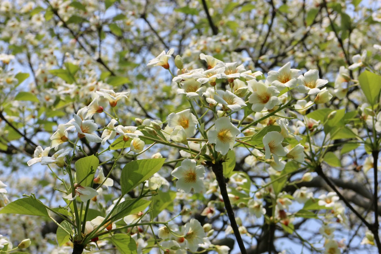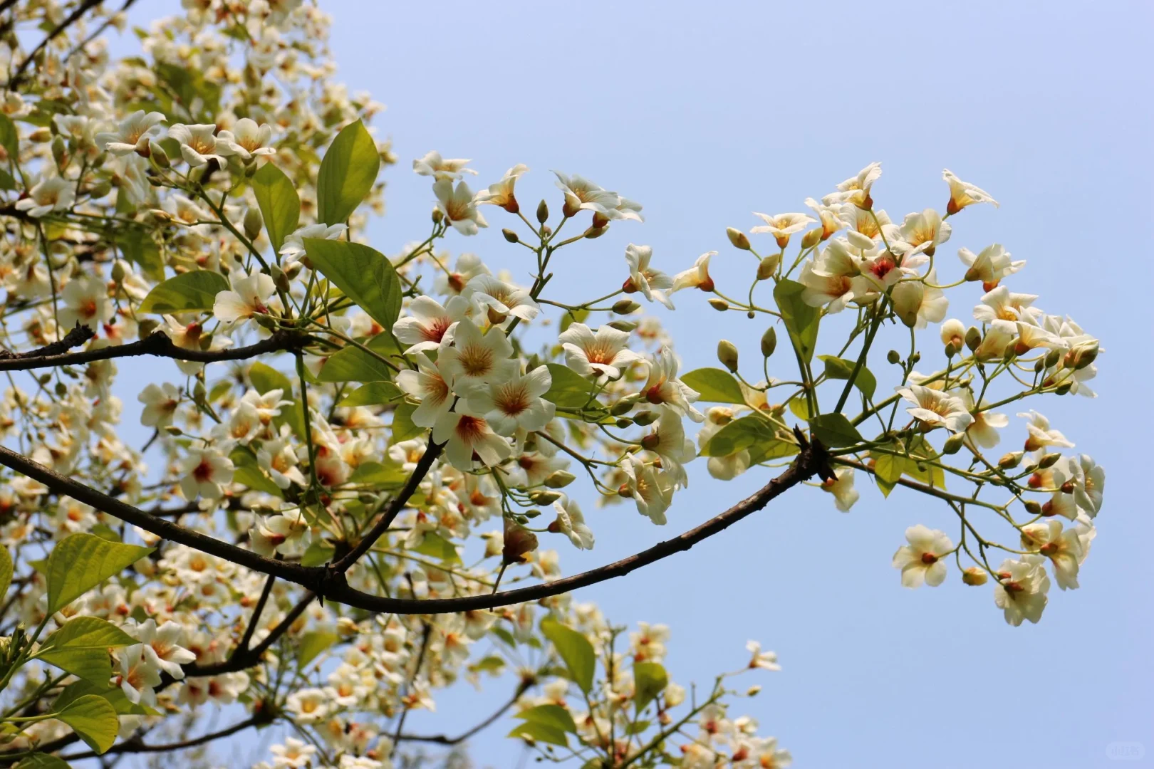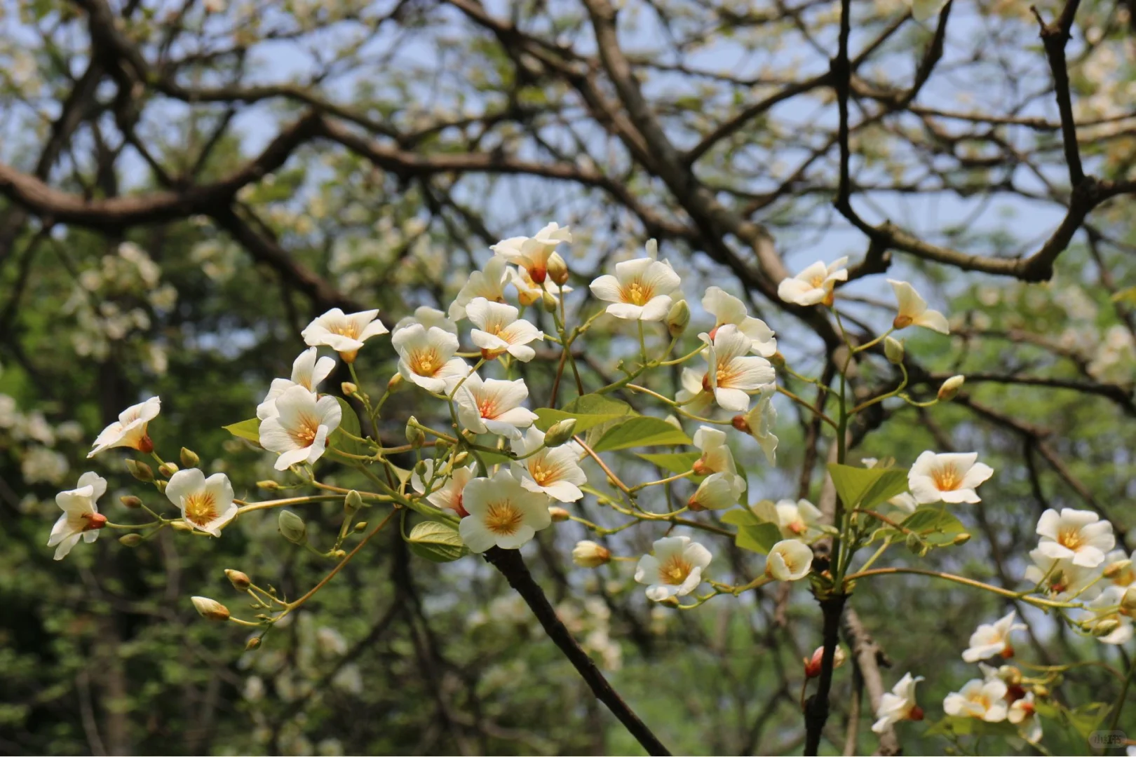 每到暮春时节,桐花整树整树地盛开,远远望去仿佛一幕幕雪瀑;靠近端详,那一朵朵五瓣小花晶莹洁白,红黄色的花蕊点缀其中,娟秀而雅致,散发淡淡香气。油桐花的花语是“情窦初开”,它寓意着纯真无暇的爱情和美好的初恋。在许多文学作品中,油桐花都被用来描绘青涩的爱情和美好的青春时光。