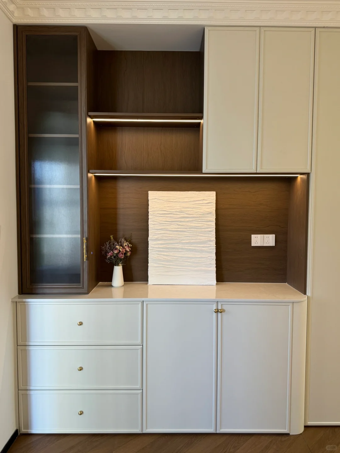 整体设计风格,较为混搭,融合了复古、现代、法式、中古等多重元素[okR],地面铺设600×1200mm规格的木纹瓷砖,墙顶结合处采用虎头造型石膏线条装饰,全屋通刷乳胶漆,柜子采用白色➕胡桃木色……,落地效果多元又丰富,静谧又温馨[彩虹R]