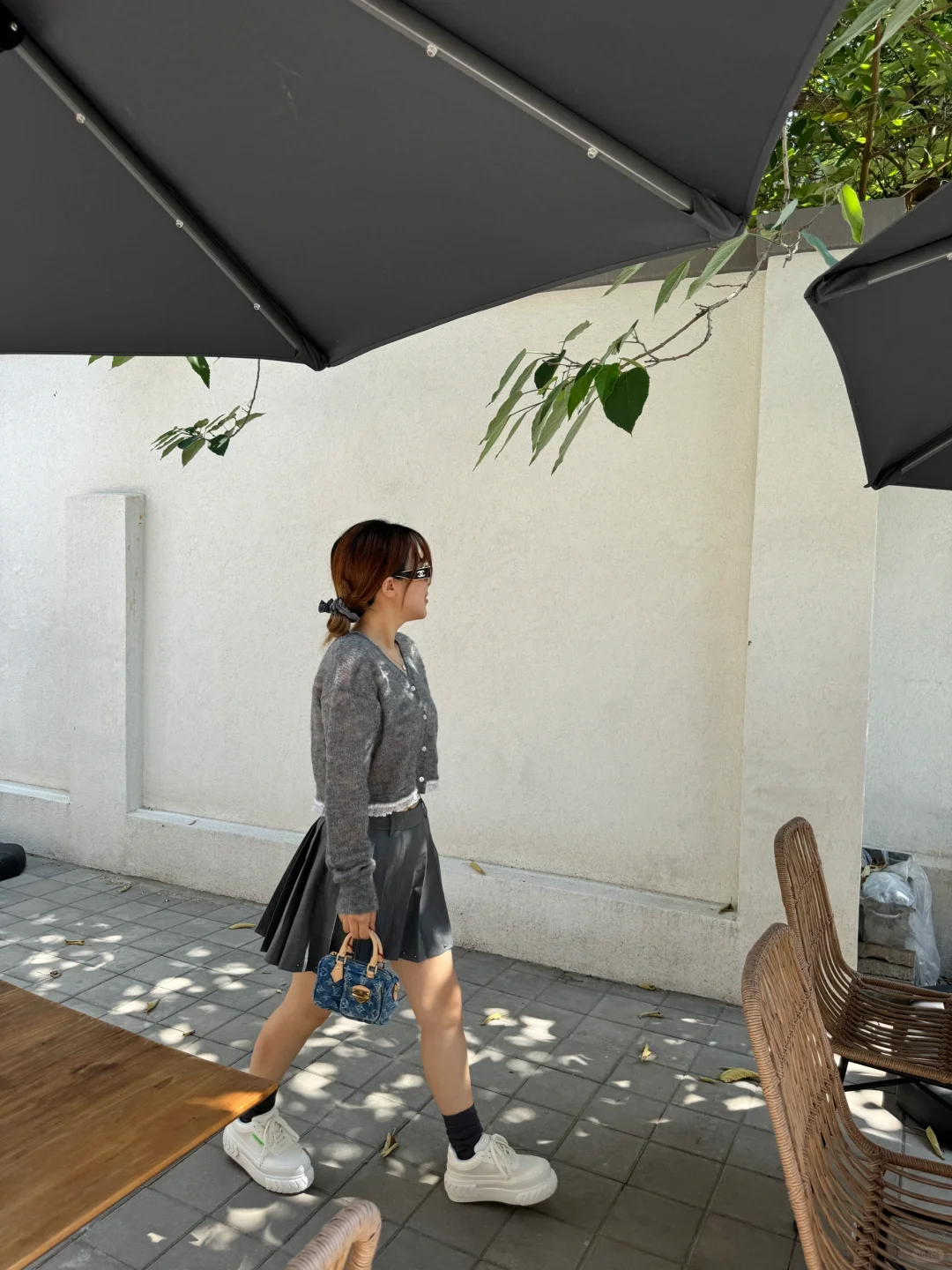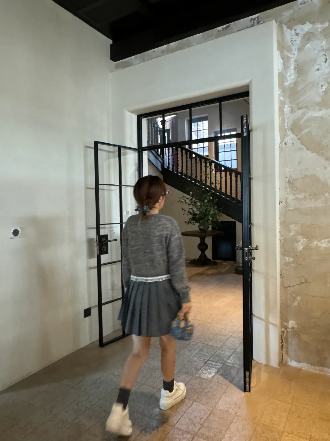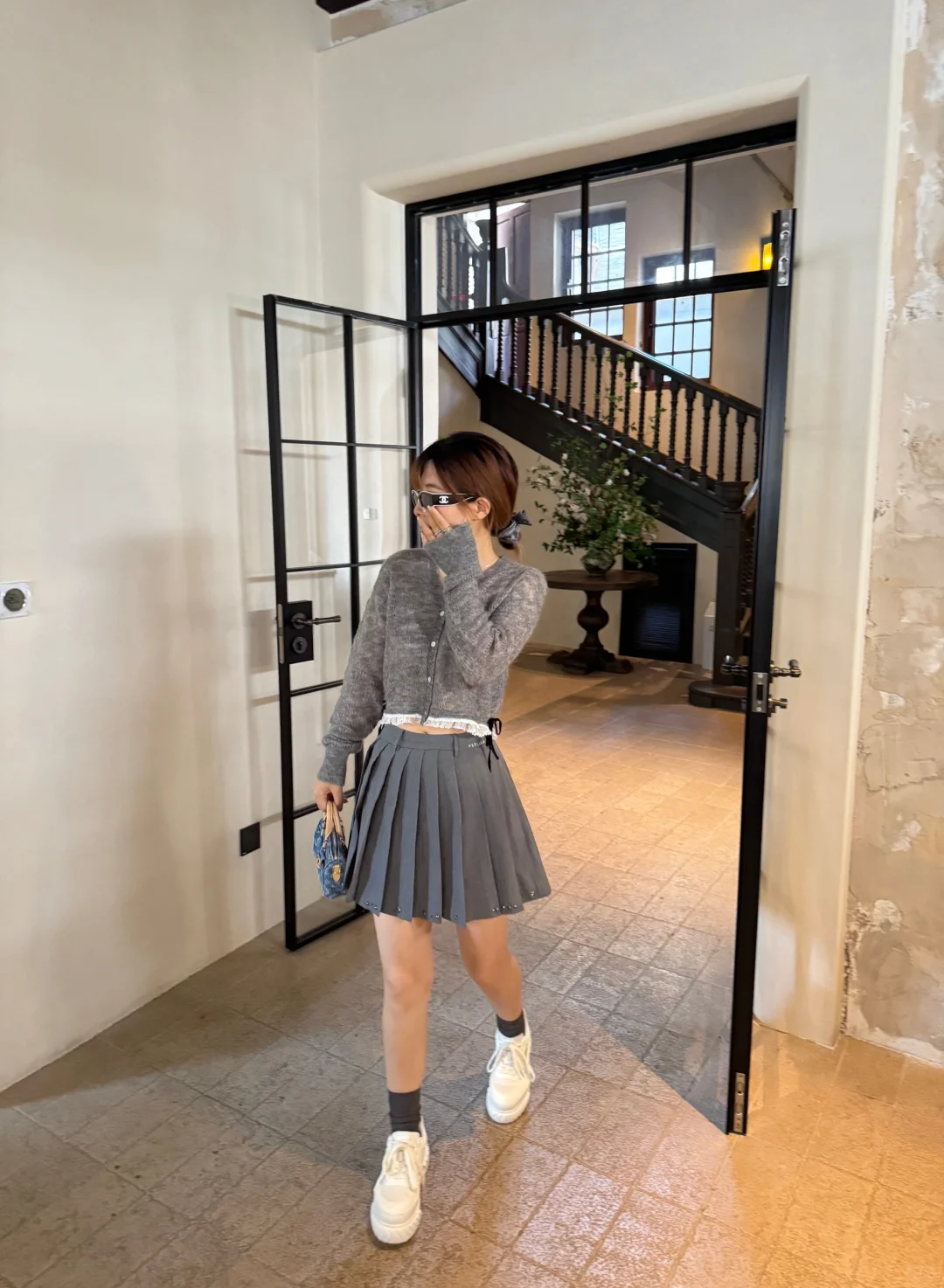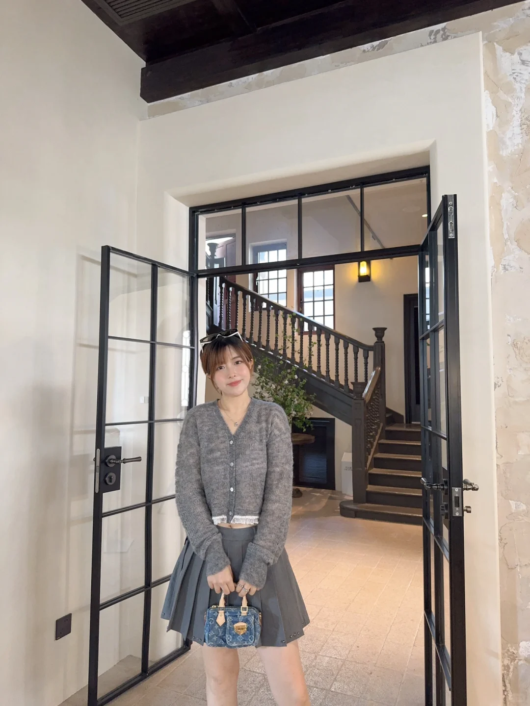 赵今麦粉色毛衣搭配灰色百褶裙,甜美又不失灵动,黑色袜靴为整体增添精致感,是少女